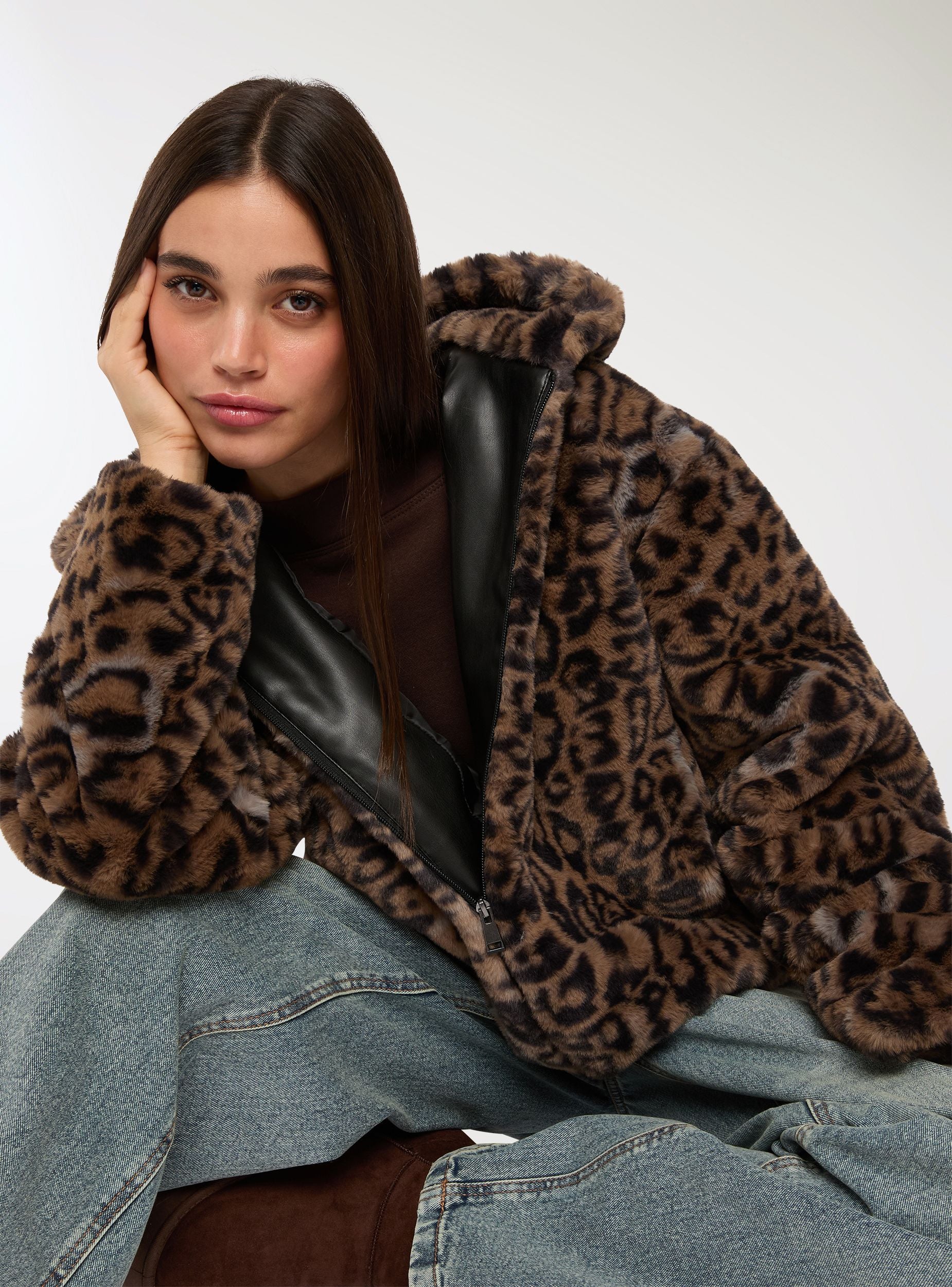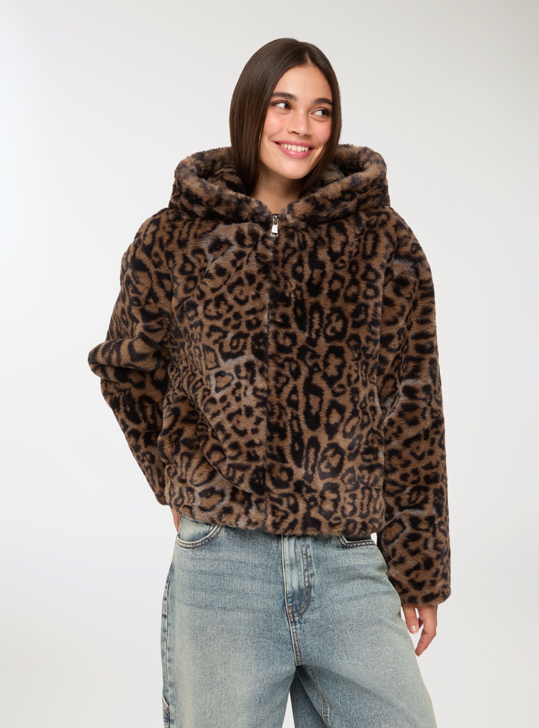 Pelliccia sintetica da donna con cappuccio, caratterizzato da una fantasia animalier che dona un tocco di stile unico. Dotato di chiusura con zip, questo capo spalla corto offre una vestibilità comoda e versatile, ideale per completare outfit casual o urbani. Perfetto per aggiungere un elemento di tendenza al guardaroba, si abbina facilmente a jeans o pantaloni per un look moderno e accattivante.