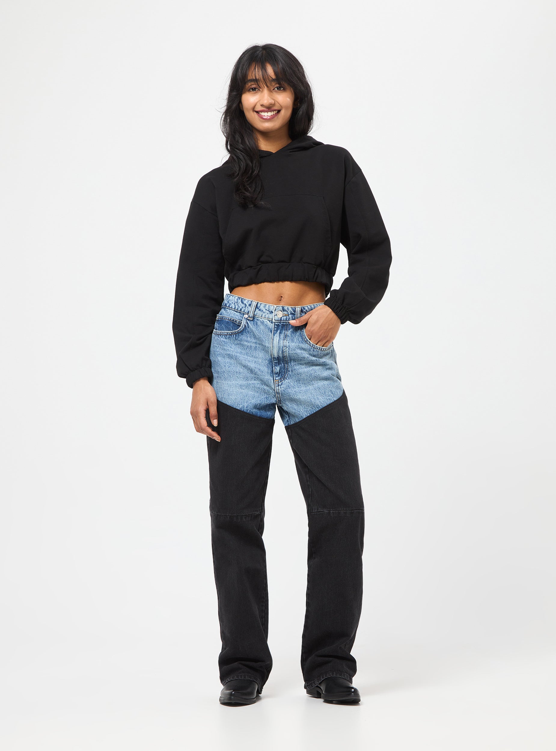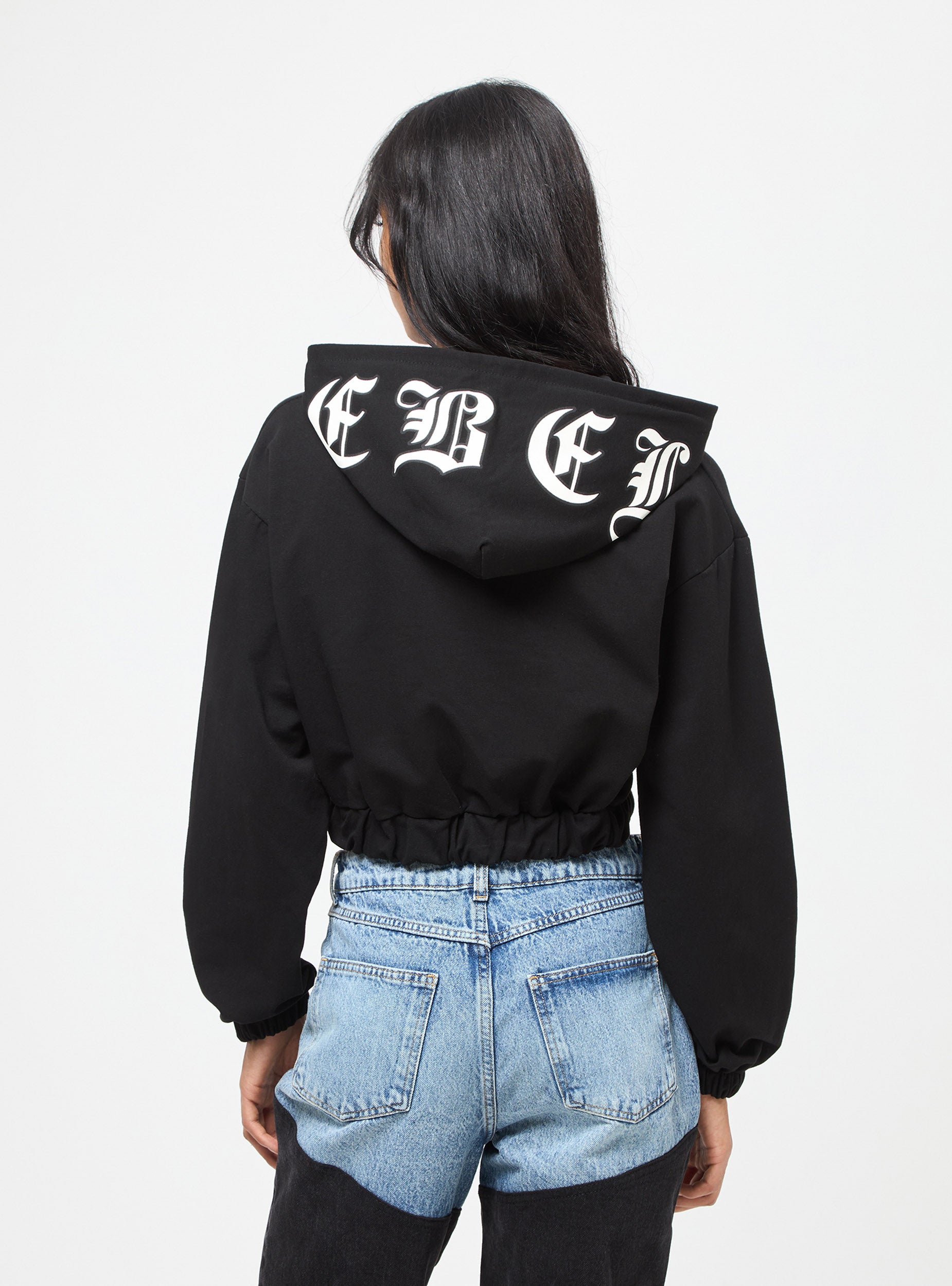 Felpa crop da donna in tessuto pesante. Tasca a marsupio frontale. Cappuccio con scritta. La modella è alta 1,70 e indossa la taglia S.Dettagli
