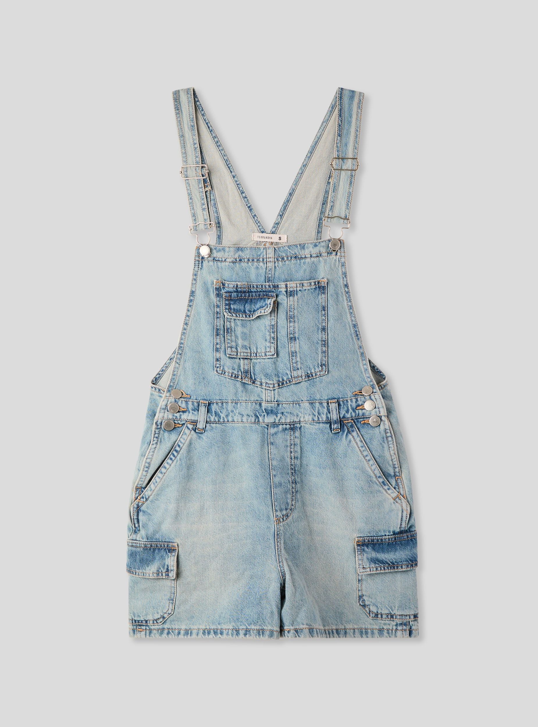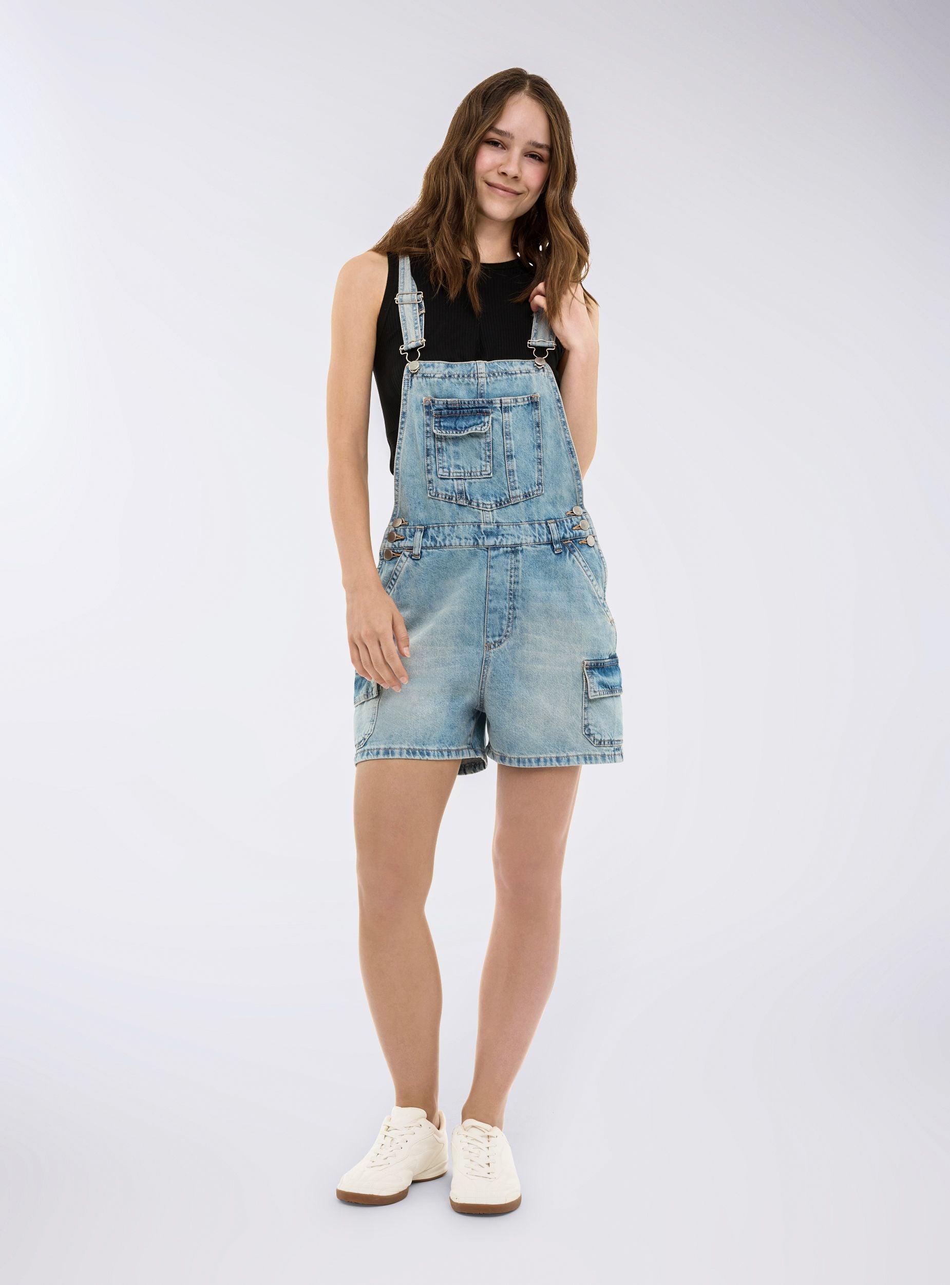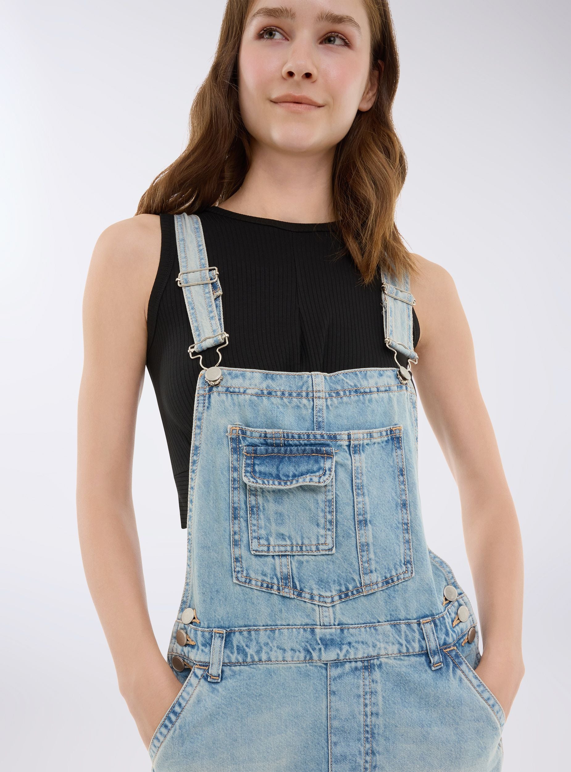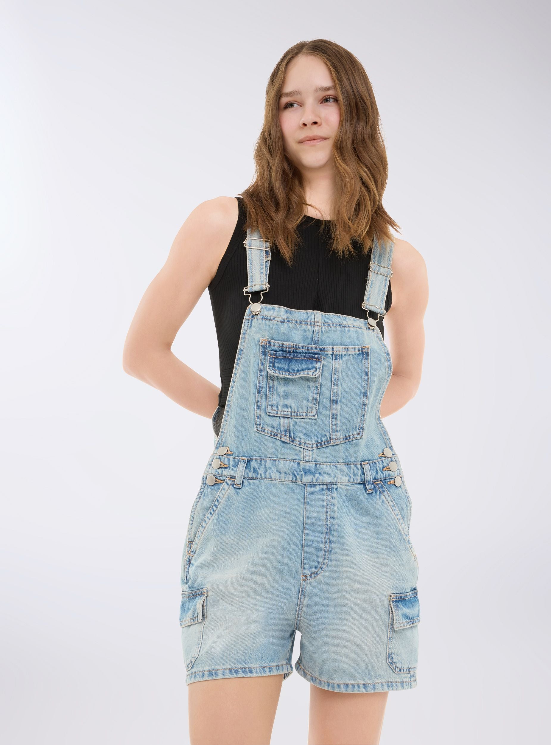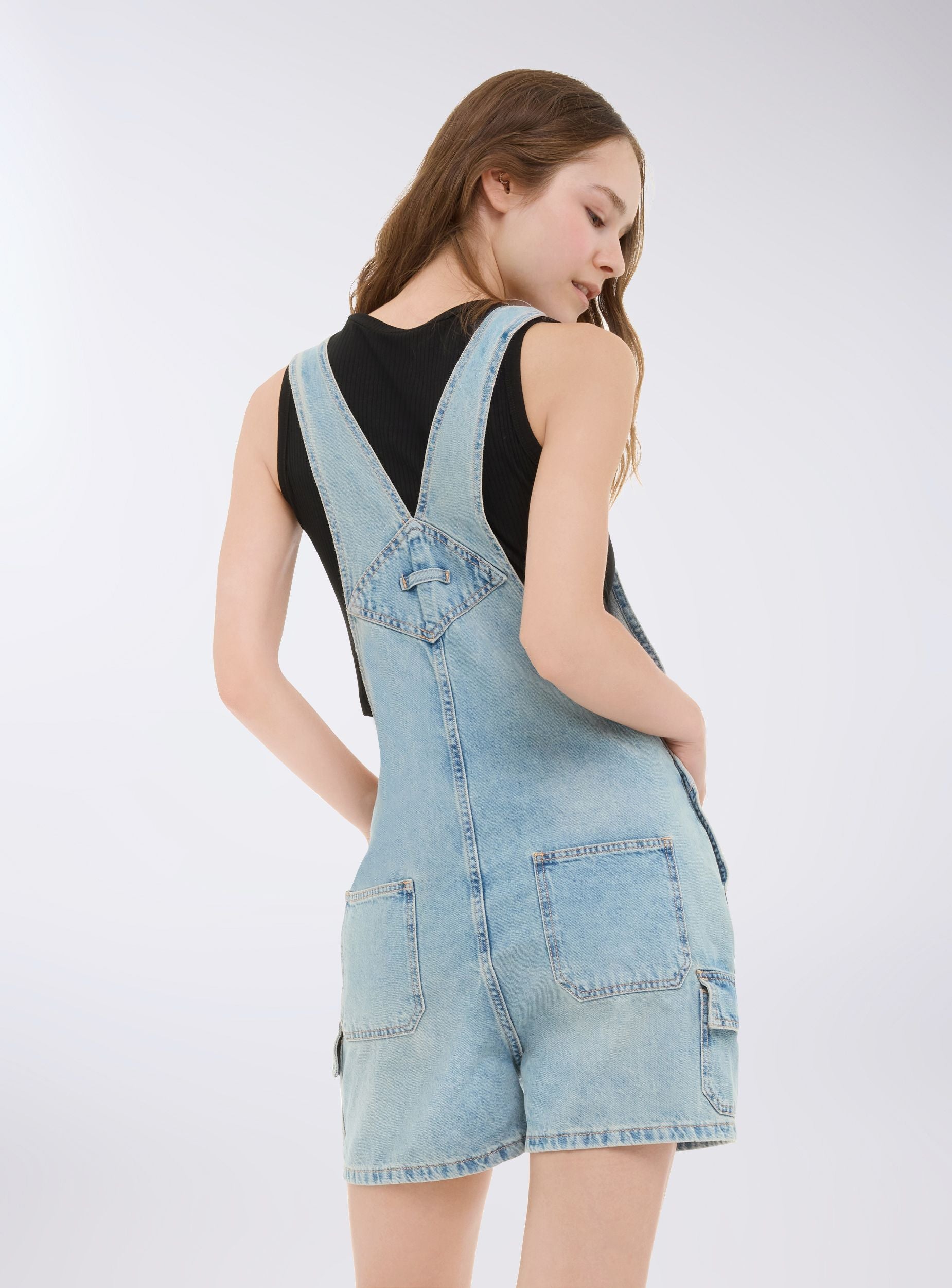 Salopette da donna in denim, ideale per un look casual e versatile. Presenta bretelle regolabili e una chiusura con bottoni, con tasche funzionali sul davanti e sui lati. Perfetta per abbinamenti con magliette e sneakers, adatta per giornate informali o passeggiate all'aperto. Design tinta unita che si presta a molteplici combinazioni di stile.