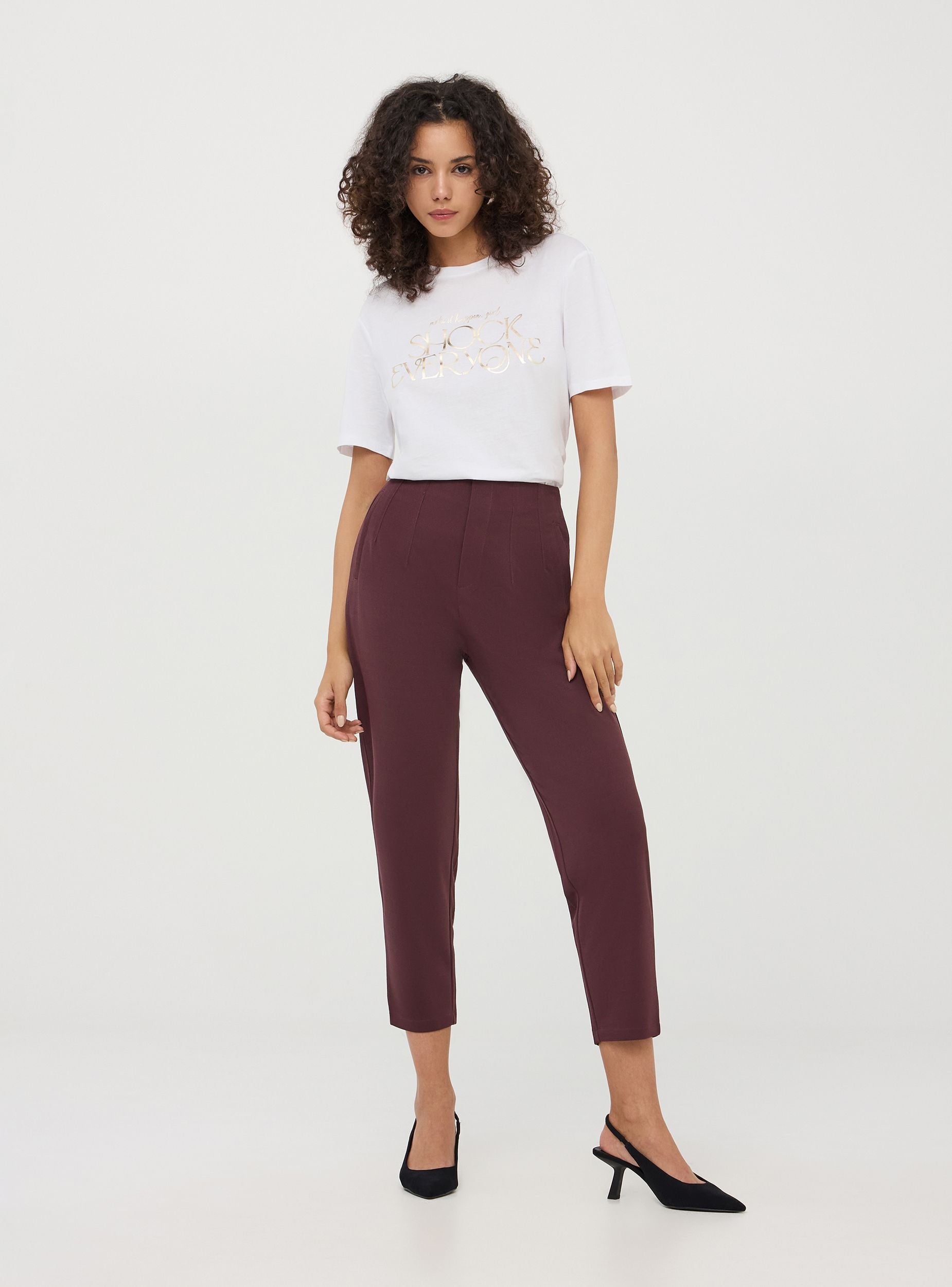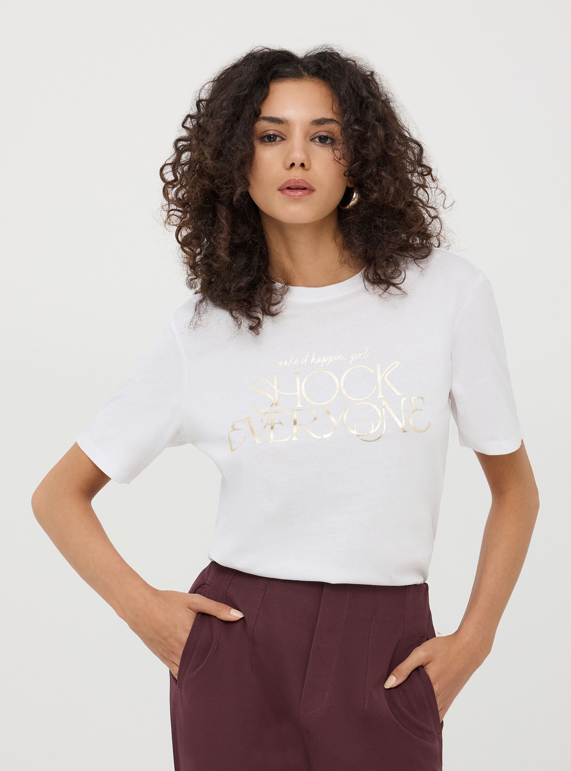 Maglietta da donna con scritta laminata frontale, girocollo e maniche corte. Vestibilità ampia per un look casual e alla moda. Perfetta per un outfit quotidiano.Dettagli