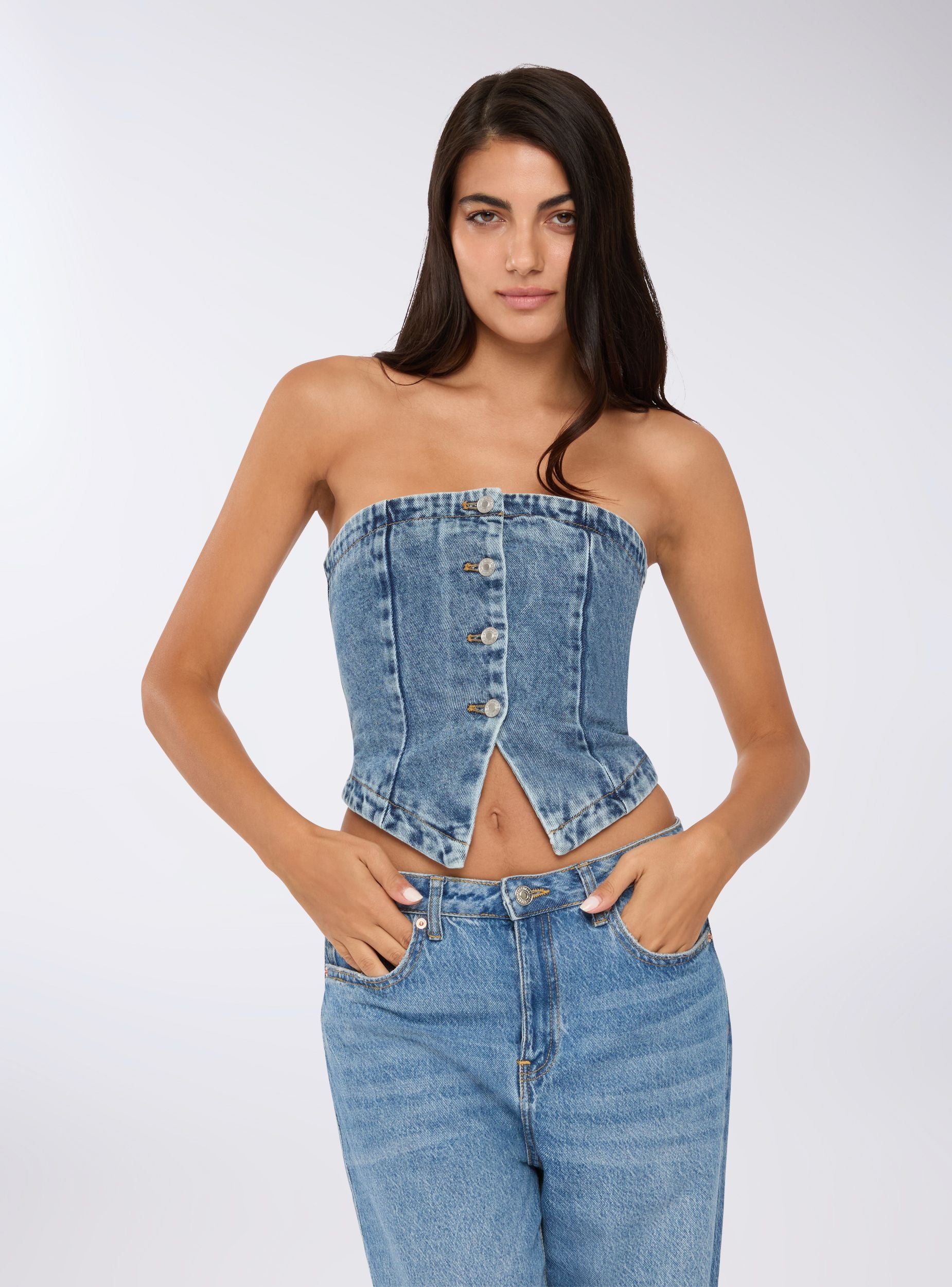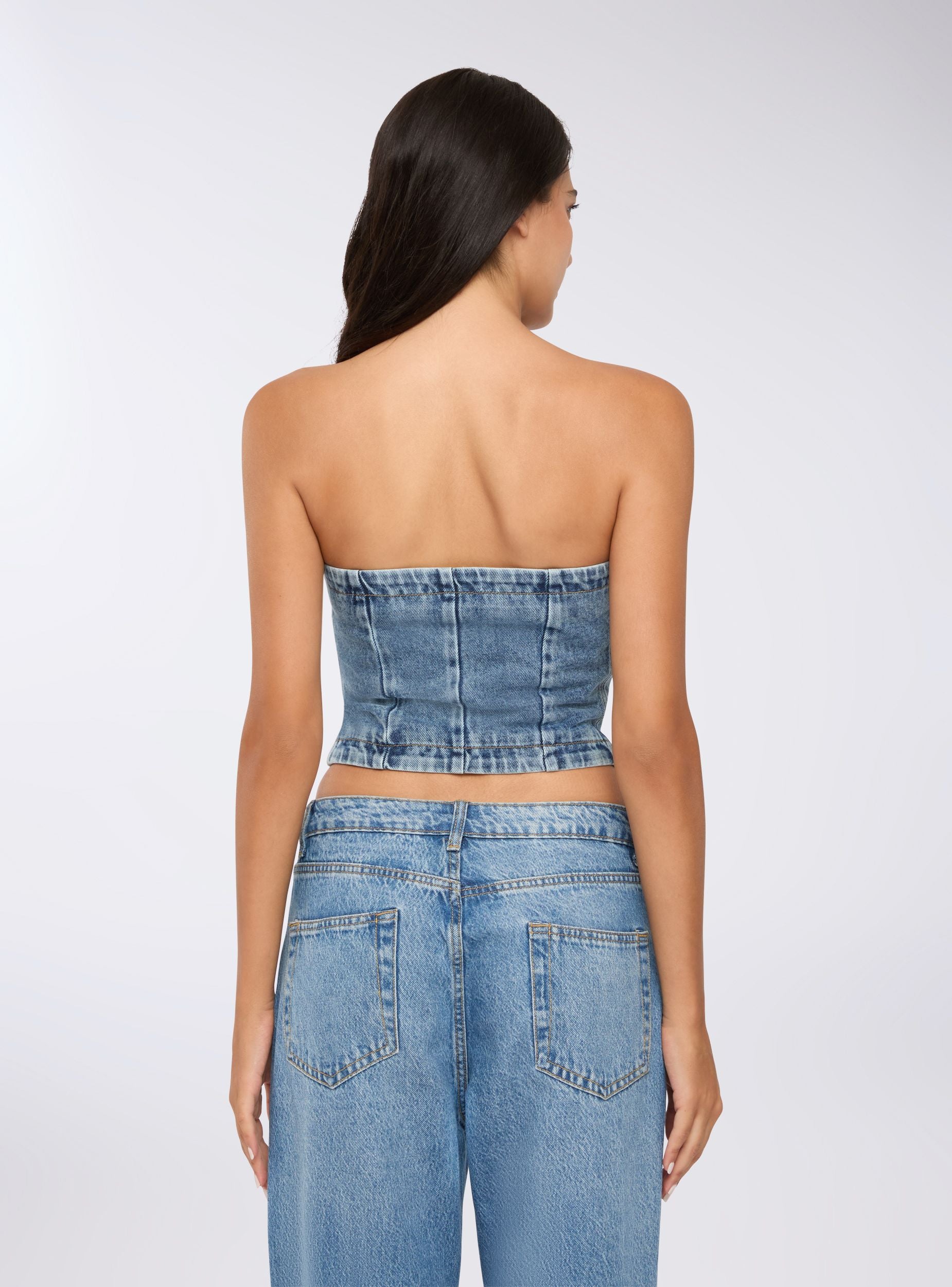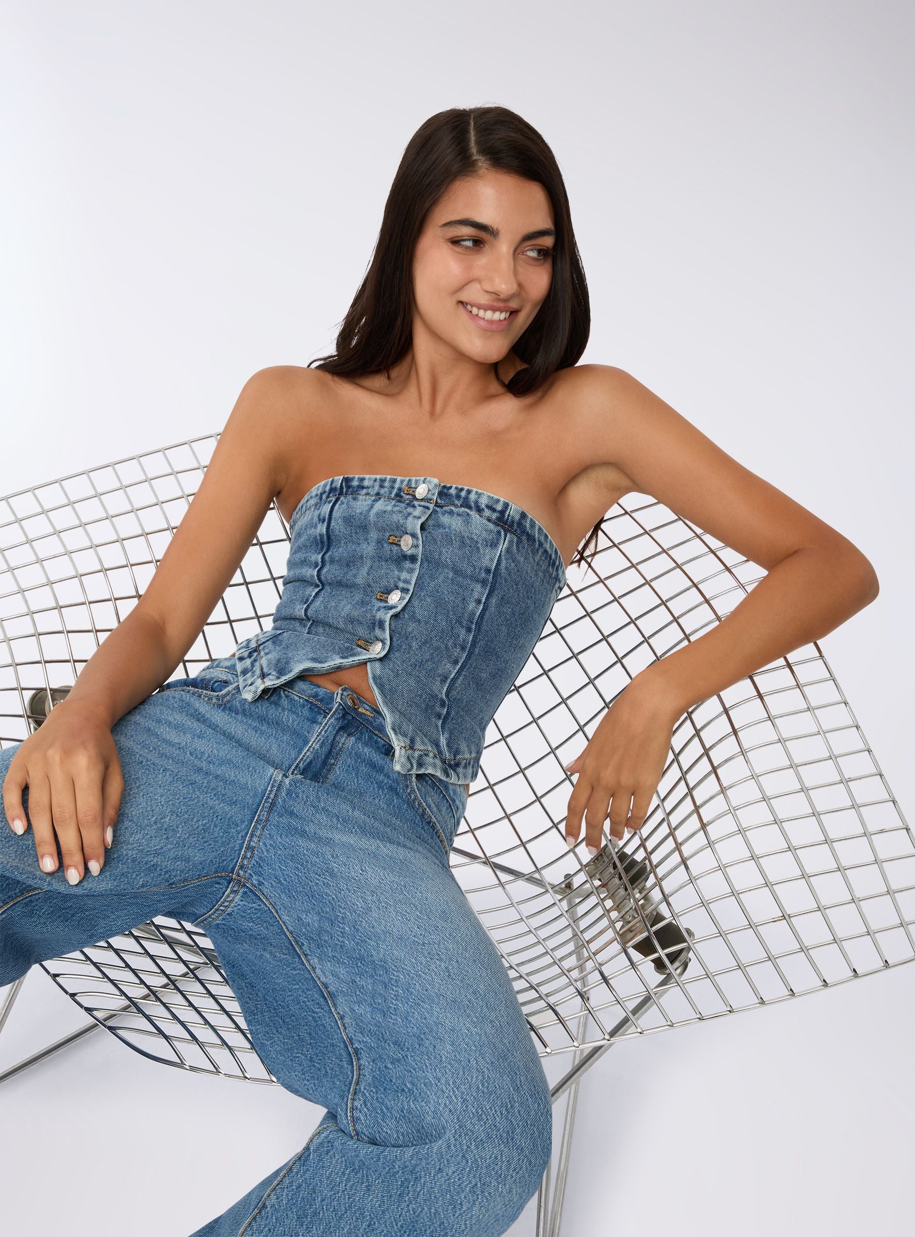 Top in denim da donna, modello a fascia con bottoni, ideale per un look casual e alla moda. Perfetto da abbinare a jeans o pantaloni a vita alta per un outfit estivo. Versatile e comodo, si adatta a diverse occasioni, dal tempo libero alle uscite serali.