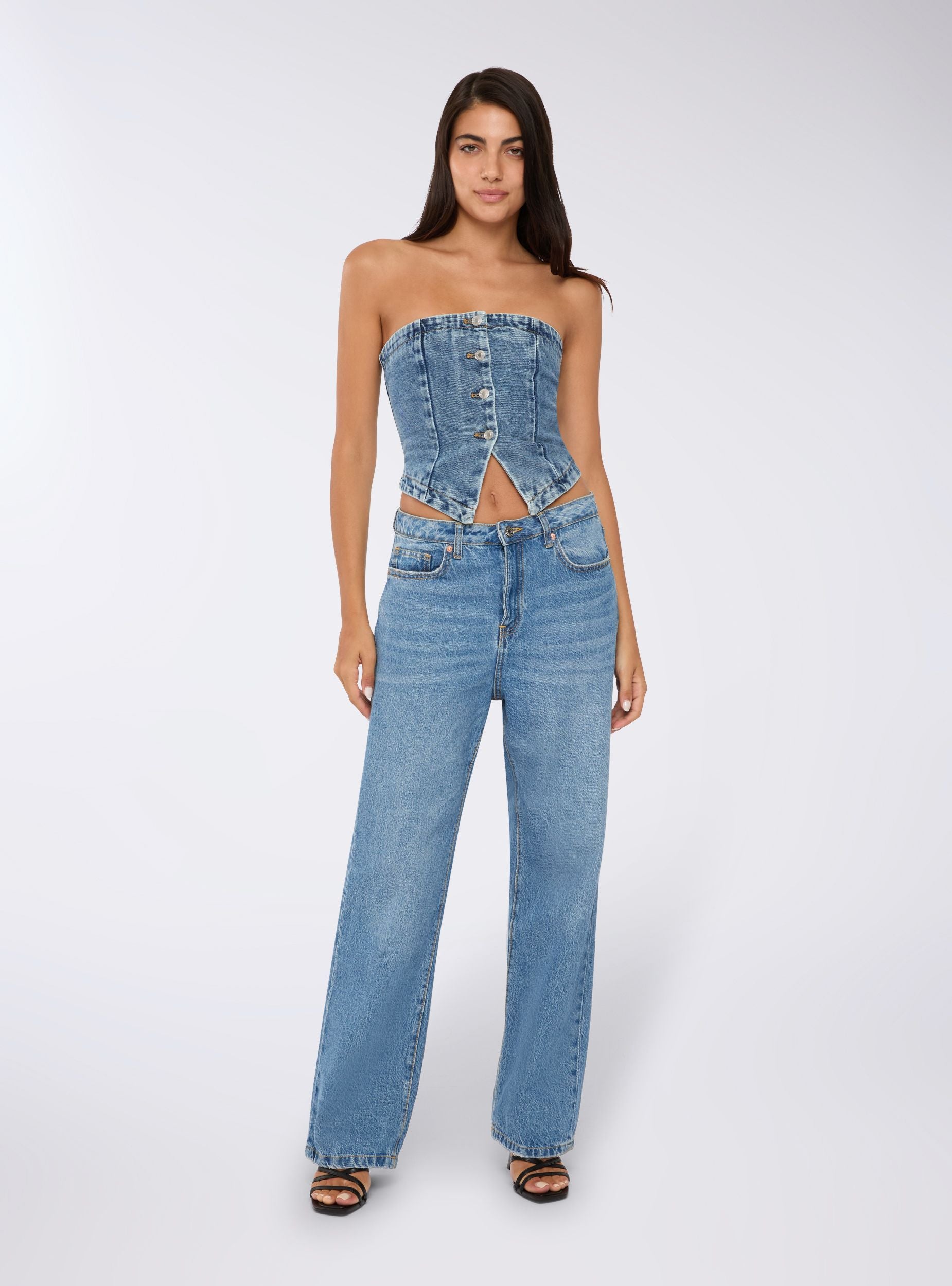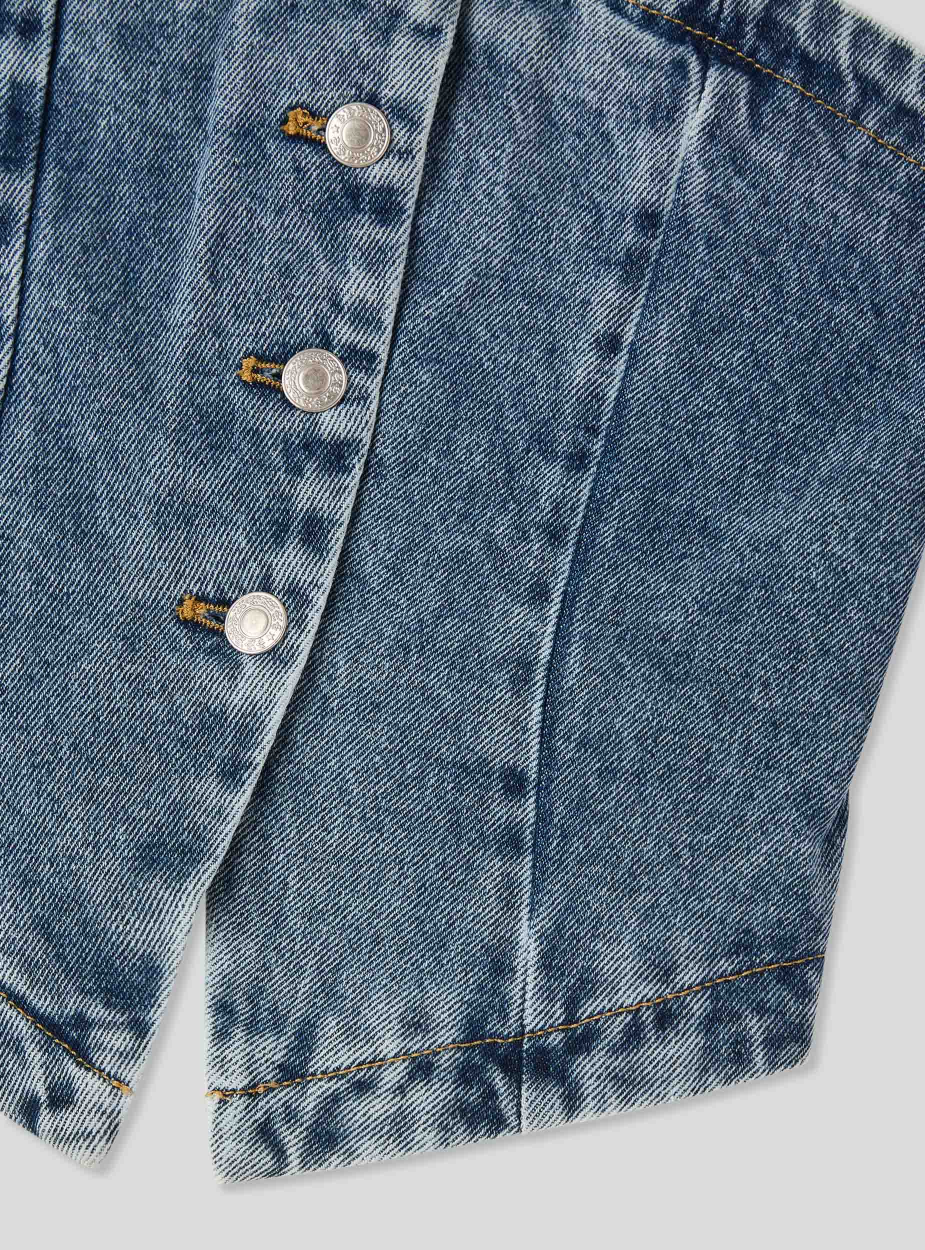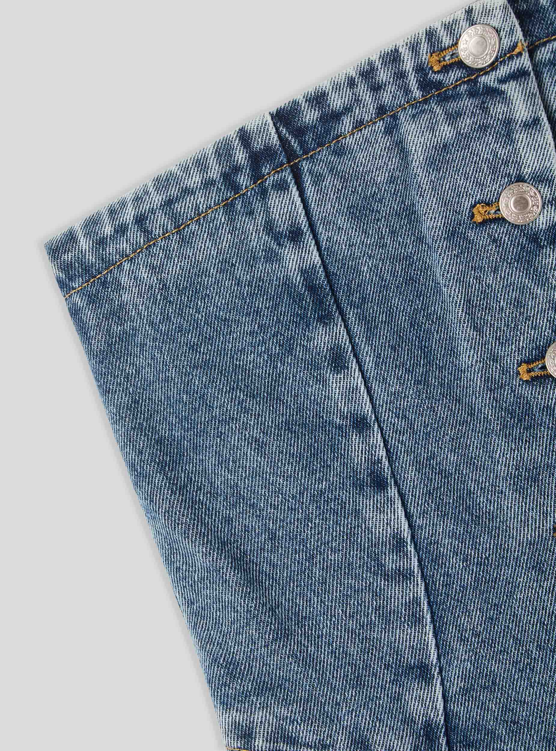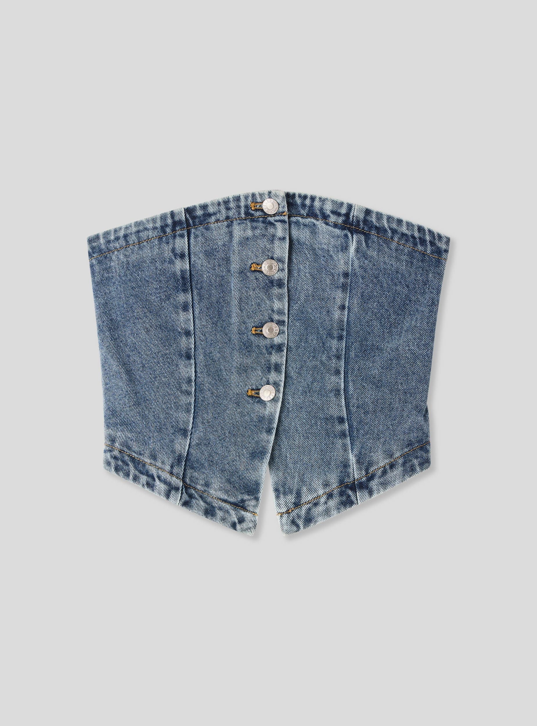 Top in denim da donna, modello a fascia con bottoni, ideale per un look casual e alla moda. Perfetto da abbinare a jeans o pantaloni a vita alta per un outfit estivo. Versatile e comodo, si adatta a diverse occasioni, dal tempo libero alle uscite serali.