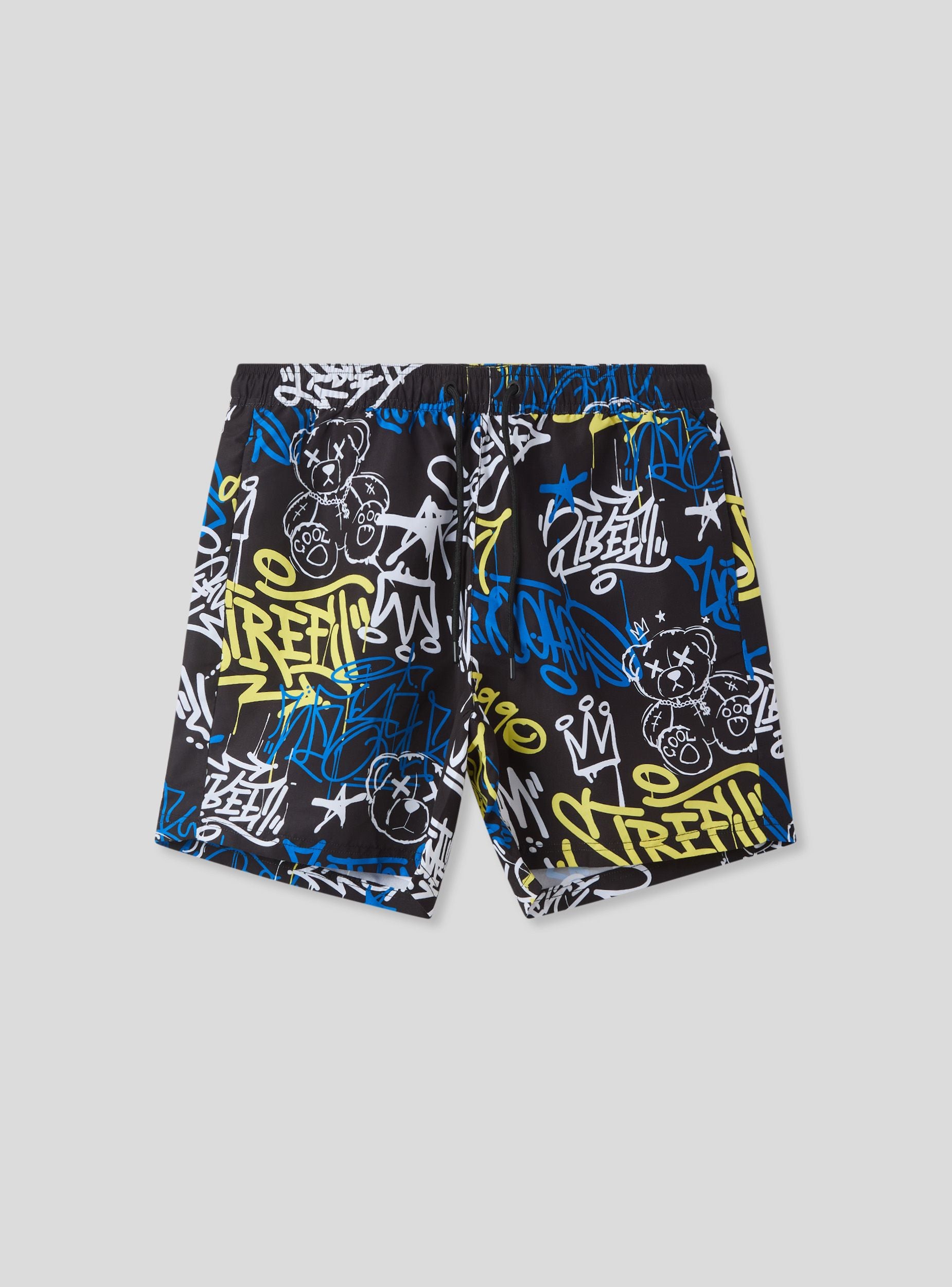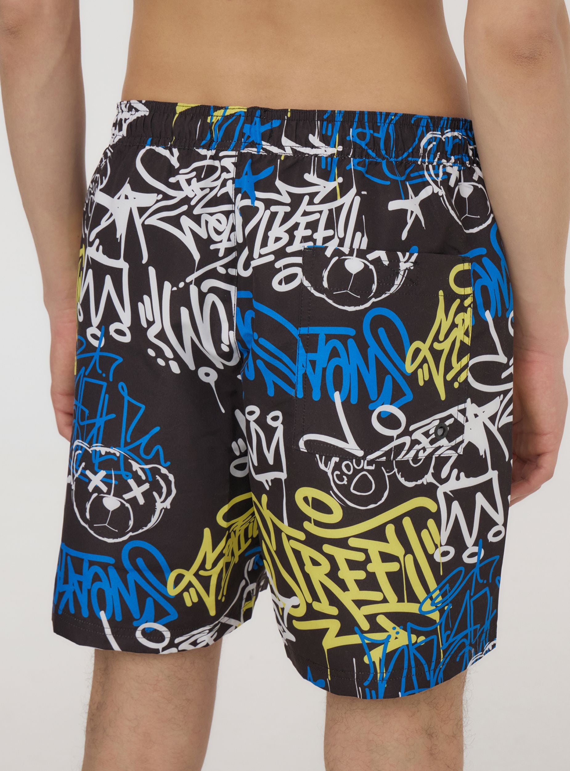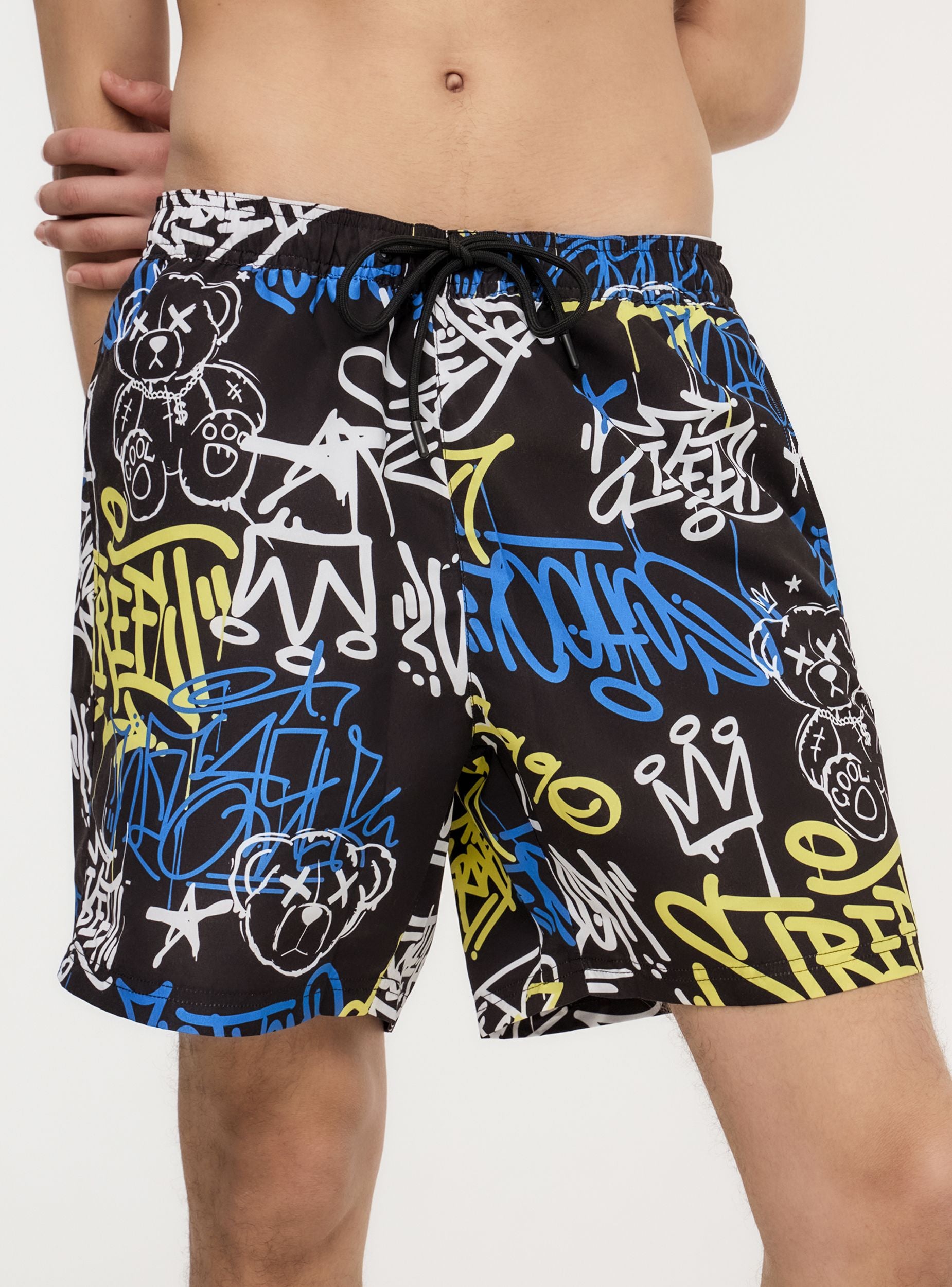 Costume da uomo in stile bermuda con una grintosa fantasia graffiti, perfetto per un look urbano anche in spiaggia. Il design con coulisse regolabile assicura comfort e vestibilità su misura, mentre le tasche laterali e la tasca posteriore con chiusura in velcro lo rendono pratico per ogni occasione. Ideale per chi ama distinguersi, si abbina perfettamente a canotte e infradito per un'estate all'insegna dello stile.