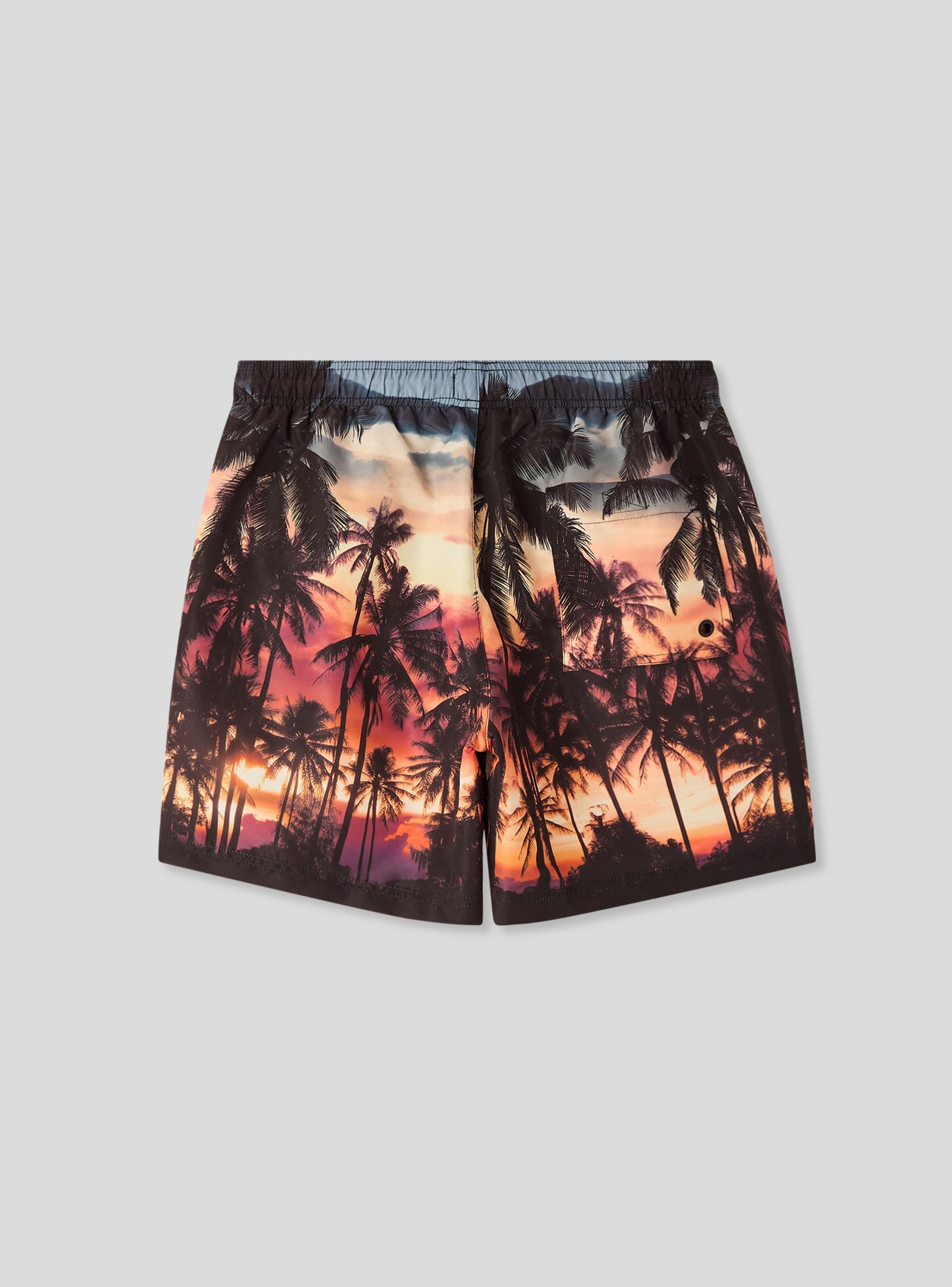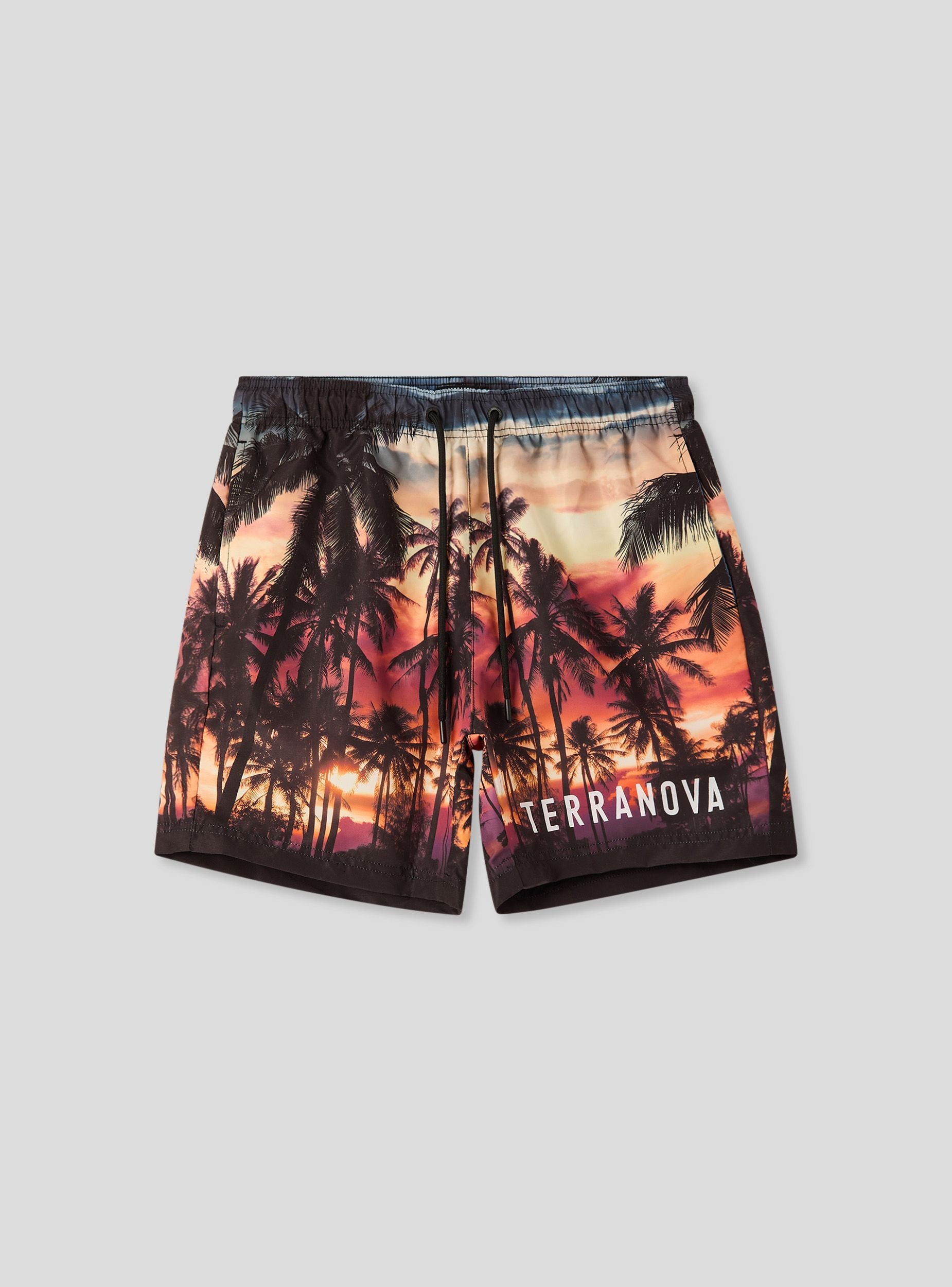 Bermuda mare da uomo con stampa tropicale effetto tramonto e scritta logo laterale a contrasto. Dotato di tasche laterali e coulisse regolabile, si abbina facilmente a t-shirt o canotte per un look estivo dinamico.