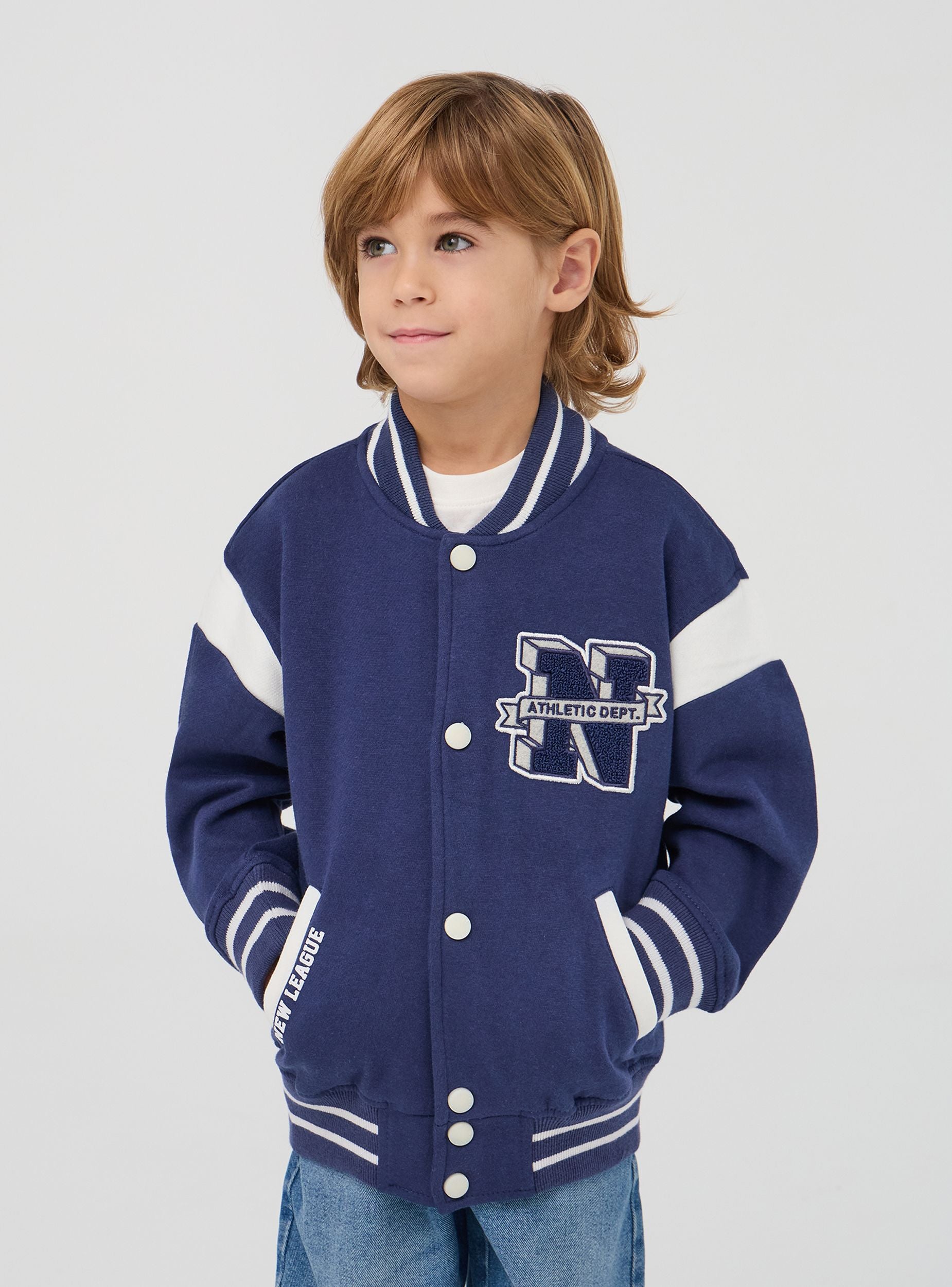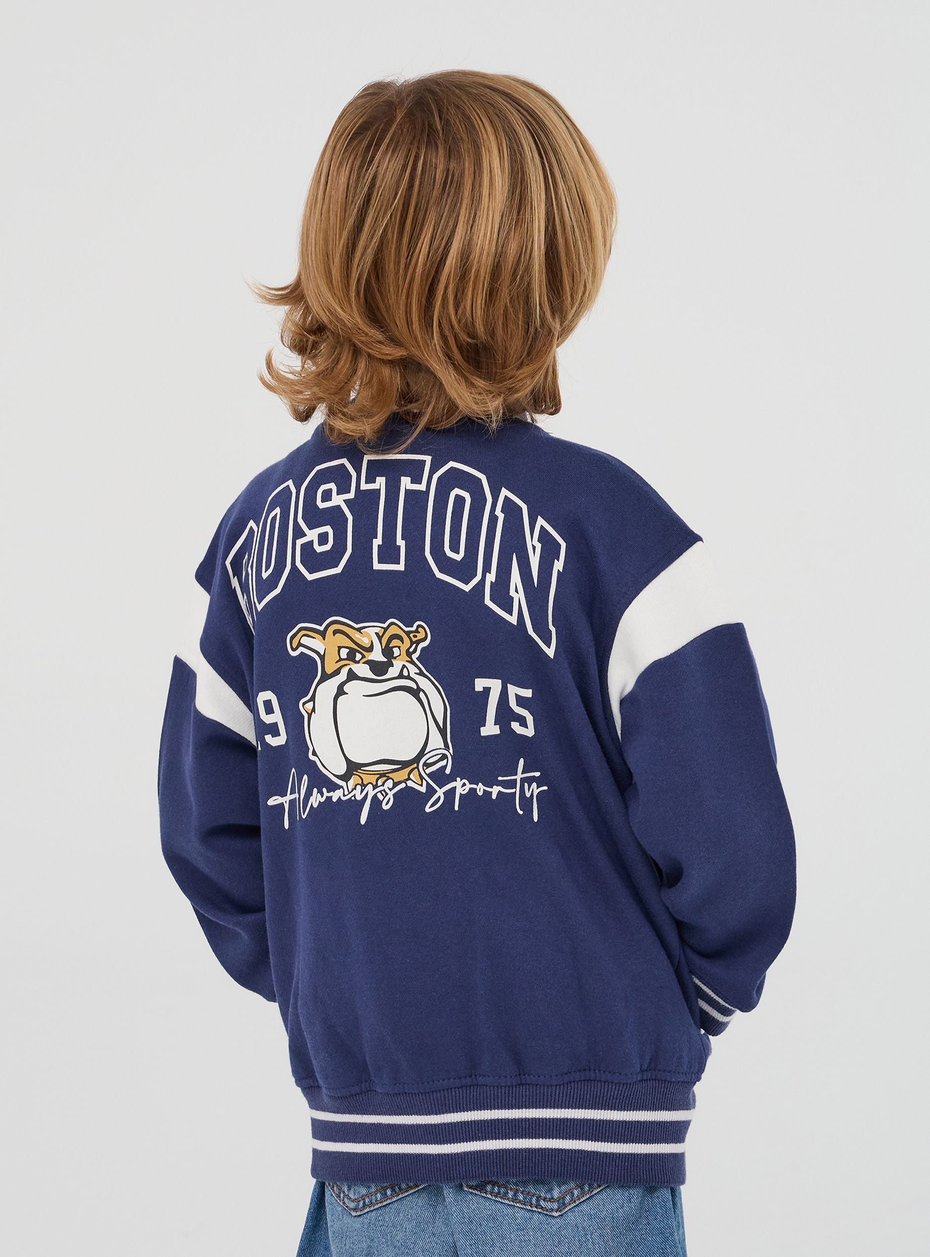 Bomber da bimbo con design ispirato ai college americani. Presenta una grande scritta "Boston" con un bulldog stilizzato e l'anno "1975" sul retro, accompagnata da una scritta decorativa. Sul davanti, è presente un'applicazione con la lettera "N" e una stampa sul lato della tasca. Il colletto, i polsini e il fondo sono a coste con strisce di contrasto. La chiusura è frontale con bottoni a pressione e le tasche sono oblique. Questo capo combina un look sportivo e casual, perfetto per un abbigliamento comodo e alla moda.Dettagli