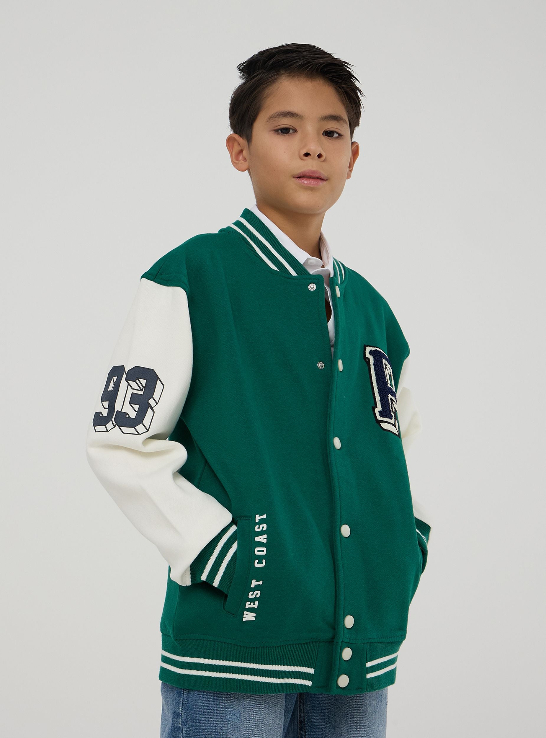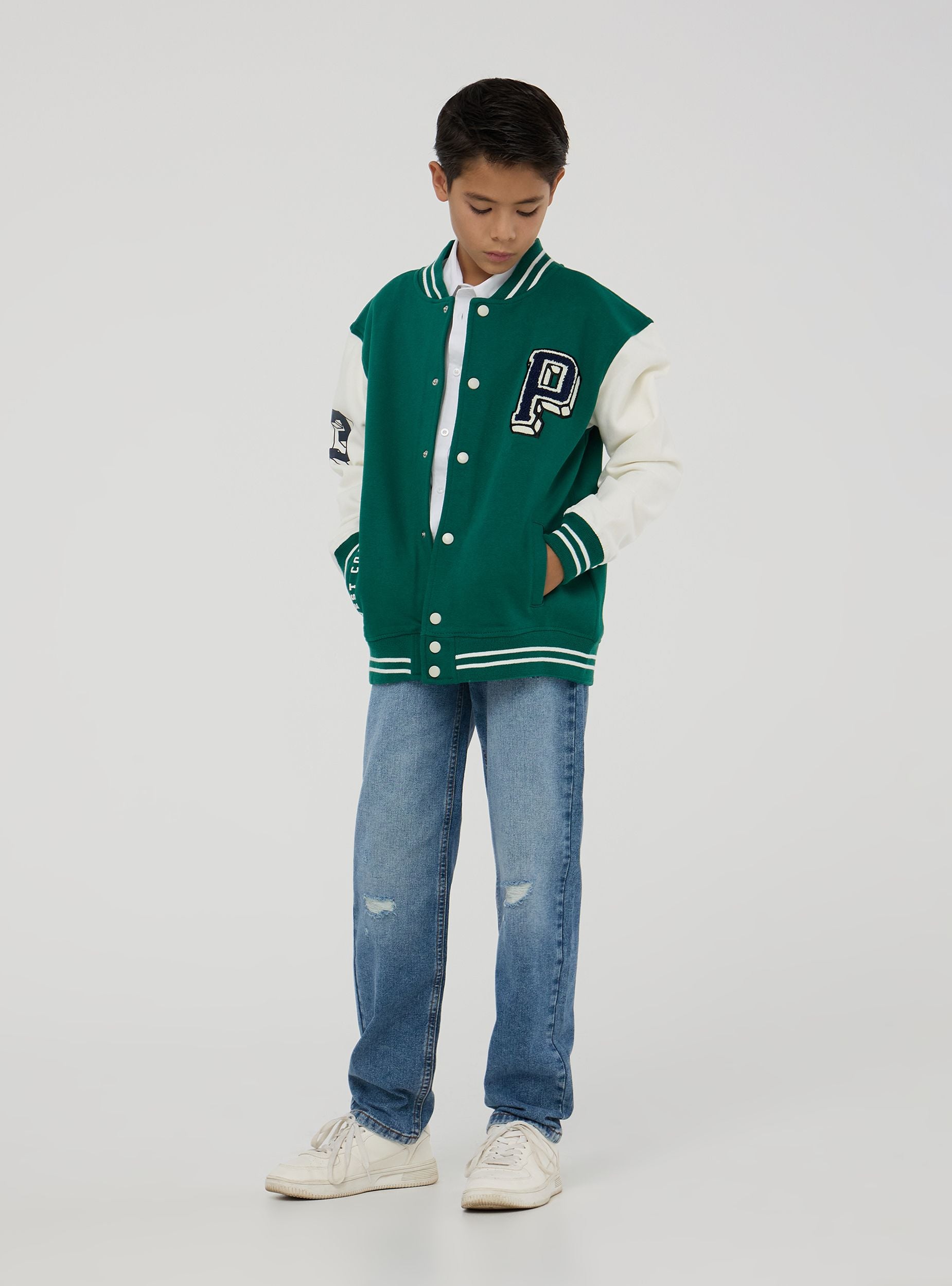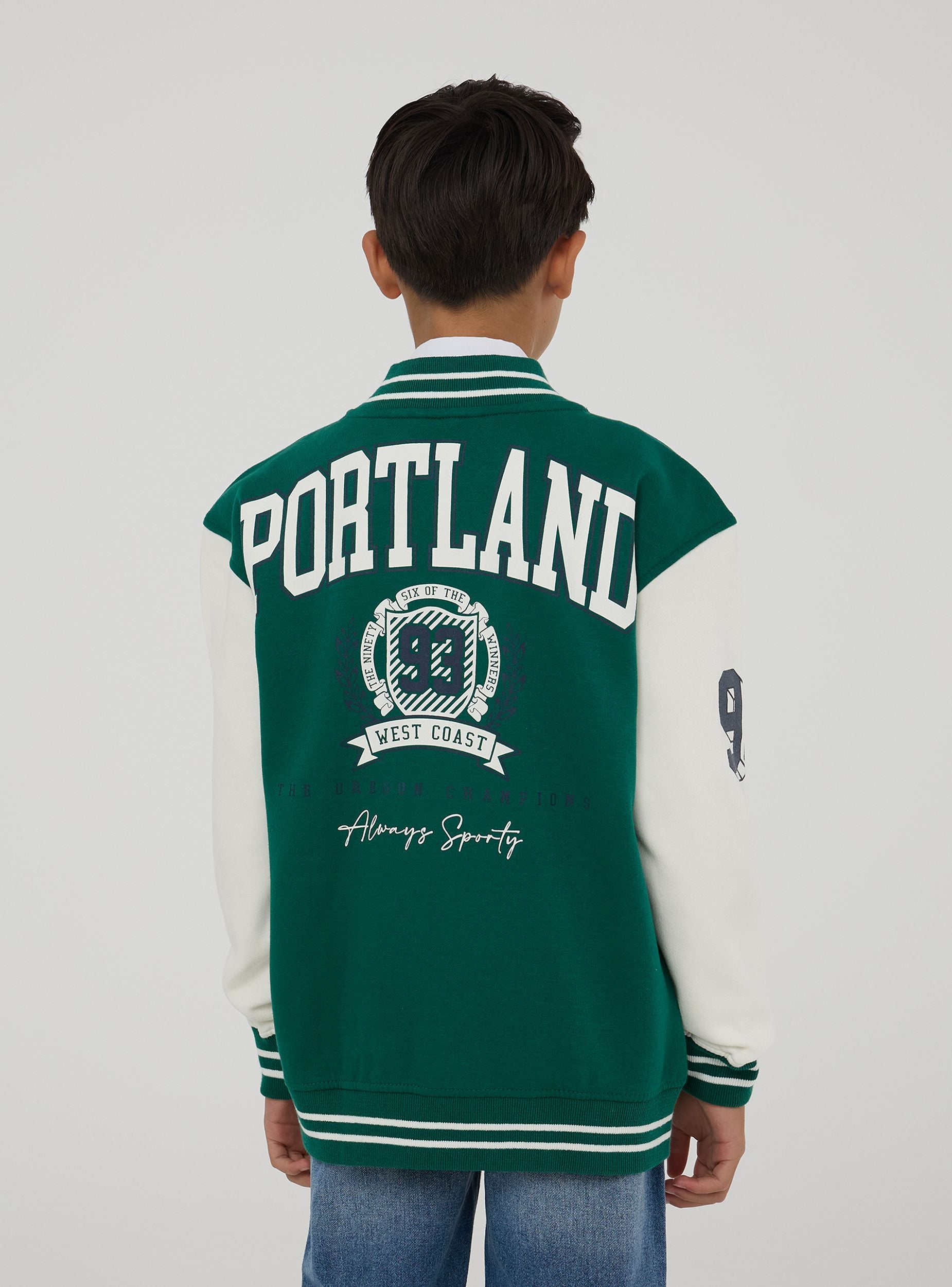 Bomber da bambino con dettagli in stile college americano. Presenta un'applicazione con la lettera "P" sul petto e la scritta "Portland" con stemma e scritte decorative sulla parte posteriore. Le maniche sono arricchite con numeri e dettagli stampati. Il colletto, i polsini e il fondo del bomber sono a coste, con strisce di contrasto. Chiusura frontale con bottoni a pressione e tasche oblique. Design accattivante e sportivo, ideale per un look casual e alla moda.