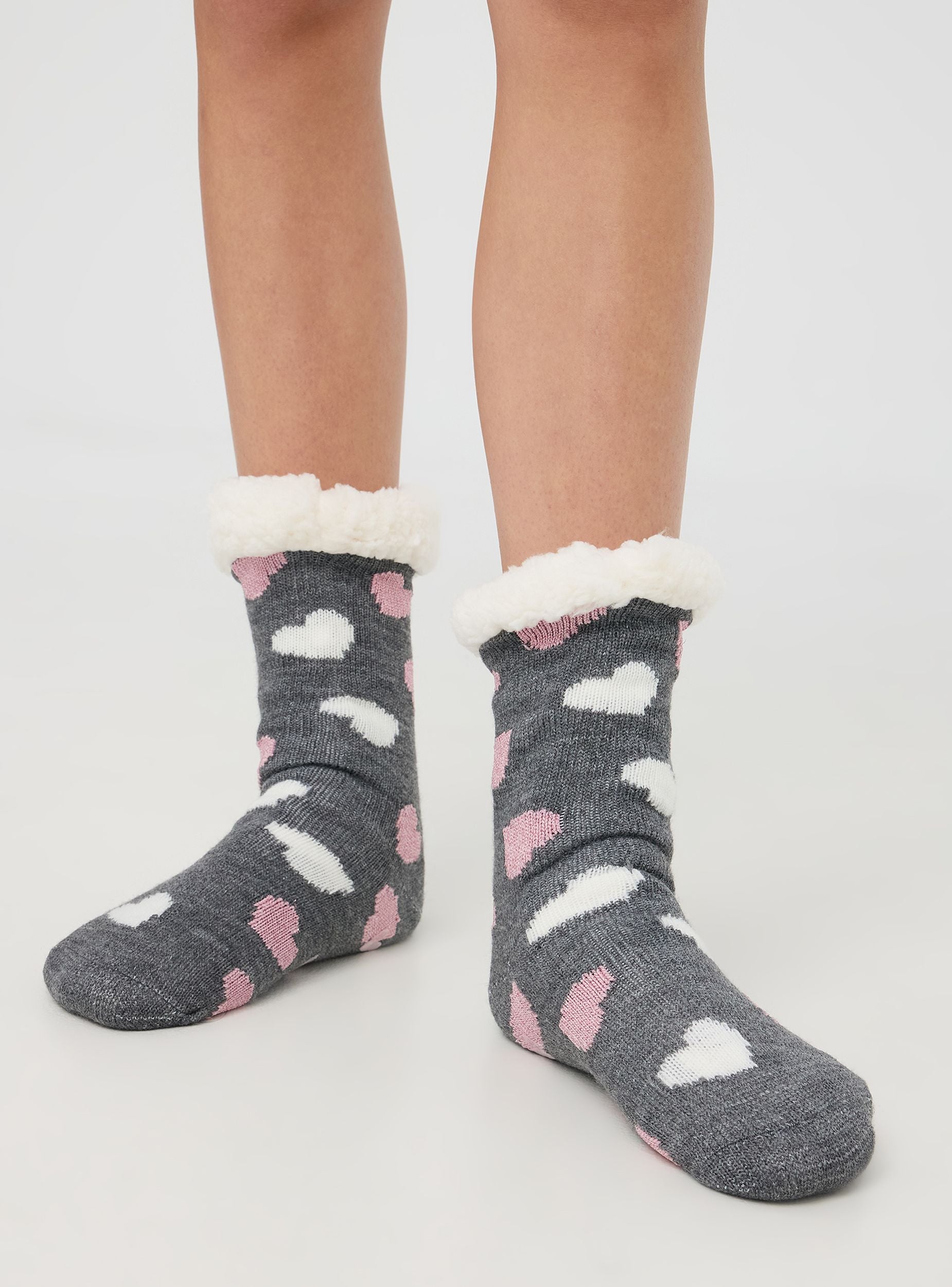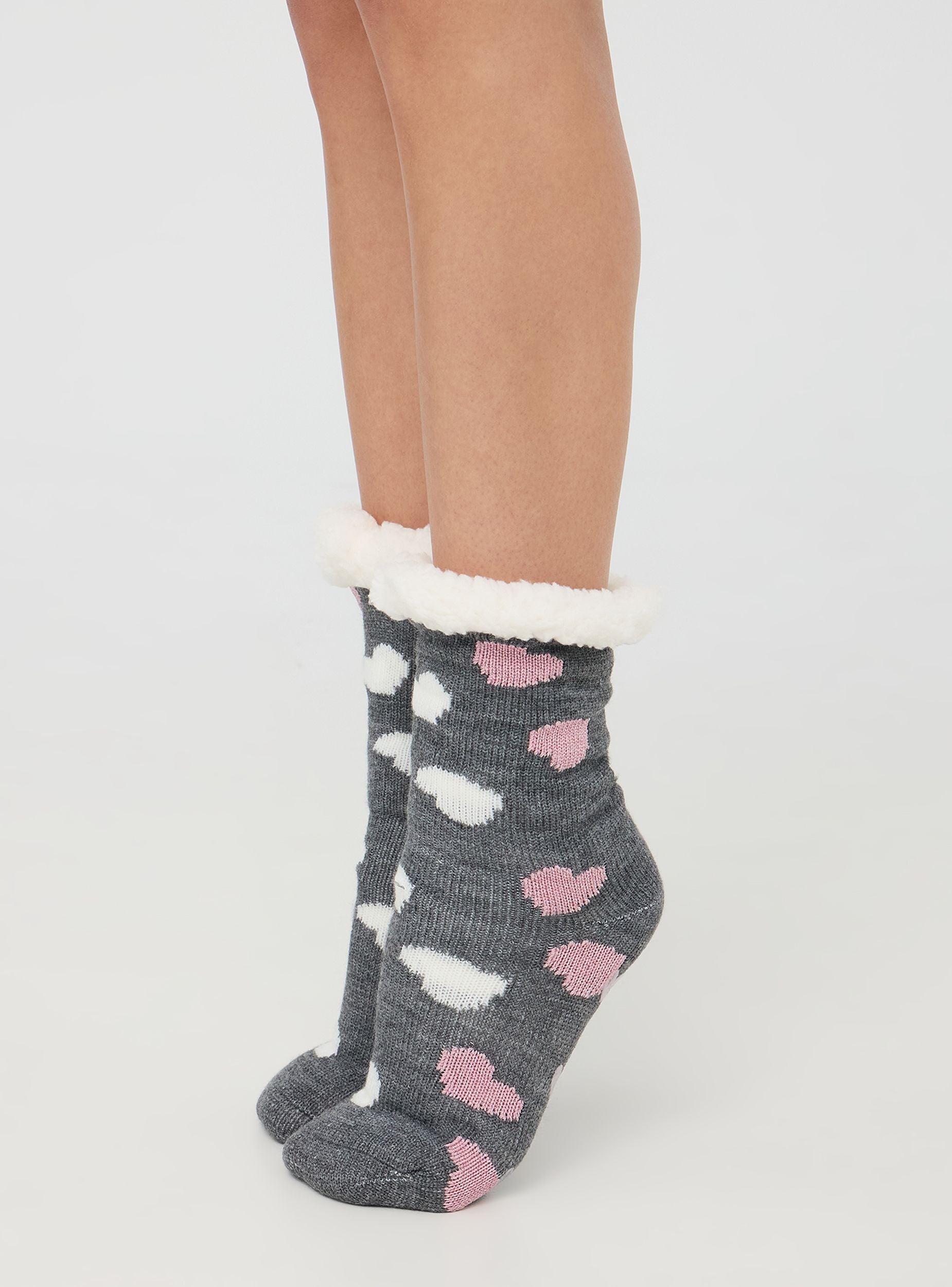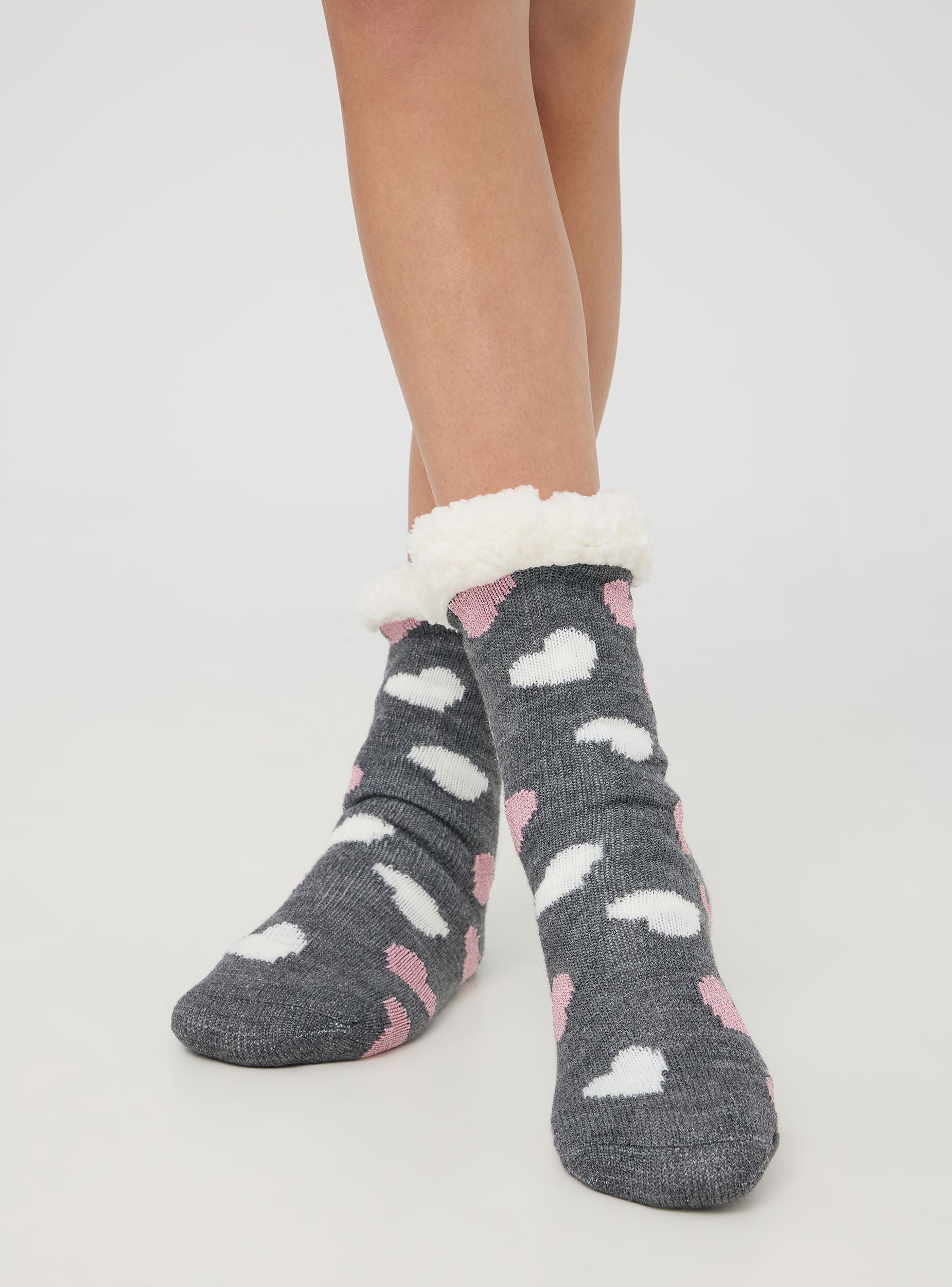 Calzettoni antiscivolo da donna con stampa cuori all-over. Il design presenta un'imbottitura in sherpa per maggiore comfort e calore. La parte inferiore presenta dei cuori in silicone per un effetto antiscivolo.