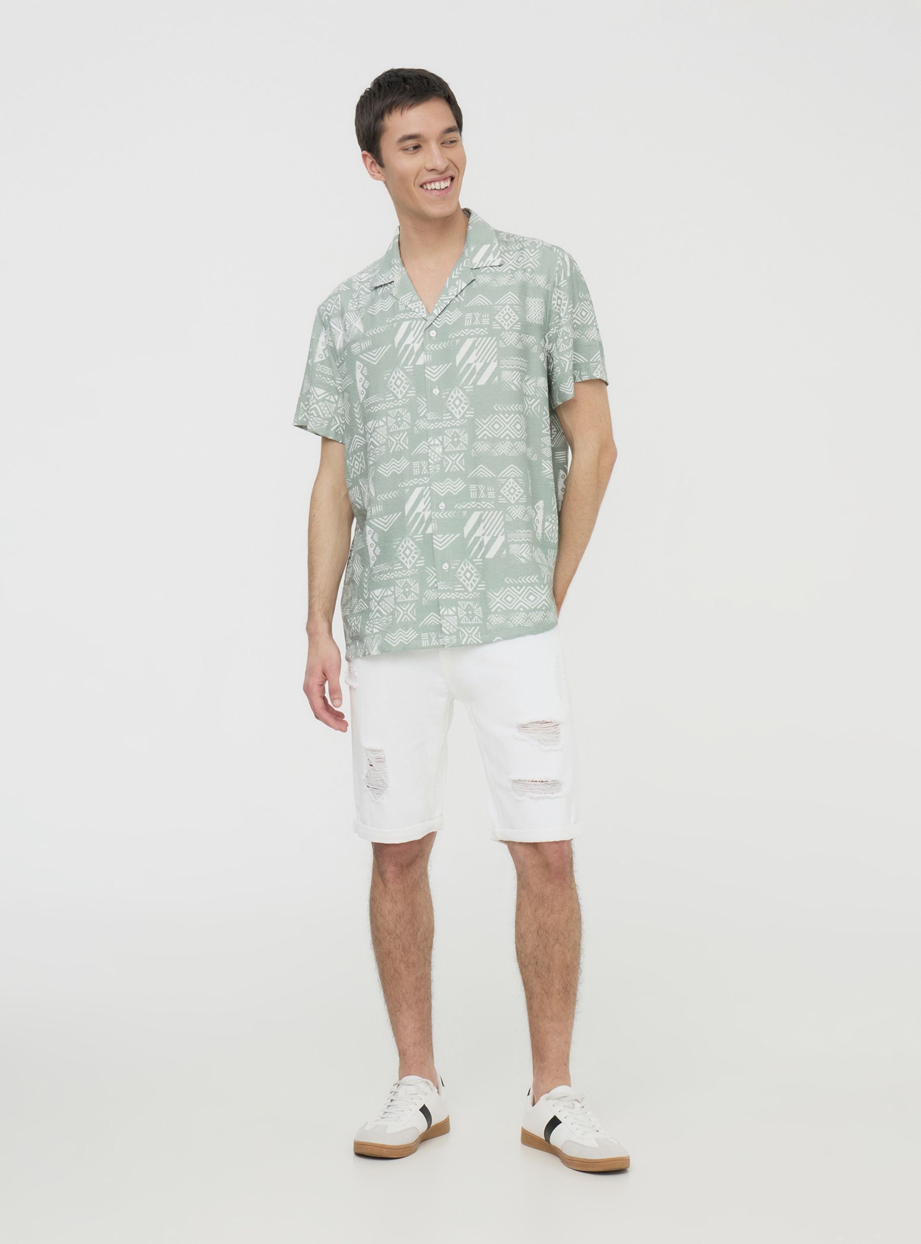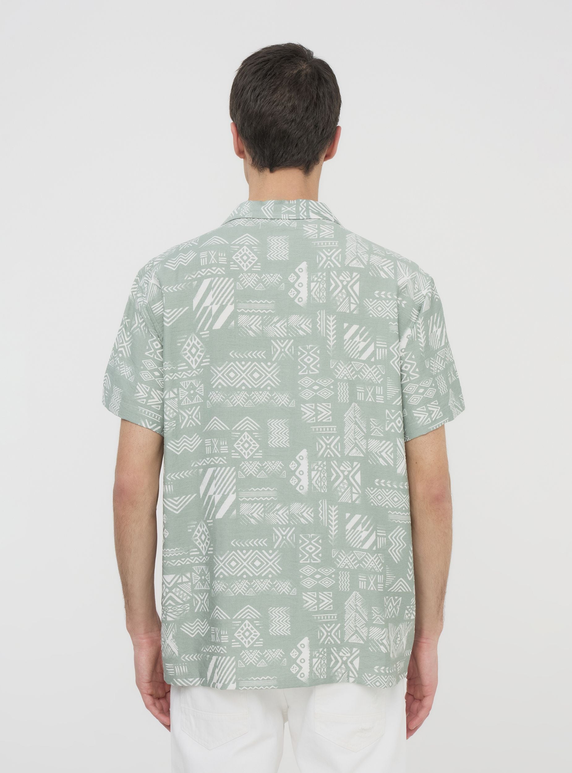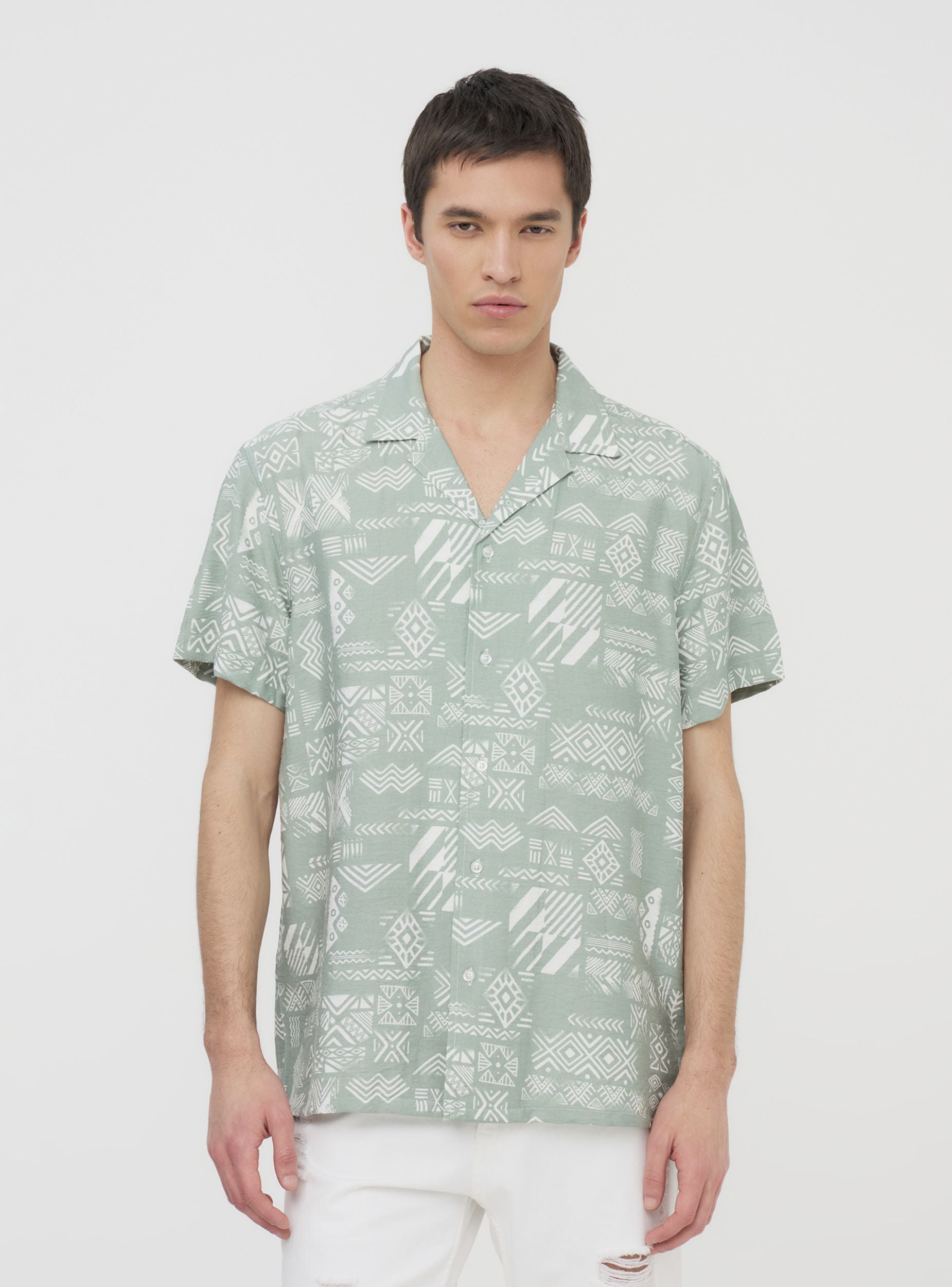 Camicia da uomo a maniche corte, perfetta per chi ama uno stile ricercato e originale. La fantasia etnica all-over dona un tocco distintivo, rendendo il capo ideale per look casual e rilassati. La chiusura con bottoni aggiunge versatilità, permettendo di indossarla aperta su una t-shirt o chiusa per un effetto più curato. Un'opzione ideale per chi desidera un outfit fresco e dal carattere deciso.