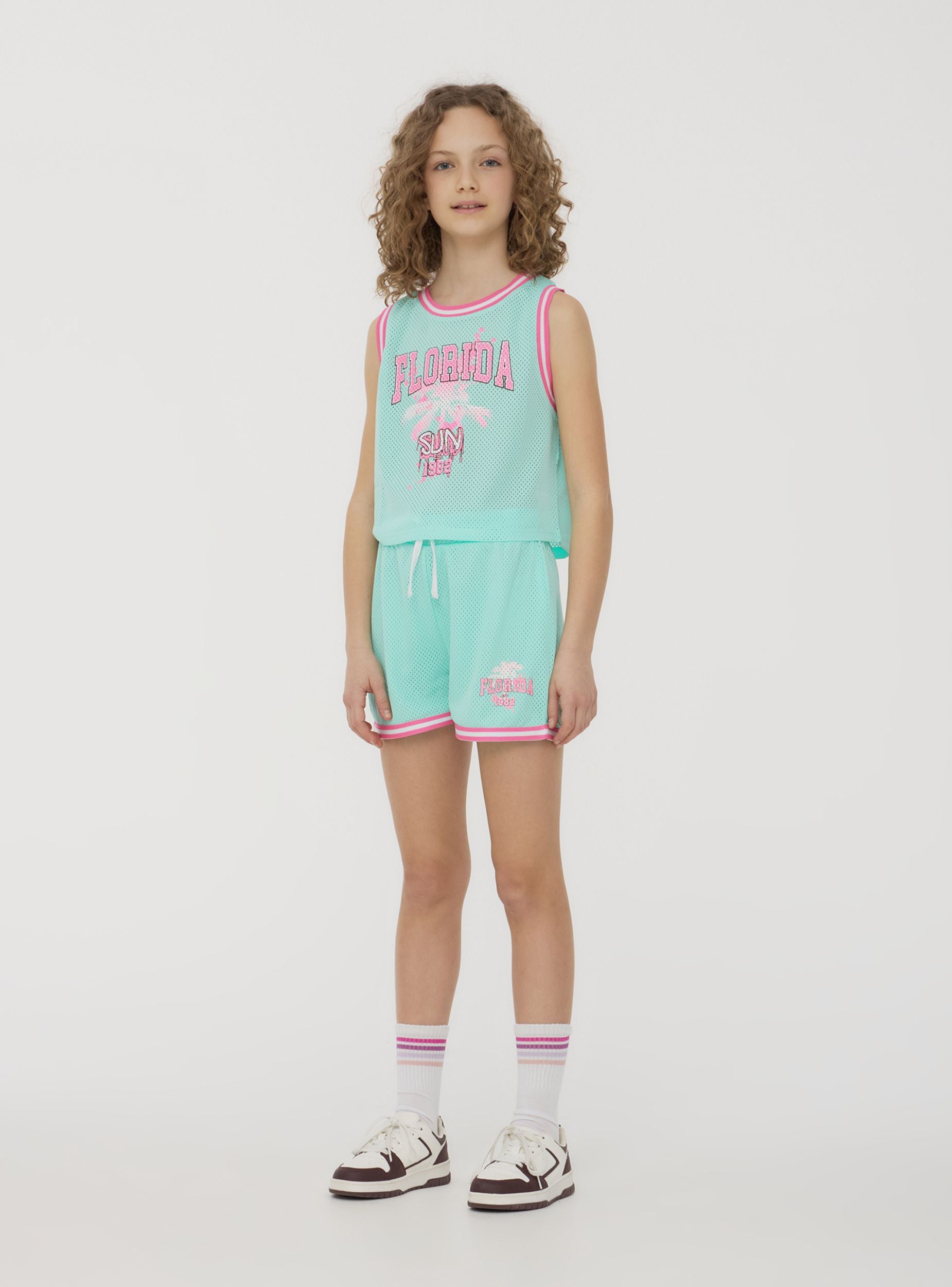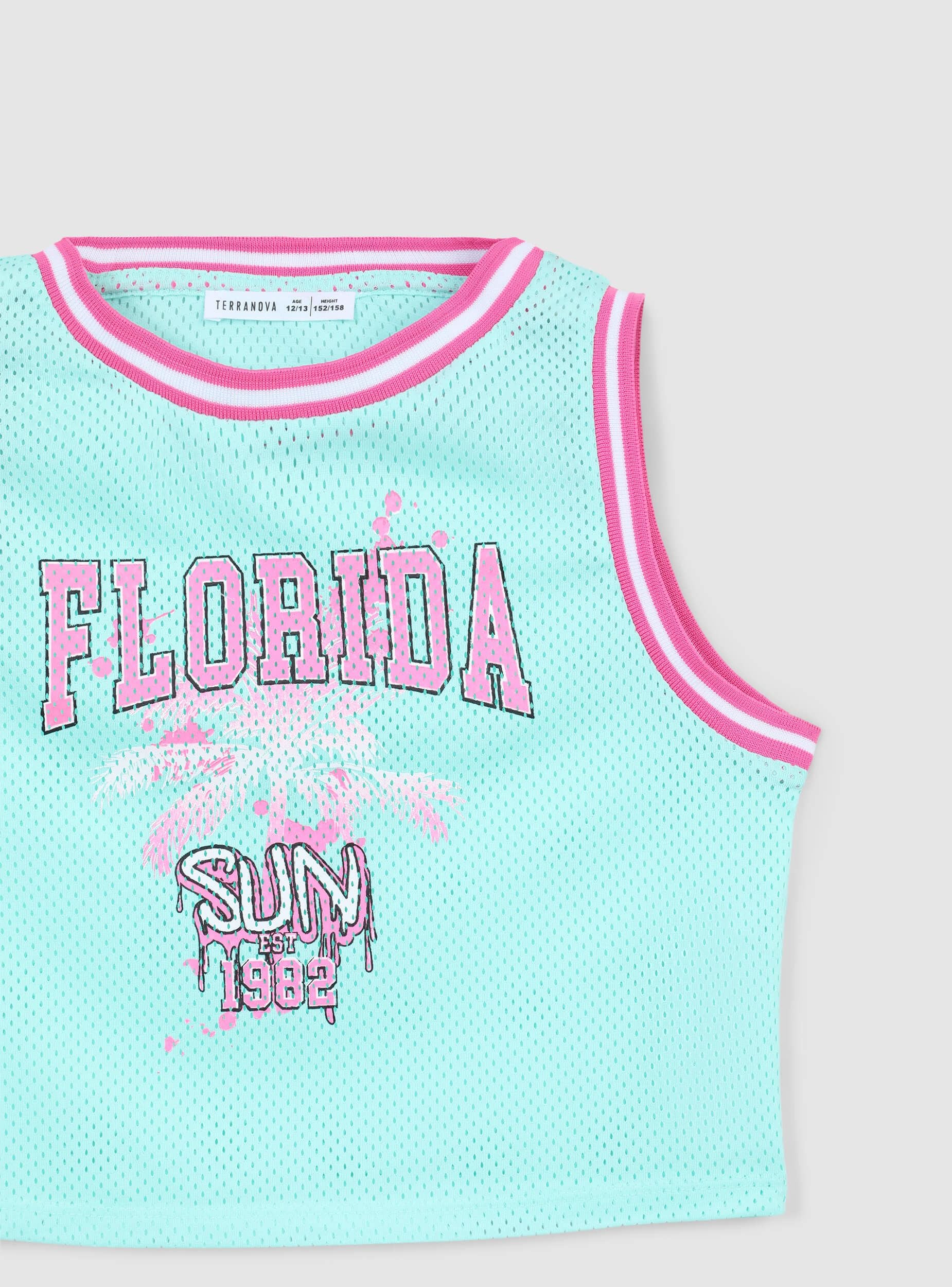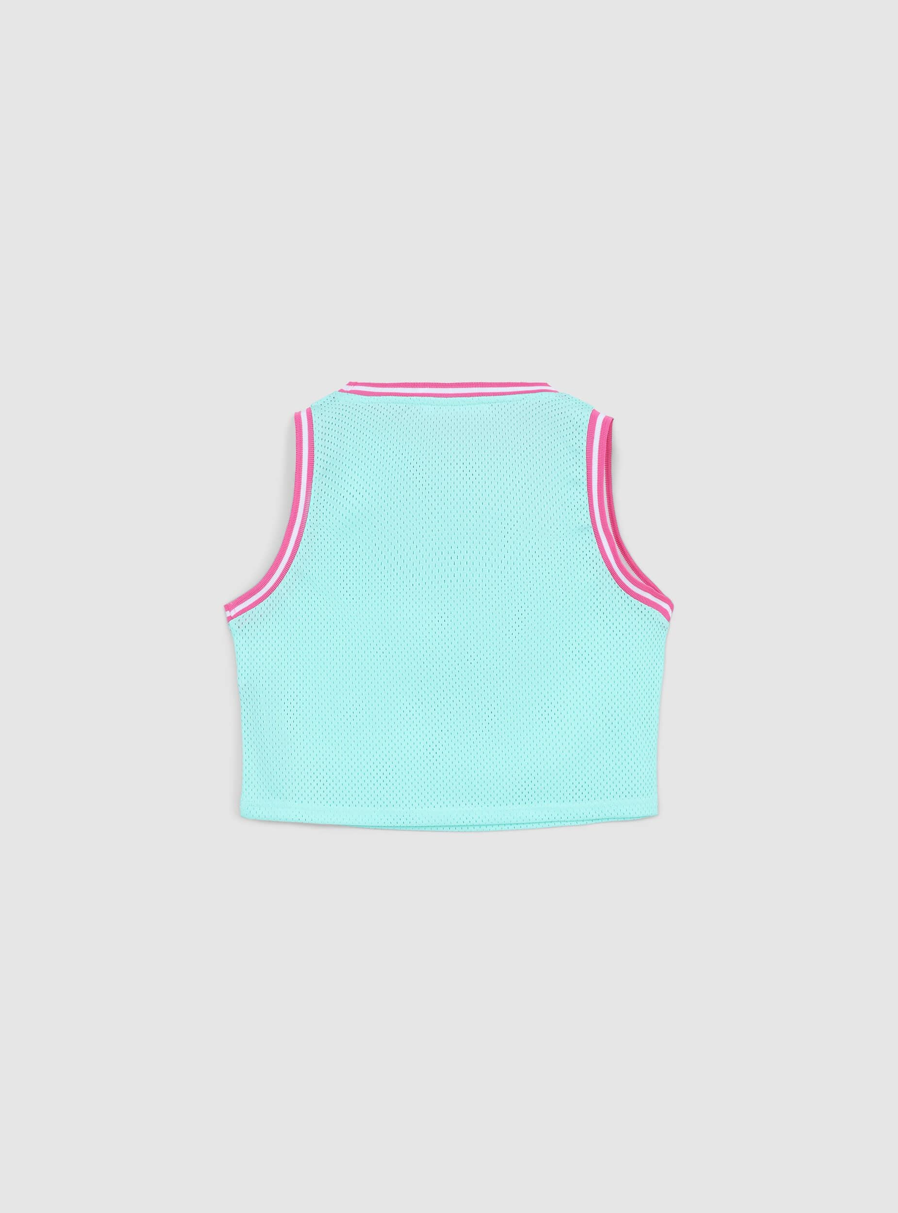 Canotta da bambina dal look sportivo ispirato al mondo del basket, realizzata in rete traspirante per un tocco trendy e dinamico. La stampa centrale aggiunge personalità al capo, mentre i profili a contrasto ne definiscono il design energico. Perfetta per completare outfit casual e freschi, questa canotta unisce stile e comfort per accompagnare le giornate più attive.