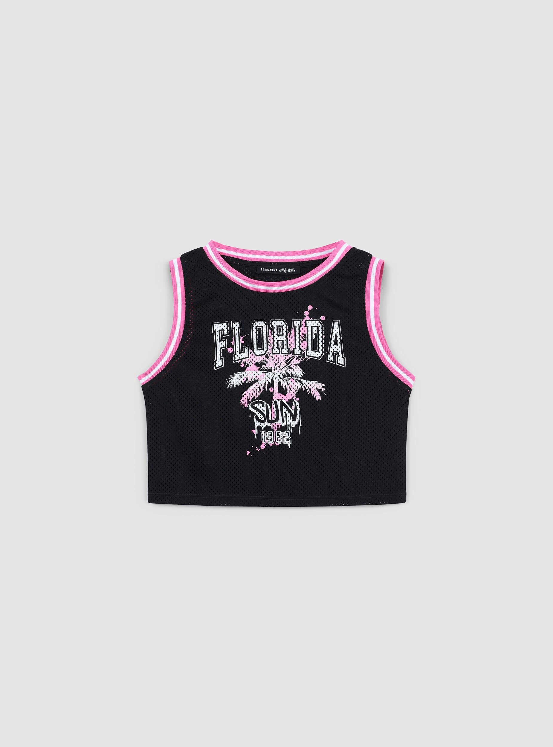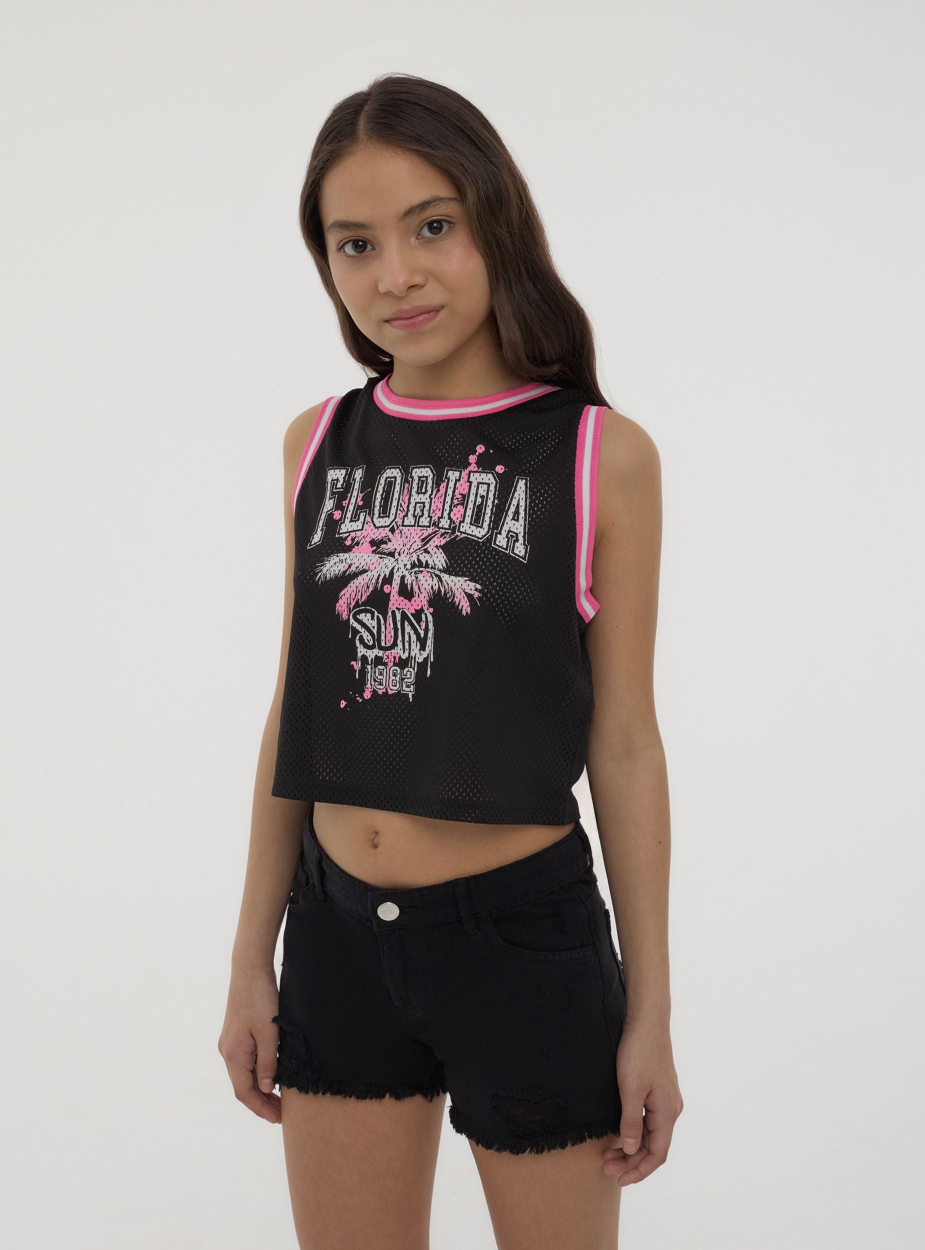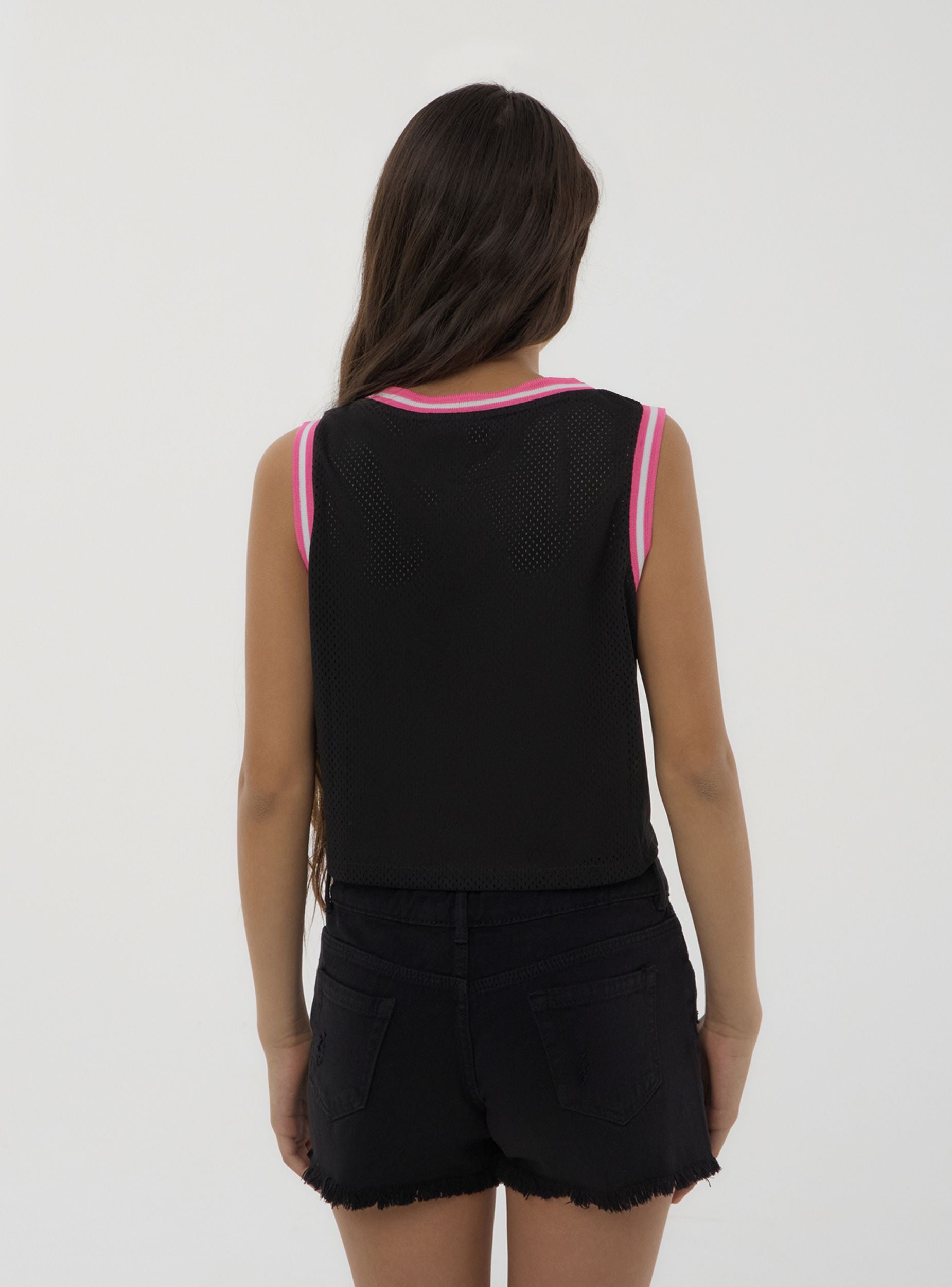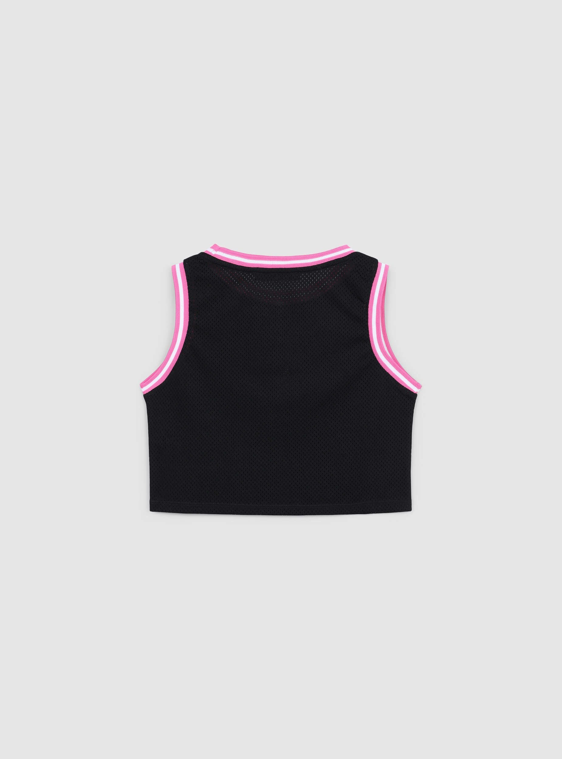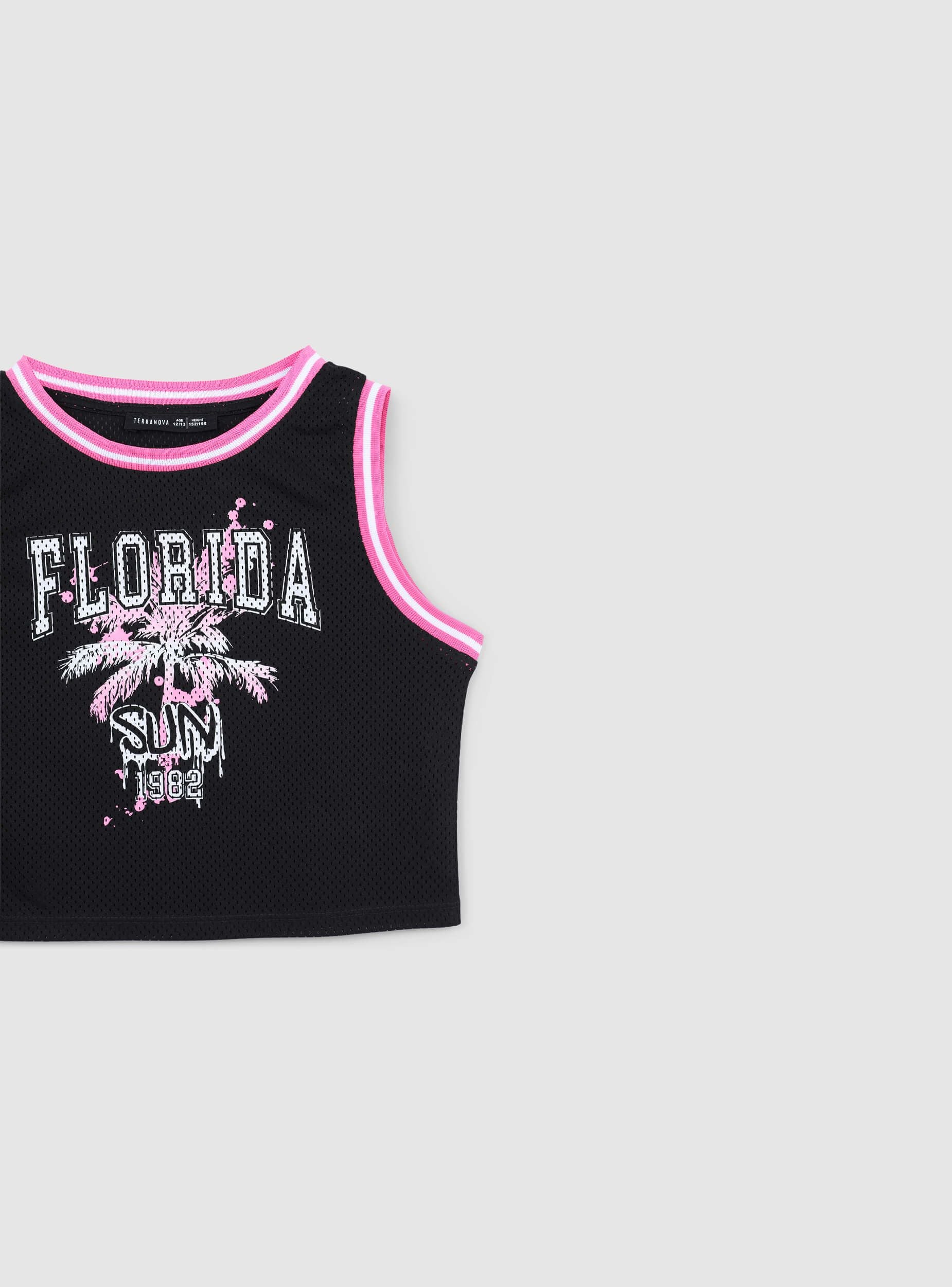 Canotta da bambina dal look sportivo ispirato al mondo del basket, realizzata in rete traspirante per un tocco trendy e dinamico. La stampa centrale aggiunge personalità al capo, mentre i profili a contrasto ne definiscono il design energico. Perfetta per completare outfit casual e freschi, questa canotta unisce stile e comfort per accompagnare le giornate più attive.