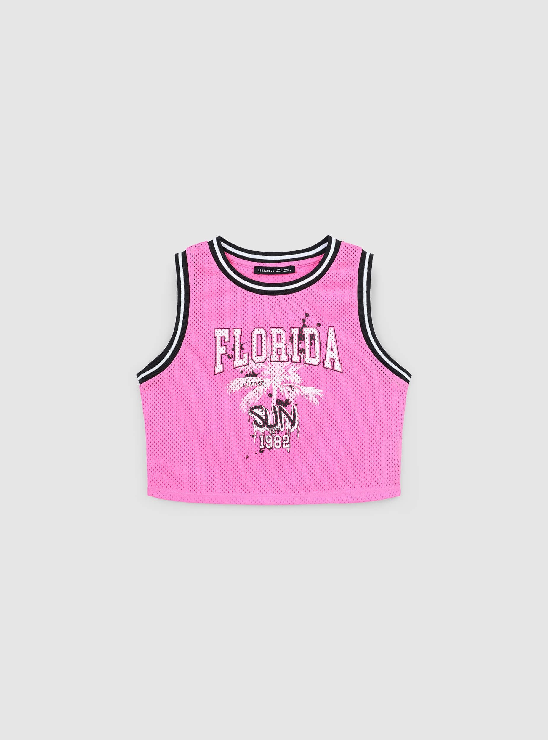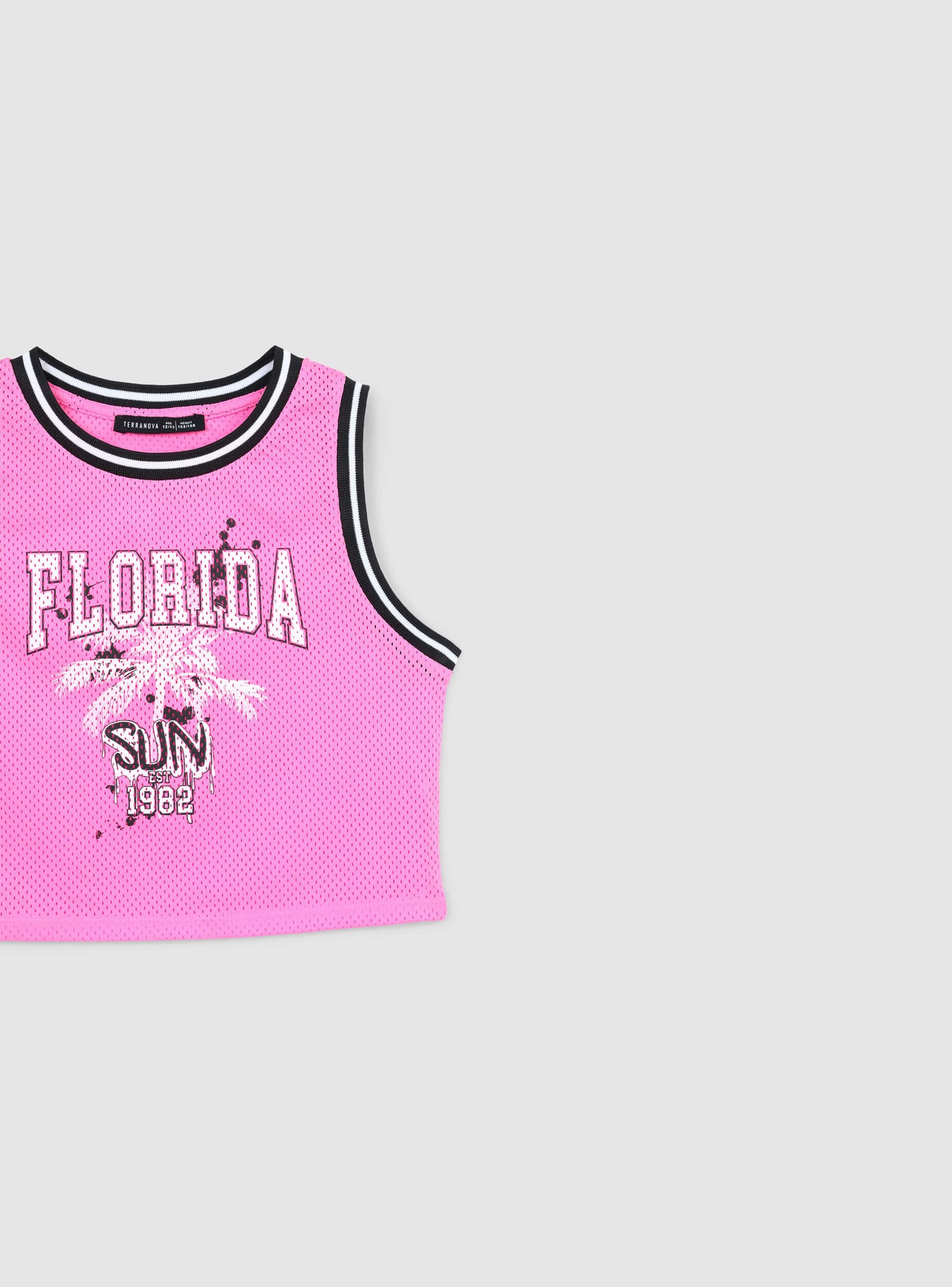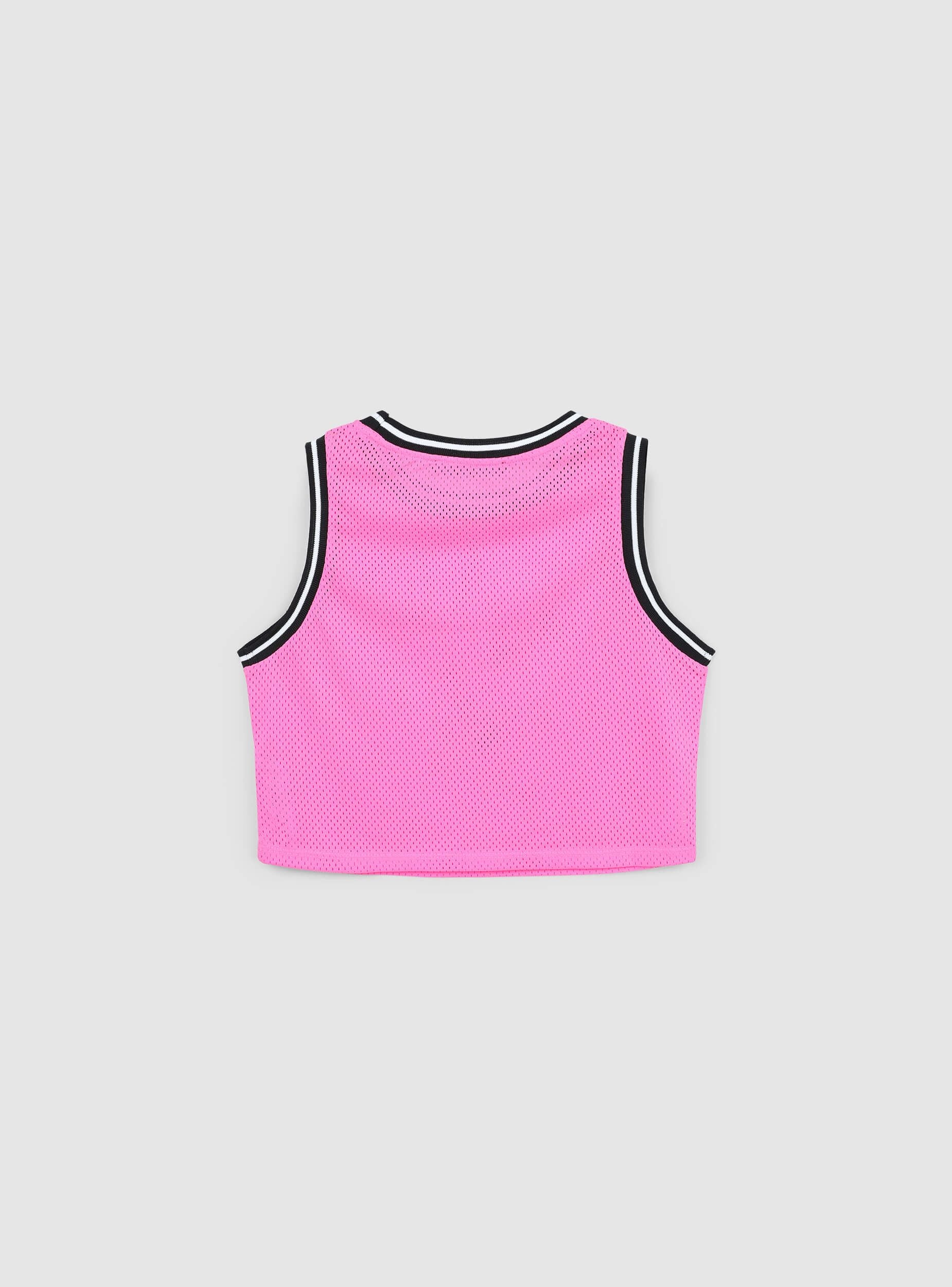 Canotta da bambina dal look sportivo ispirato al mondo del basket, realizzata in rete traspirante per un tocco trendy e dinamico. La stampa centrale aggiunge personalità al capo, mentre i profili a contrasto ne definiscono il design energico. Perfetta per completare outfit casual e freschi, questa canotta unisce stile e comfort per accompagnare le giornate più attive.