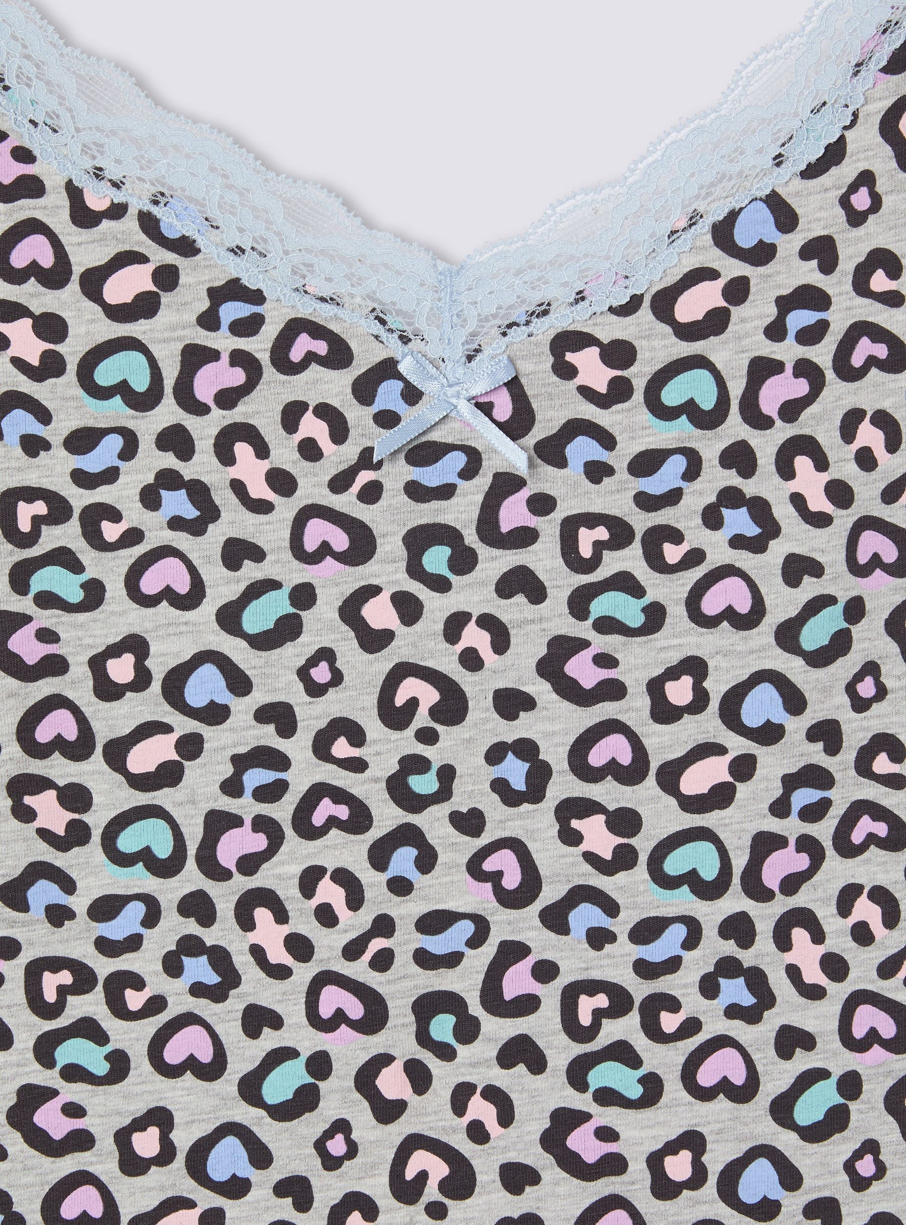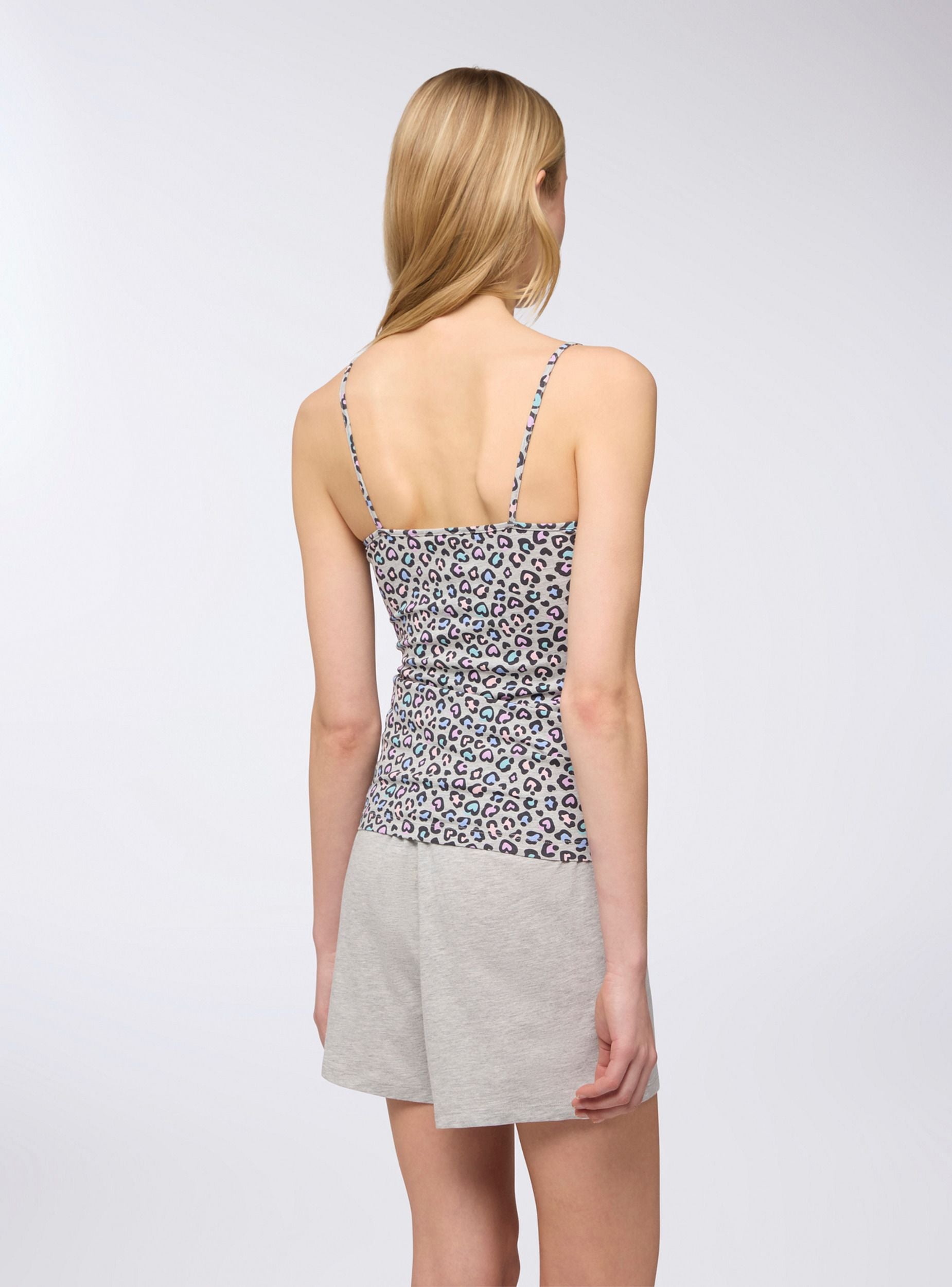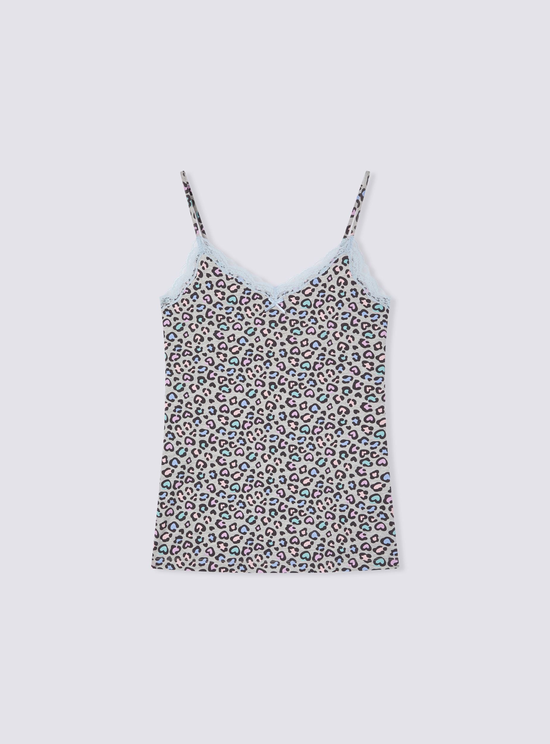 Canotta da donna dal design seducente e femminile, impreziosita da una stampa animalier che aggiunge un tocco audace e moderno. Le spalline sottili assicurano una vestibilità delicata, mentre il pizzo lungo lo scollo dona un effetto romantico. Il fiocco frontale completa il look con un dettaglio raffinato. Perfetta come intimo o sotto una camicia aperta per un outfit trendy e versatile.