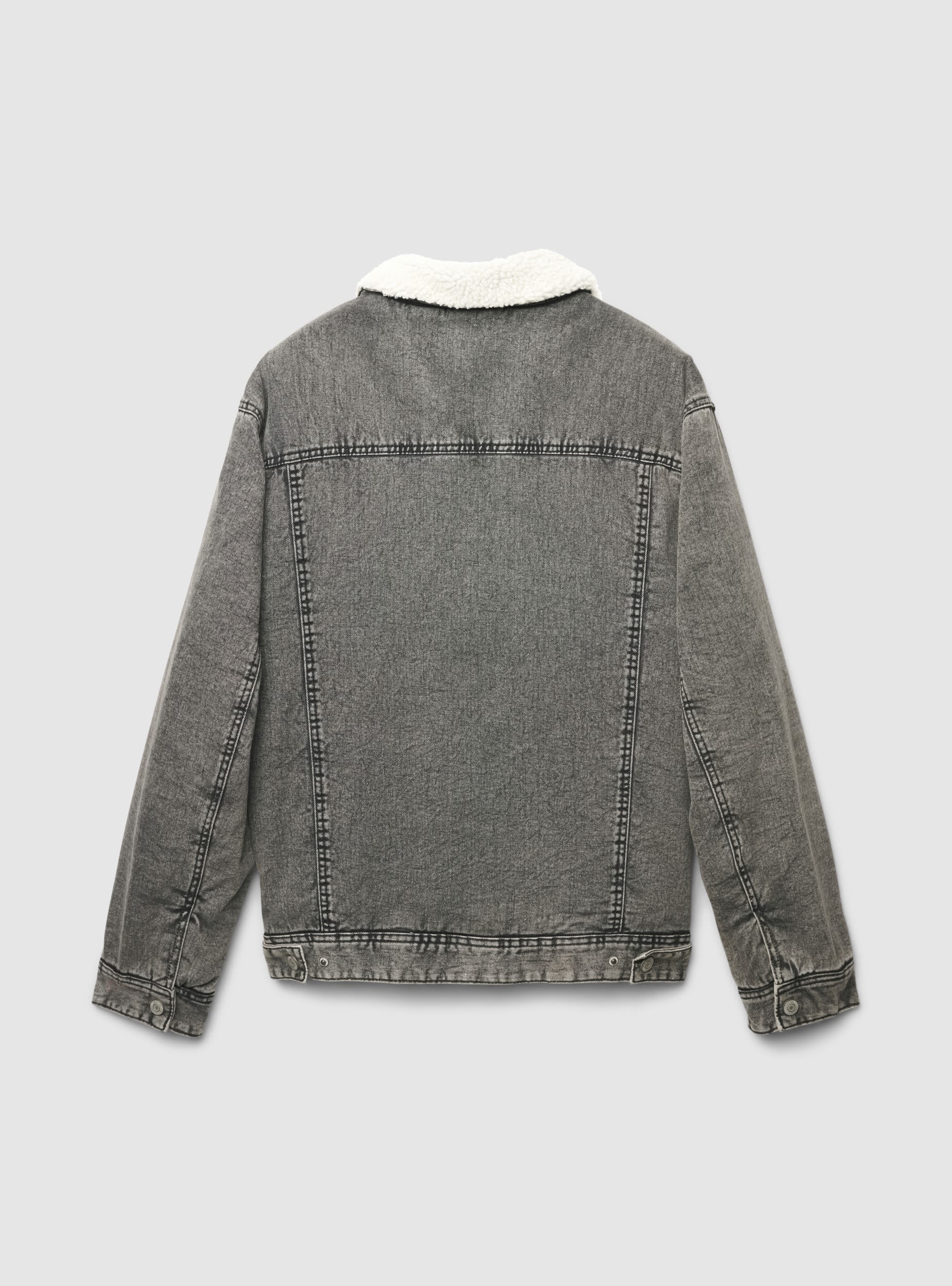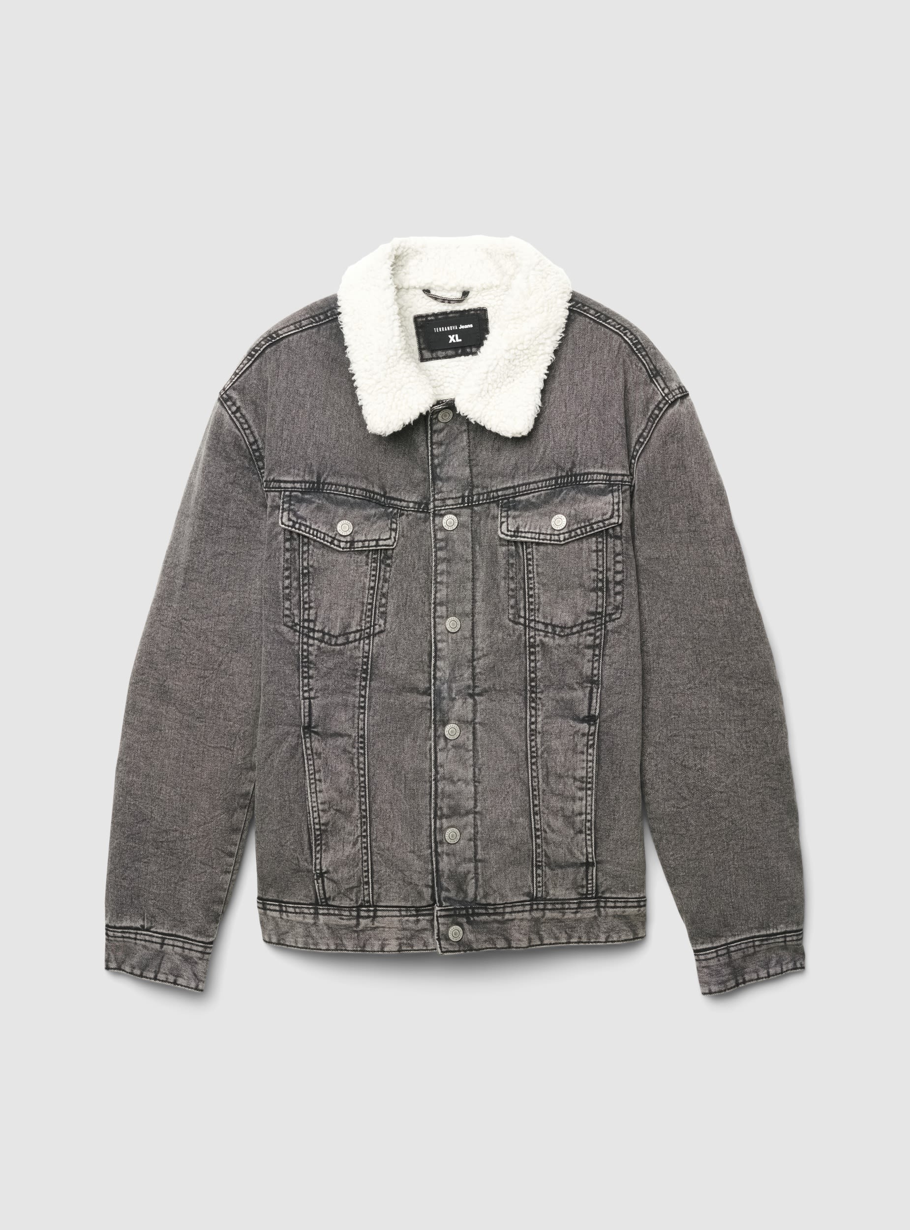 Giacca imbottita da uomo in denim con colletto a camicia. Chiusura frontale con bottoni a pressione e tasche sul petto con pattina, affiancate da tasche laterali. Vestibilità regular facile da sovrapporre a maglie e felpe, ideale con jeans o pantaloni cargo per un look casual. Cuciture a vista e finitura tinta unita per uno stile deciso.