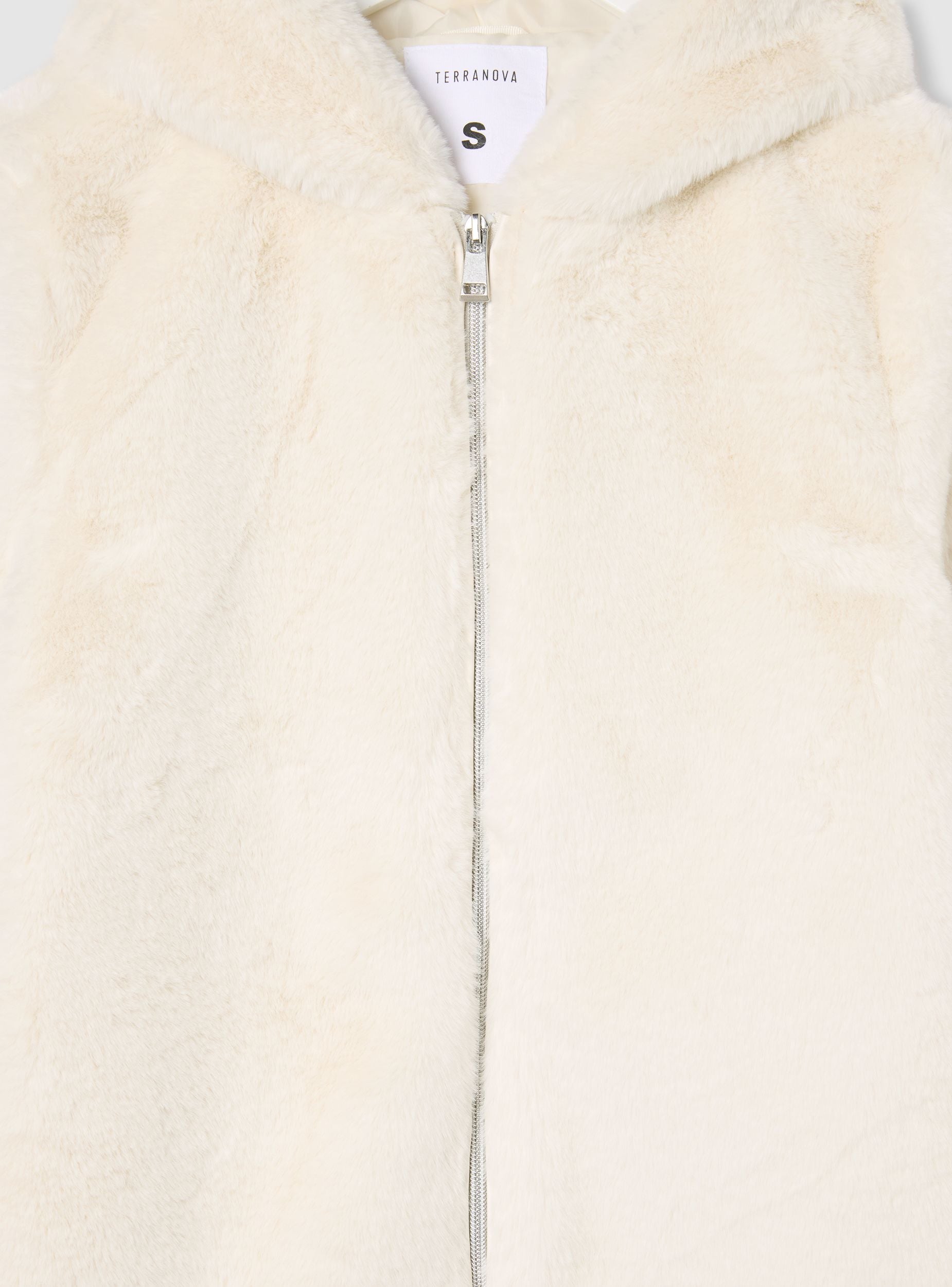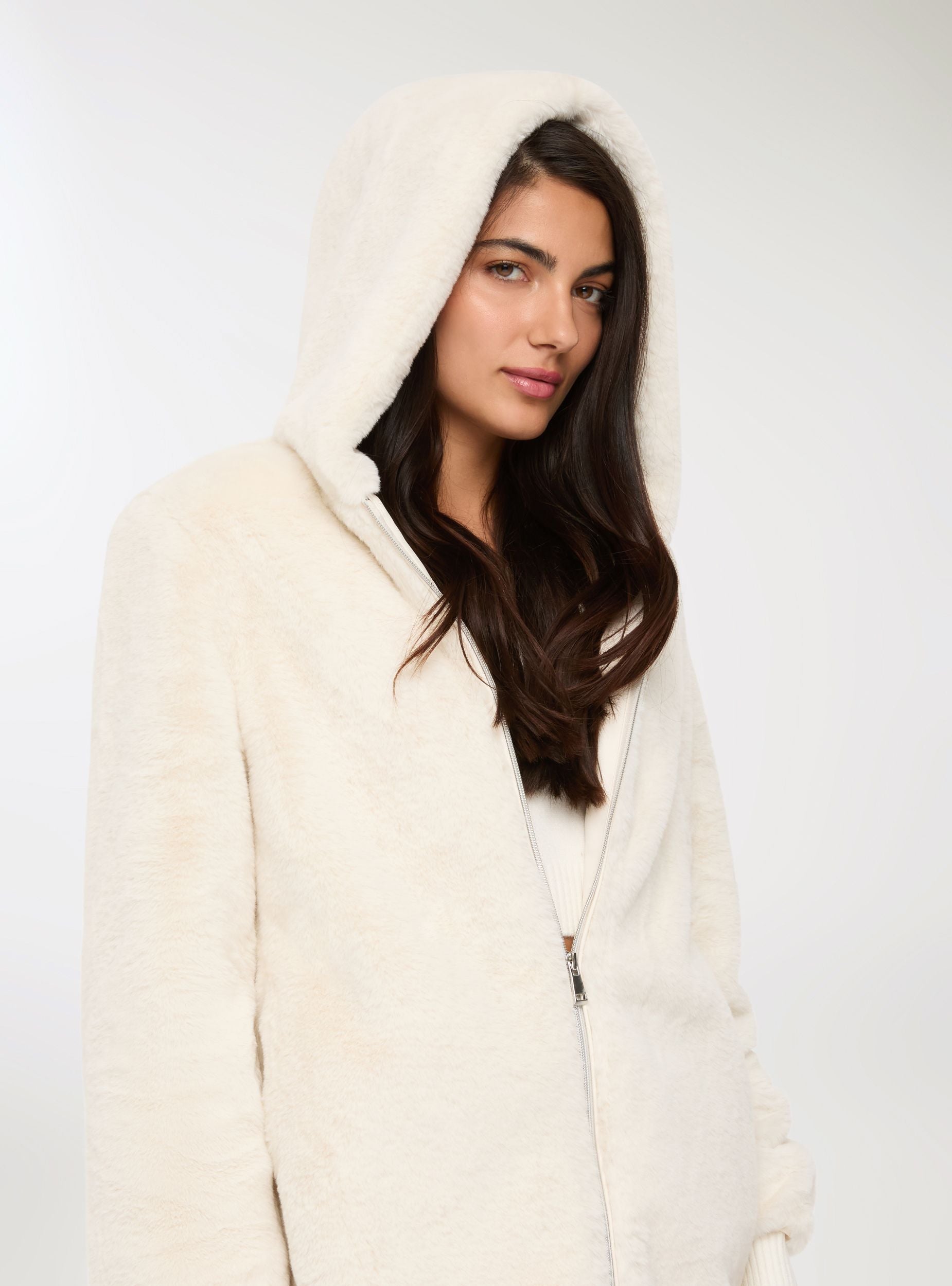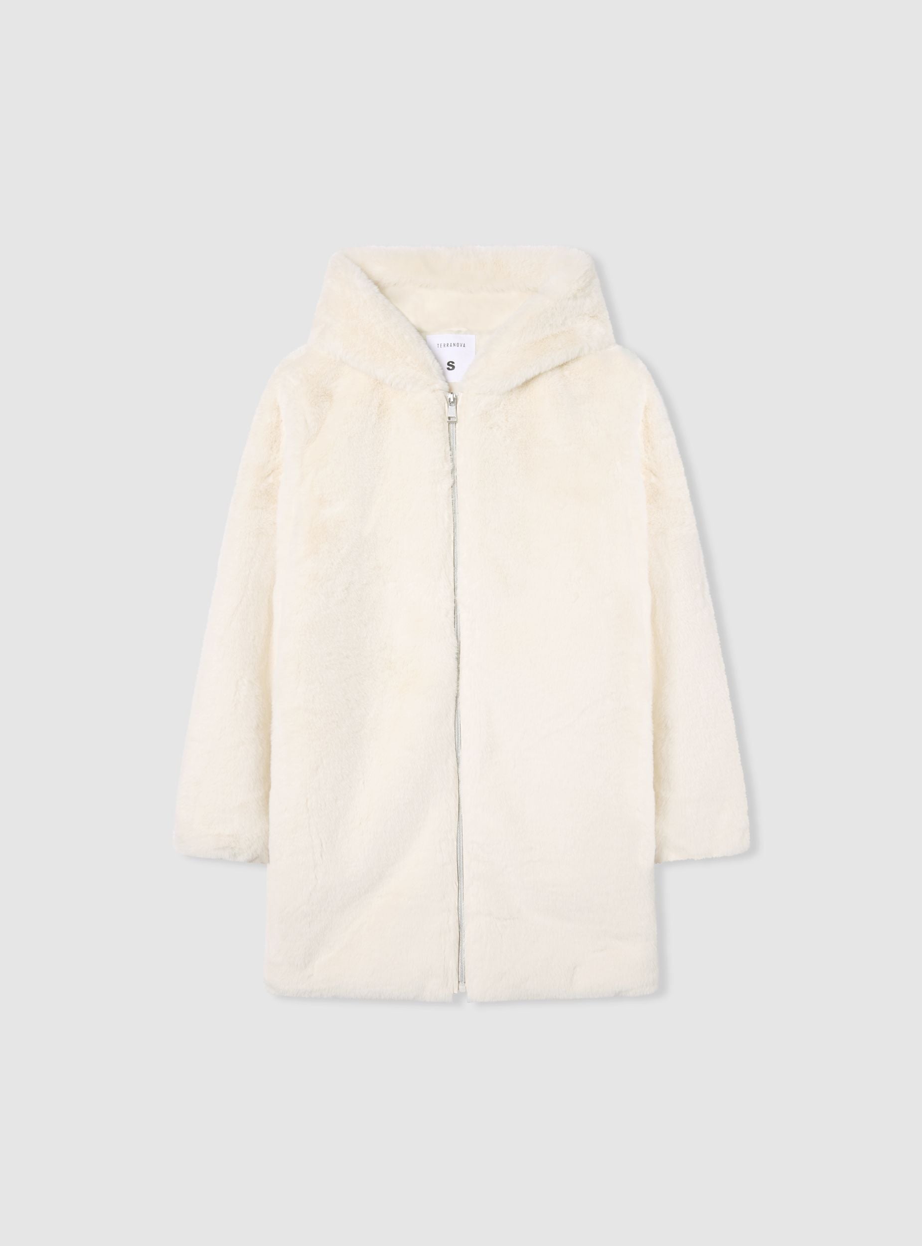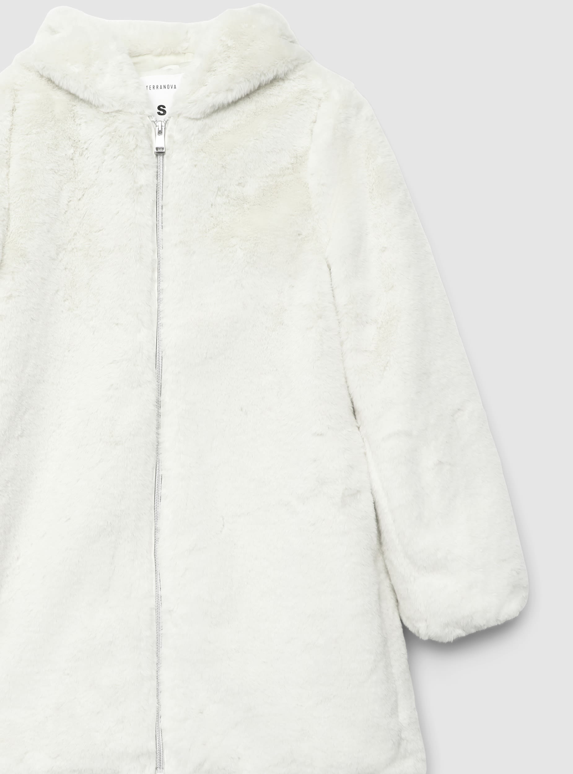 Cappotto da donna con cappuccio, dalla linea dritta e avvolgente, perfetto per affrontare le giornate più fredde con un tocco glamour. La lunghezza media lo rende ideale da indossare su pantaloni skinny o gonne aderenti per un look metropolitano. La zip frontale garantisce una chiusura pratica, mentre il design essenziale e la finitura in pelliccia sintetica donano stile anche alle uscite più informali. Completano il capo le tasche laterali, comode e funzionali.Dettagli