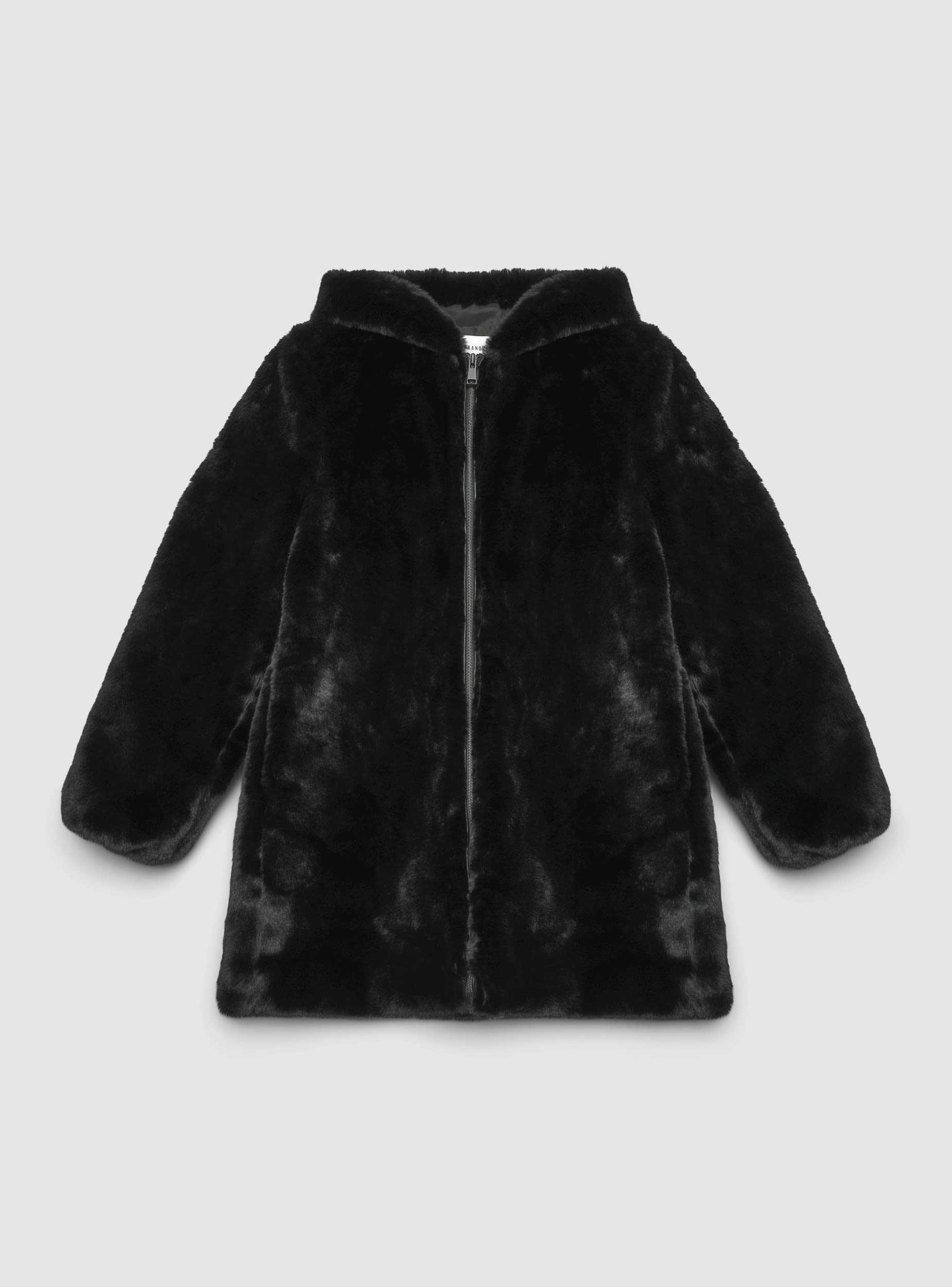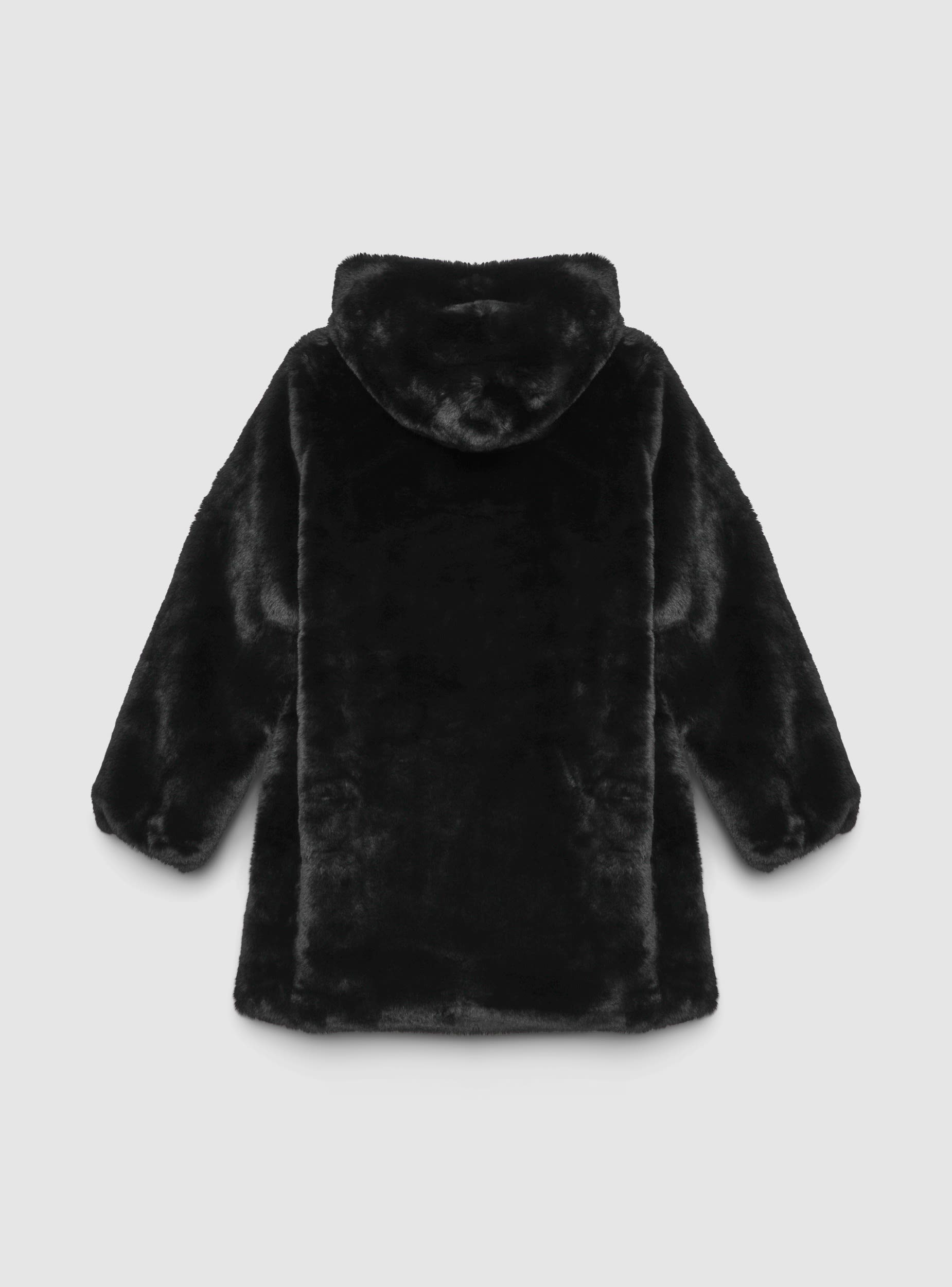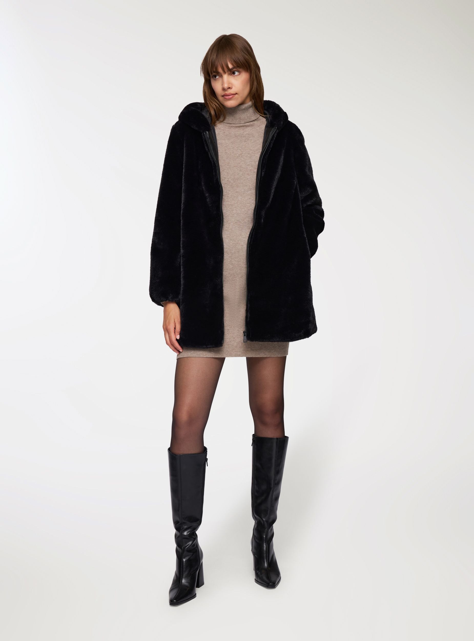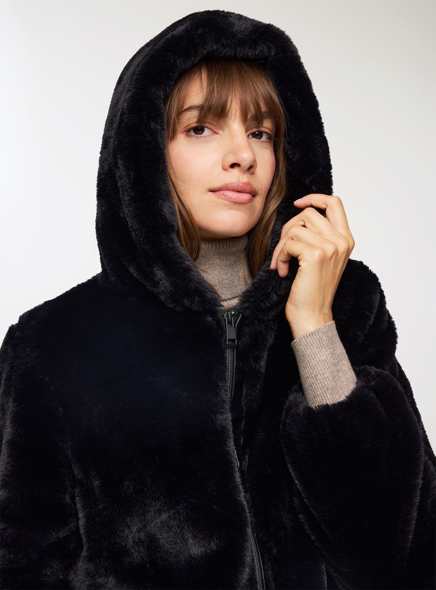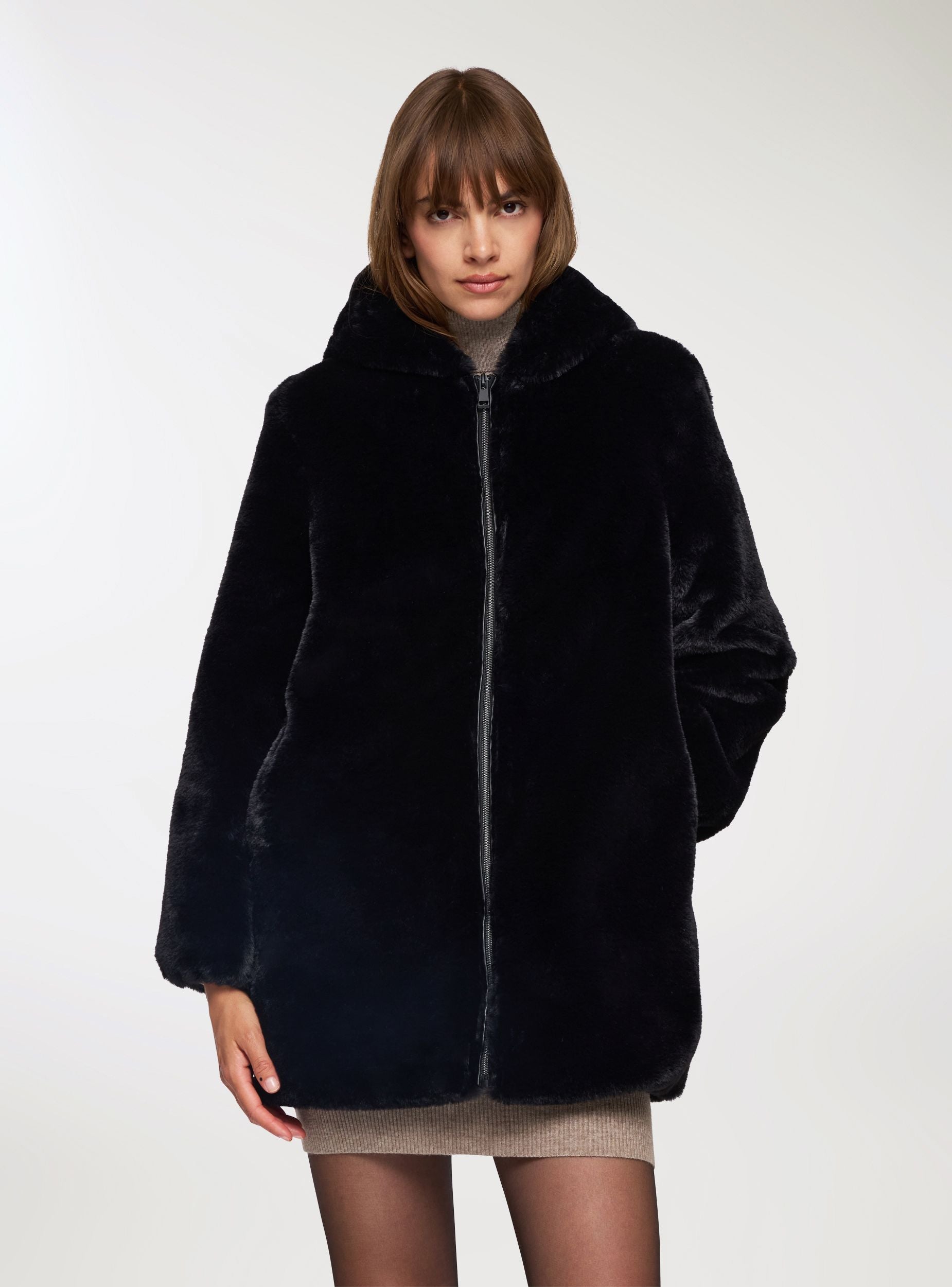 Cappotto da donna con cappuccio, dalla linea dritta e avvolgente, perfetto per affrontare le giornate più fredde con un tocco glamour. La lunghezza media lo rende ideale da indossare su pantaloni skinny o gonne aderenti per un look metropolitano. La zip frontale garantisce una chiusura pratica, mentre il design essenziale e la finitura in pelliccia sintetica donano stile anche alle uscite più informali. Completano il capo le tasche laterali, comode e funzionali.