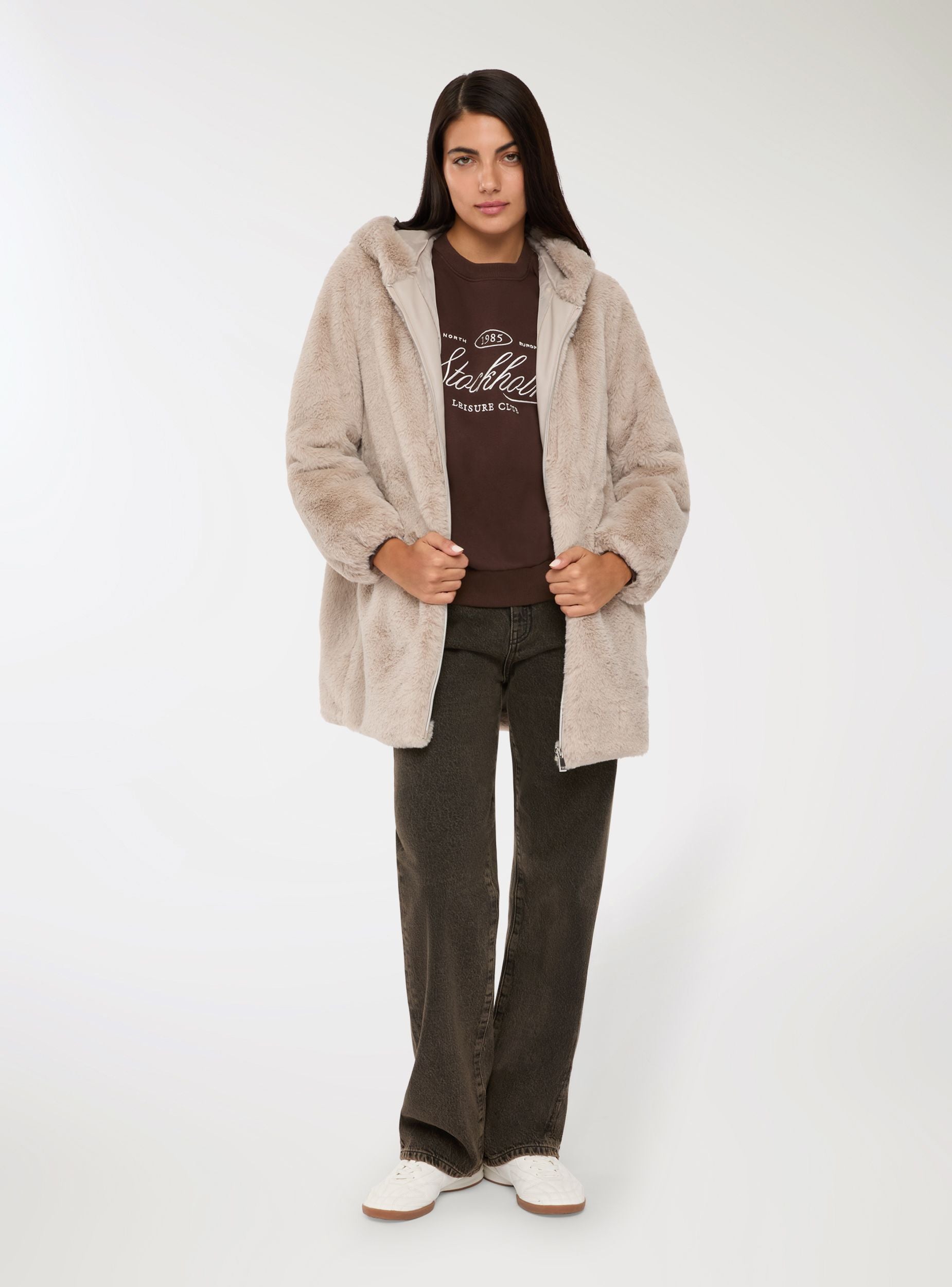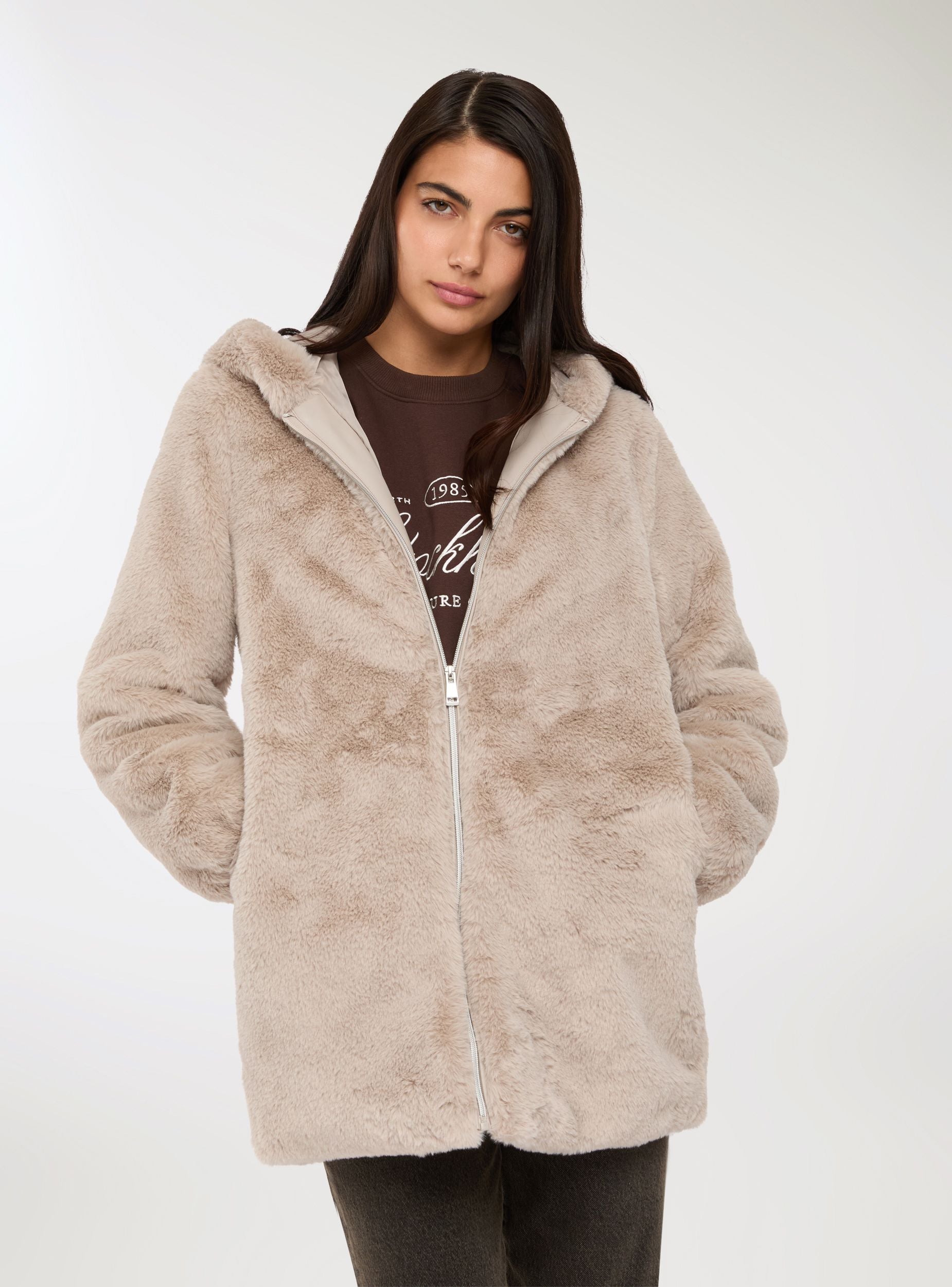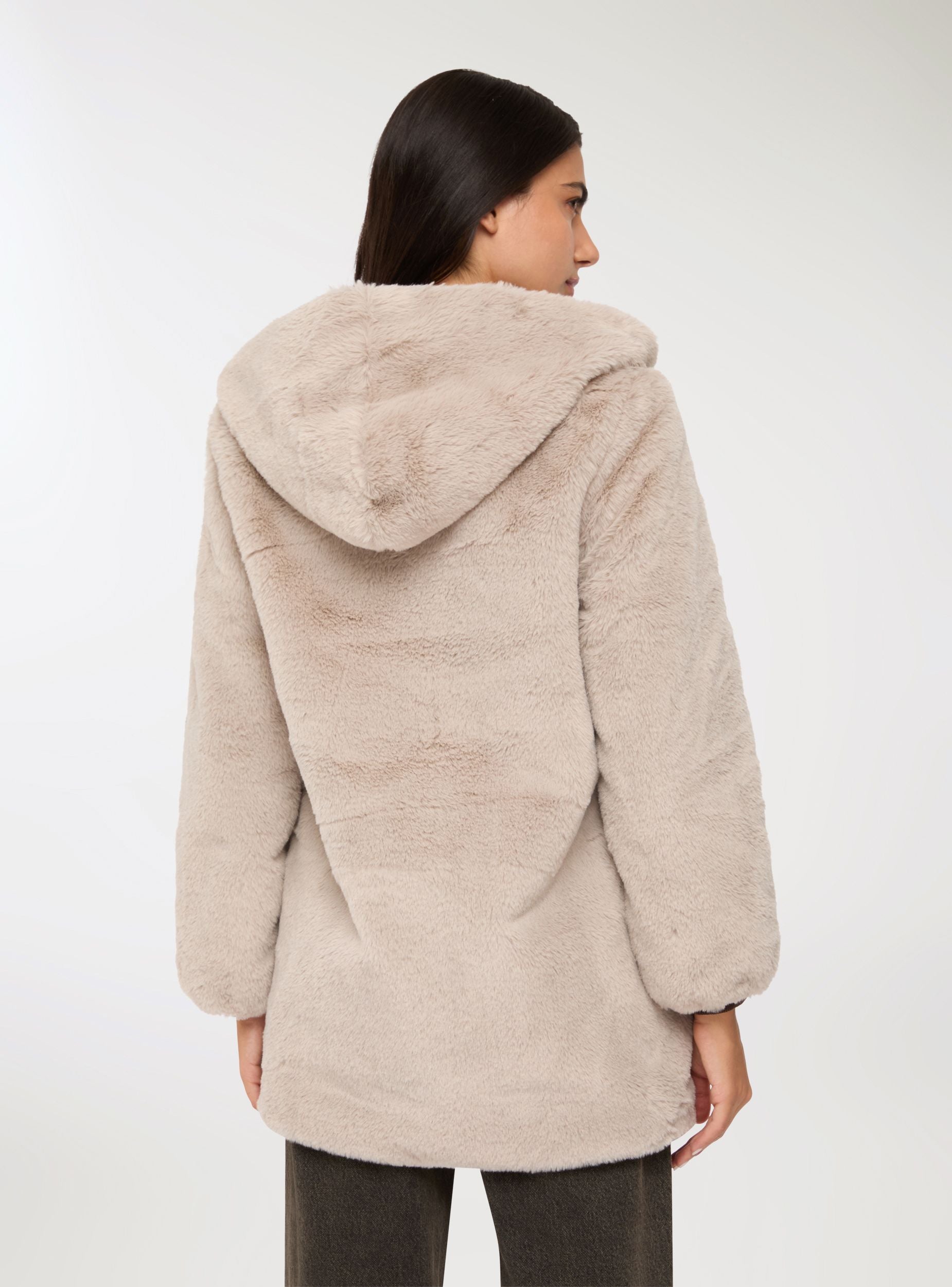 Cappotto da donna con cappuccio, dalla linea dritta e avvolgente, perfetto per affrontare le giornate più fredde con un tocco glamour. La lunghezza media lo rende ideale da indossare su pantaloni skinny o gonne aderenti per un look metropolitano. La zip frontale garantisce una chiusura pratica, mentre il design essenziale e la finitura in pelliccia sintetica donano stile anche alle uscite più informali. Completano il capo le tasche laterali, comode e funzionali.