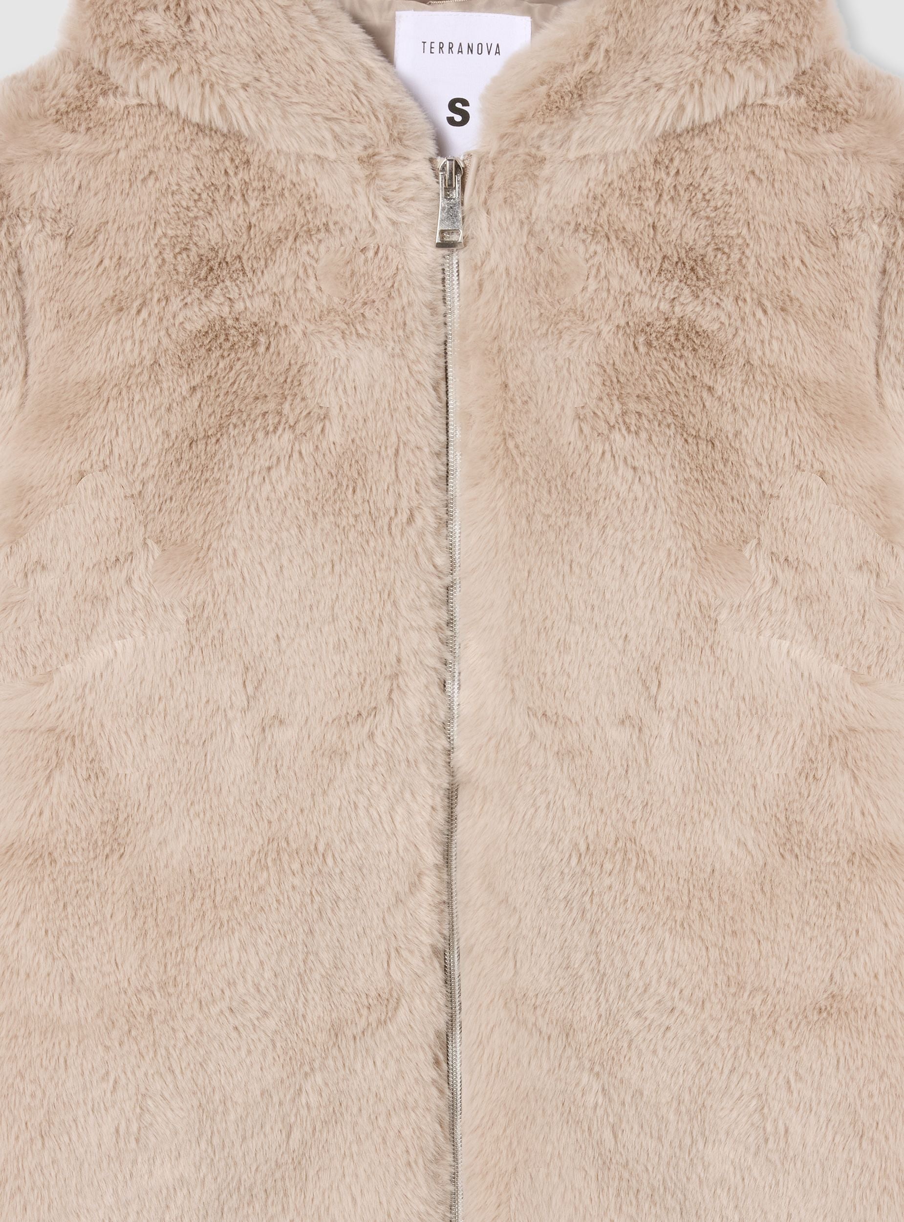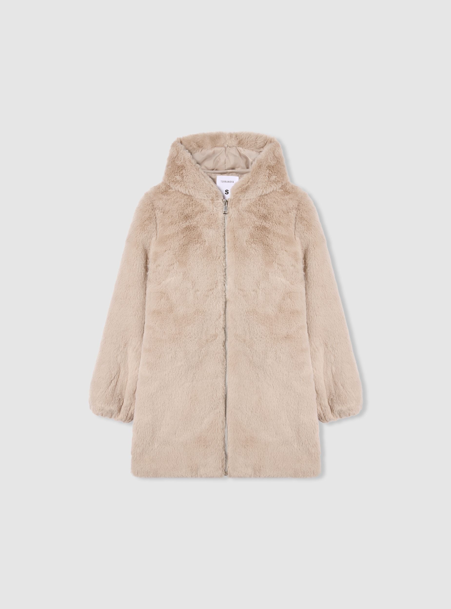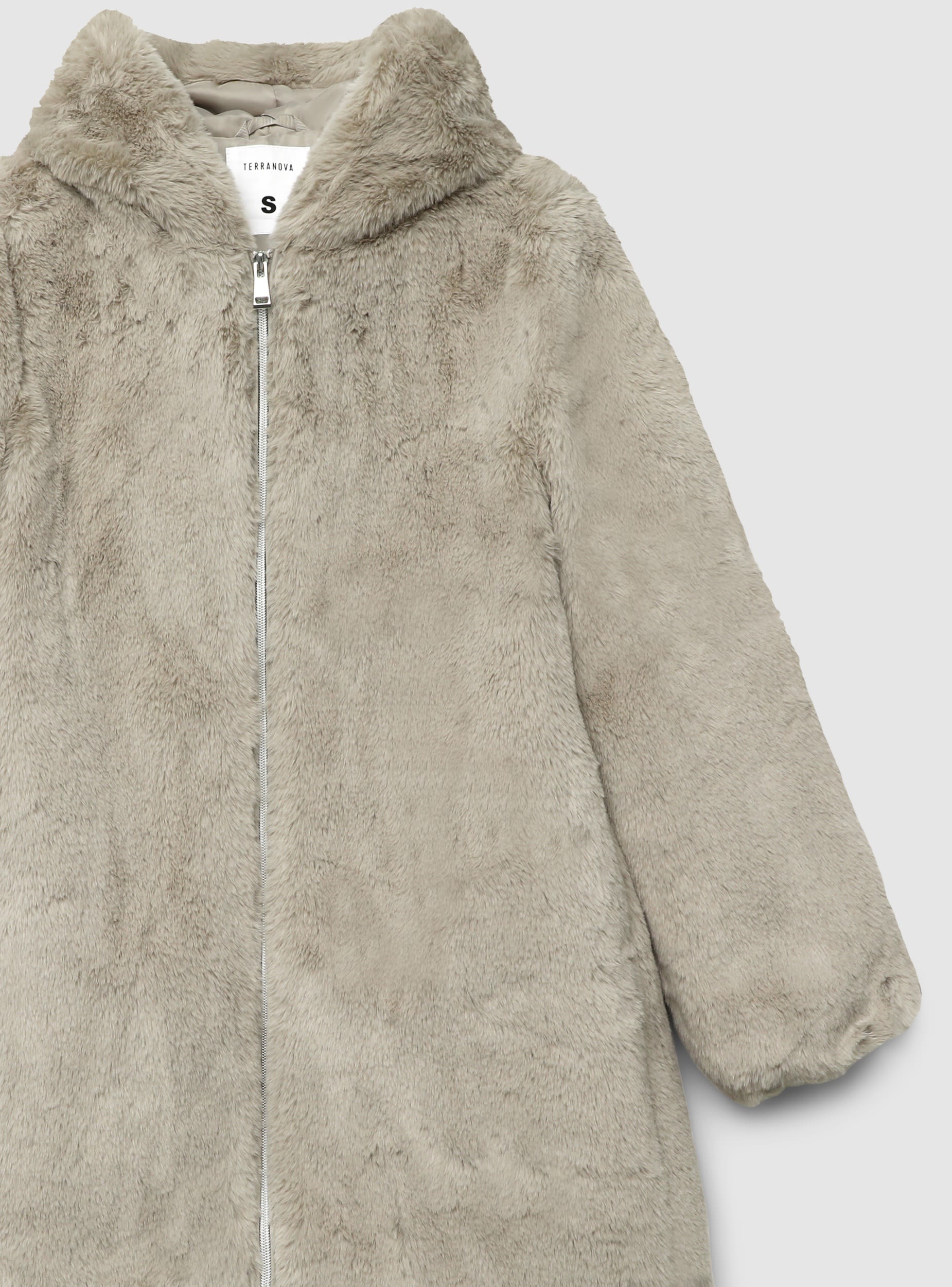 Cappotto da donna con cappuccio, dalla linea dritta e avvolgente, perfetto per affrontare le giornate più fredde con un tocco glamour. La lunghezza media lo rende ideale da indossare su pantaloni skinny o gonne aderenti per un look metropolitano. La zip frontale garantisce una chiusura pratica, mentre il design essenziale e la finitura in pelliccia sintetica donano stile anche alle uscite più informali. Completano il capo le tasche laterali, comode e funzionali.