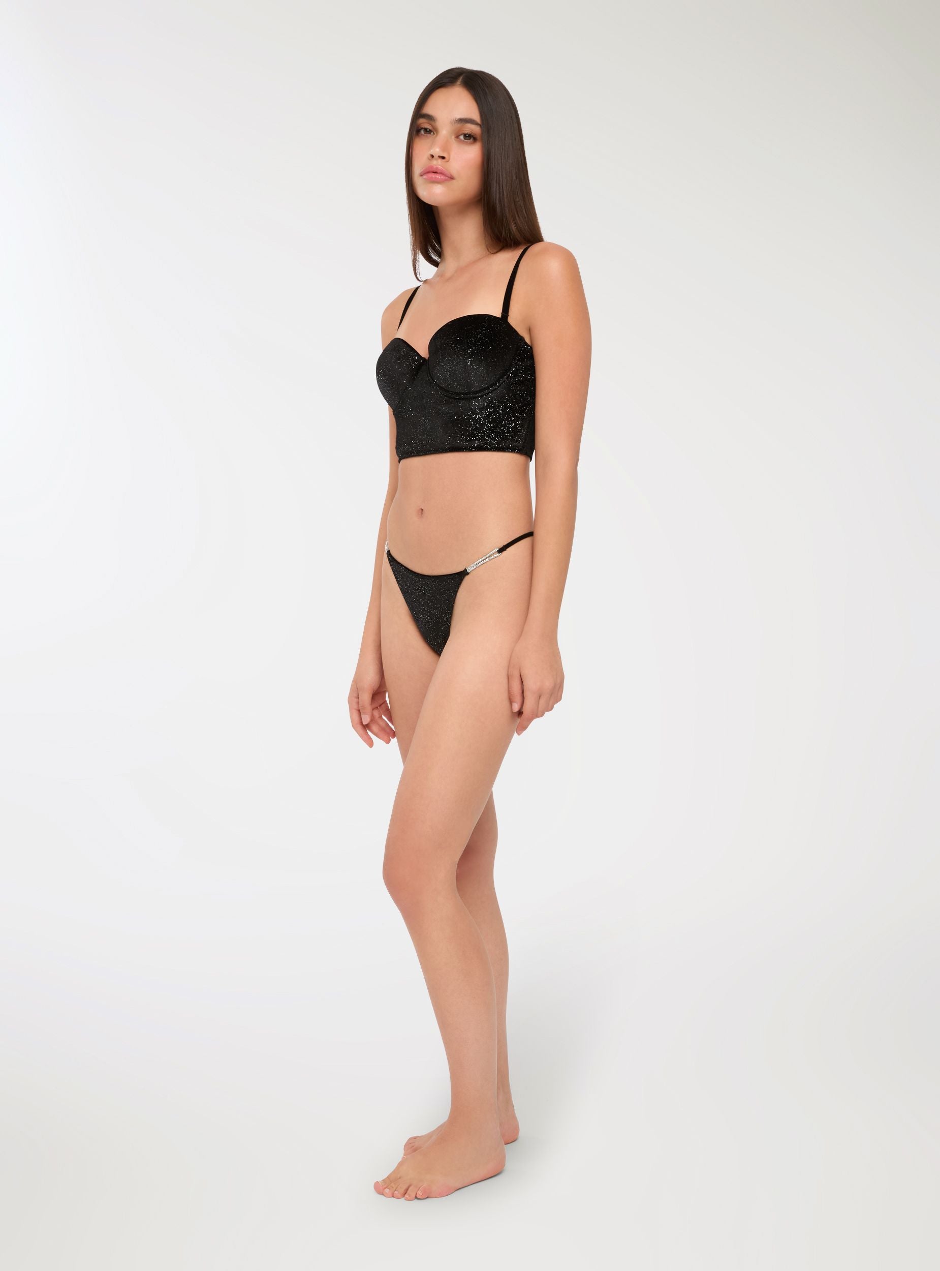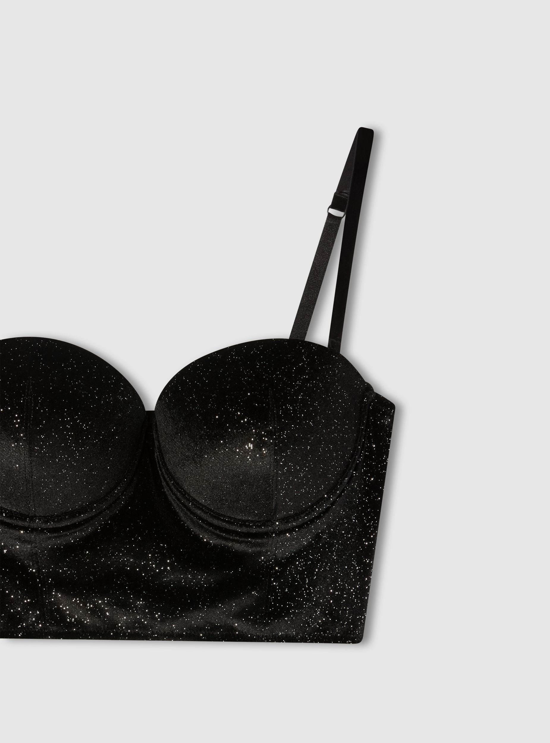 Corsetto da donna con coppe preformate, ideale per valorizzare la silhouette. Perfetto per occasioni serali o eventi speciali, grazie al suo design elegante e all'effetto luccicante che aggiunge un tocco di glamour. Dotato di spalline regolabili per un comfort personalizzato e una vestibilitá ottimale. Un capo versatile che si abbina facilmente a diversi outfit, donando un look sofisticato.