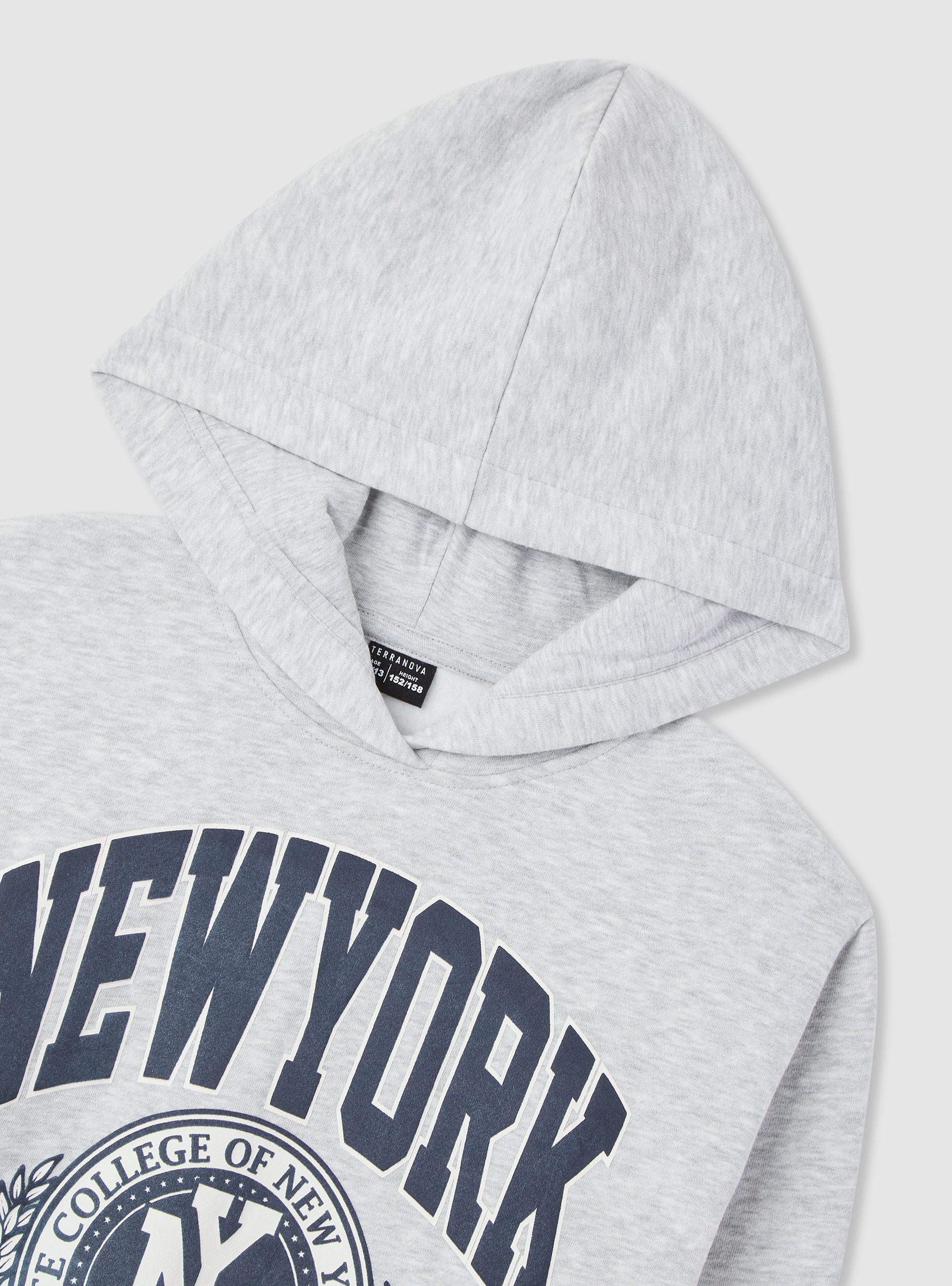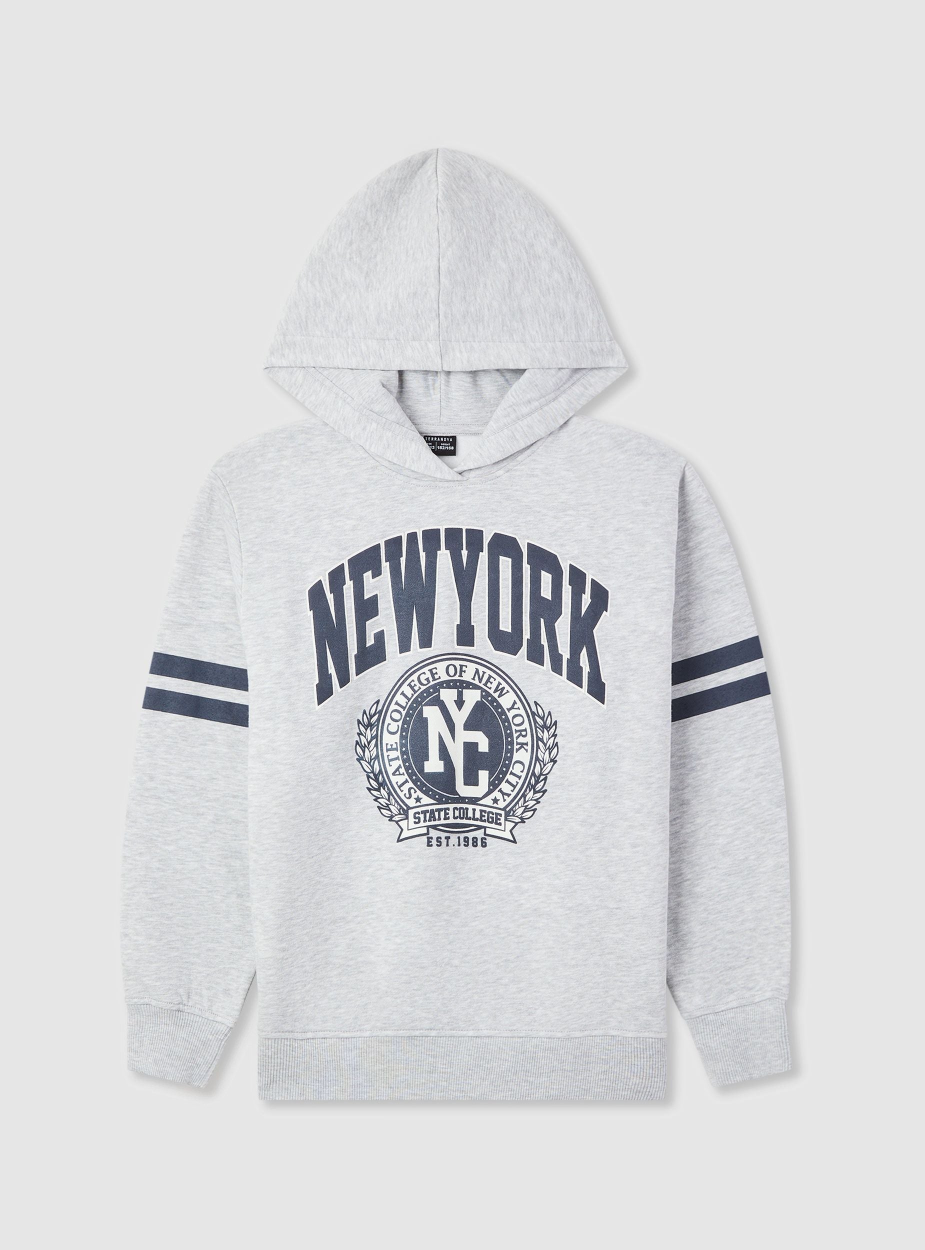Felpa pesante da bambino con cappuccio, ideale per un look casual e sportivo. Presenta una stampa college sul davanti che aggiunge un tocco di stile. Le maniche lunghe con bande e il design con cappuccio la rendono perfetta per le giornate fresche. Può essere abbinata a jeans o pantaloni sportivi per un outfit comodo e alla moda.