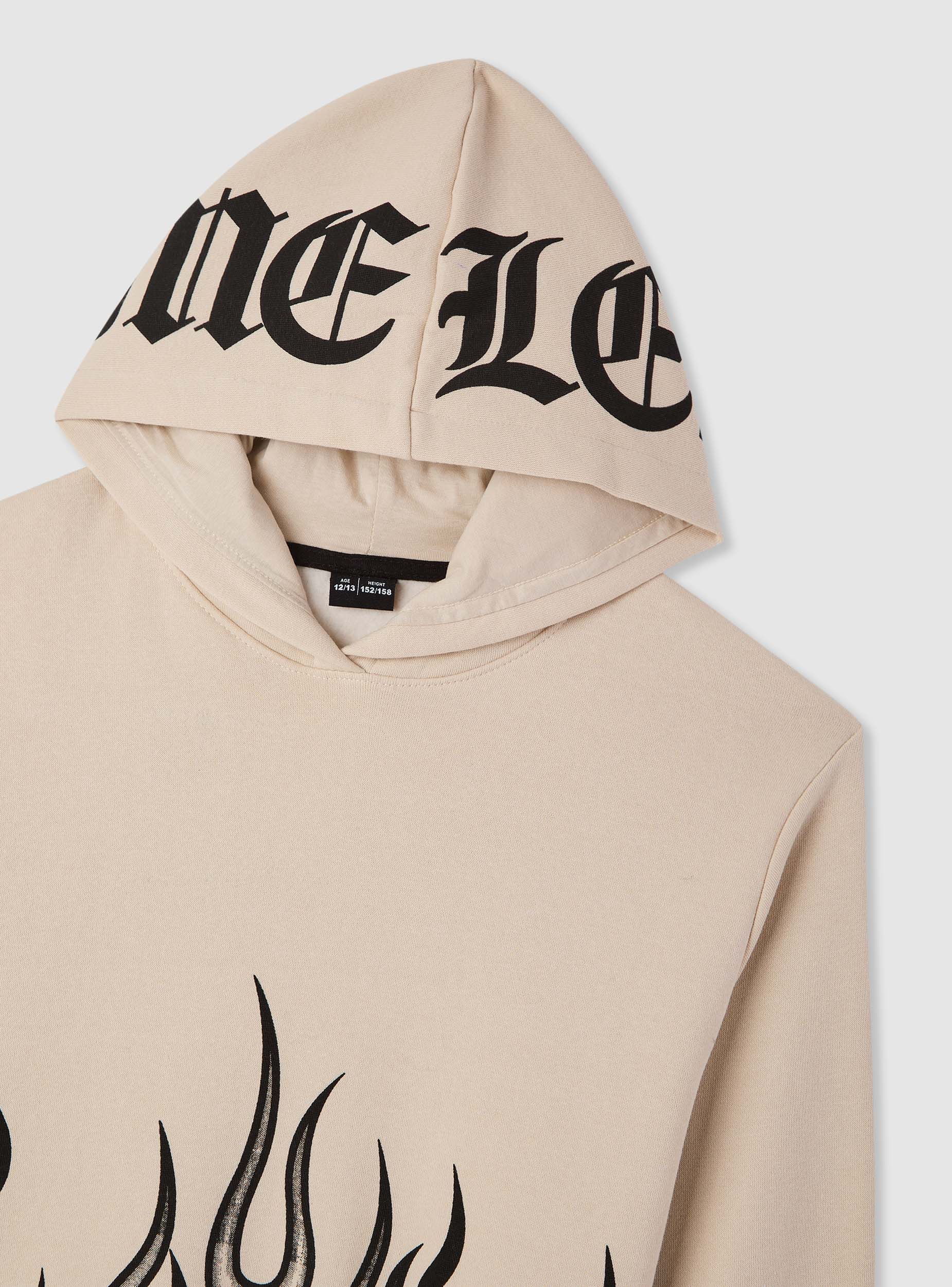 Felpa da bambino con cappuccio, ideale per il tempo libero e look urban. Modello con maniche lunghe, fondo e polsi a costine per una vestibilità confortevole. Stampa fiamme posizionata su fronte e retro, lettering sul cappuccio per un tocco grintoso. Facile da abbinare a jeans o pantaloni jogger e sneakers per outfit quotidiani dal carattere deciso.