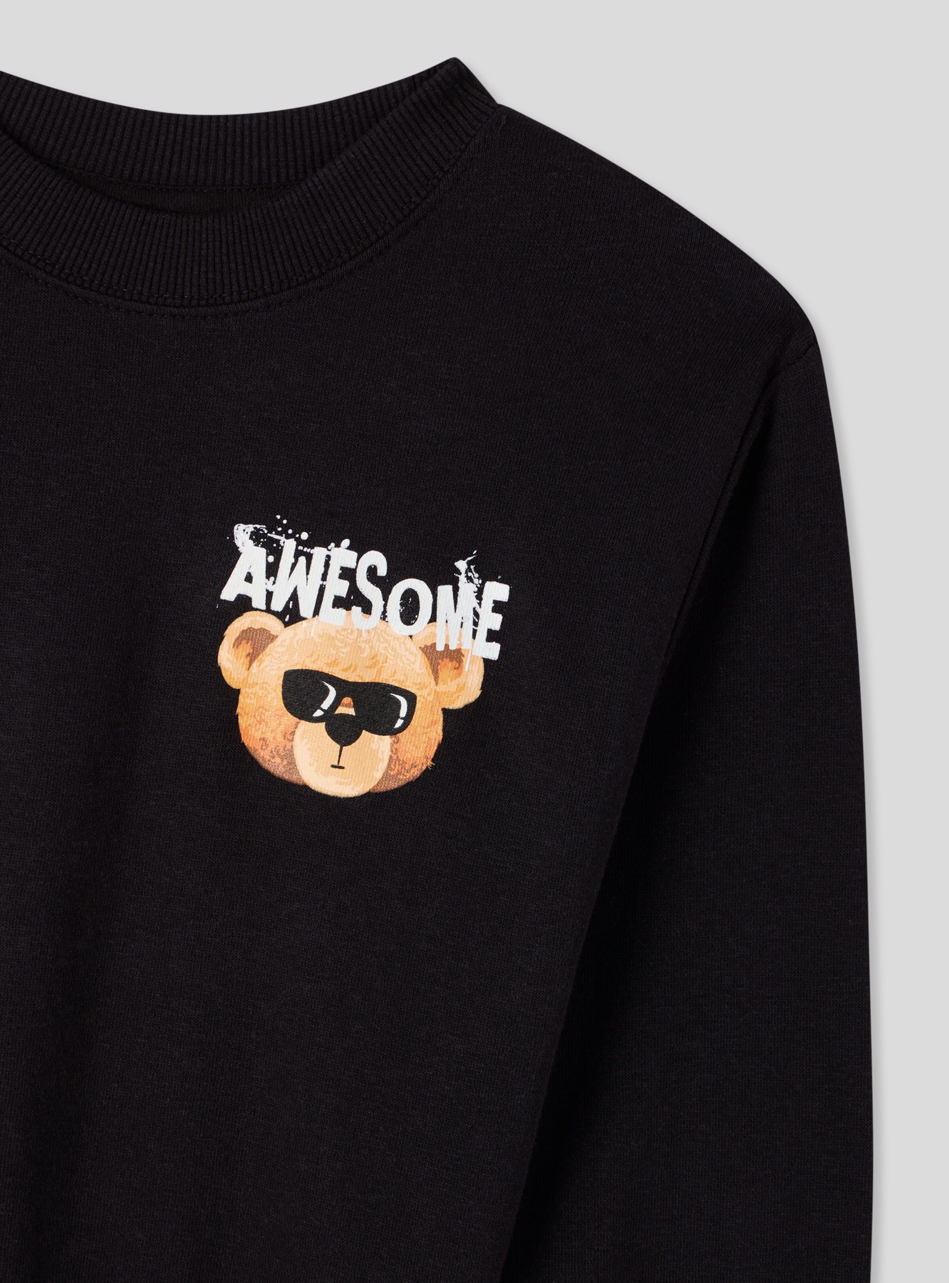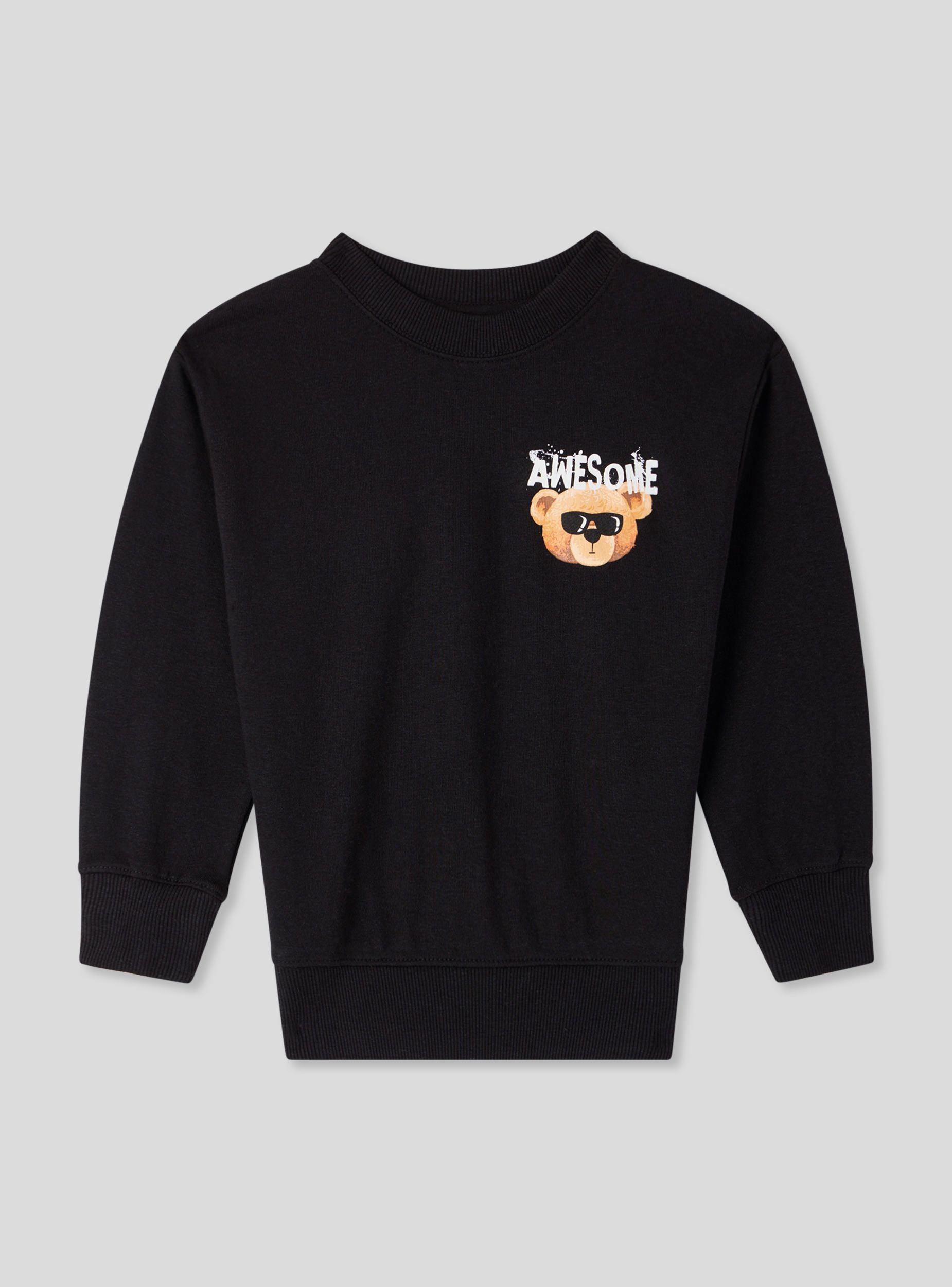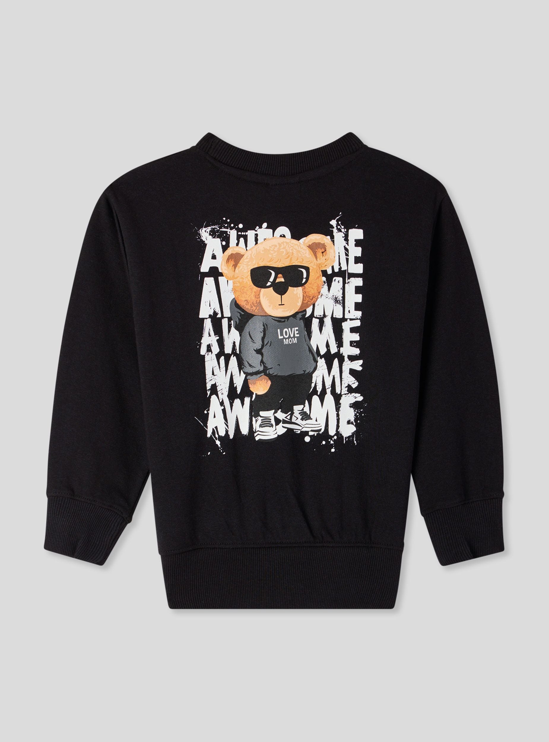 Felpa leggera da bimbo ideale per il tempo libero, caratterizzata da una stampa con orsetto e scritta sul davanti e sul retro. Il modello presenta maniche lunghe, girocollo e polsini a costine, offrendo una vestibilità confortevole e pratica. Perfetta da abbinare a jeans o pantaloni sportivi per un look giocoso e versatile, adatta a scuola e momenti di svago.