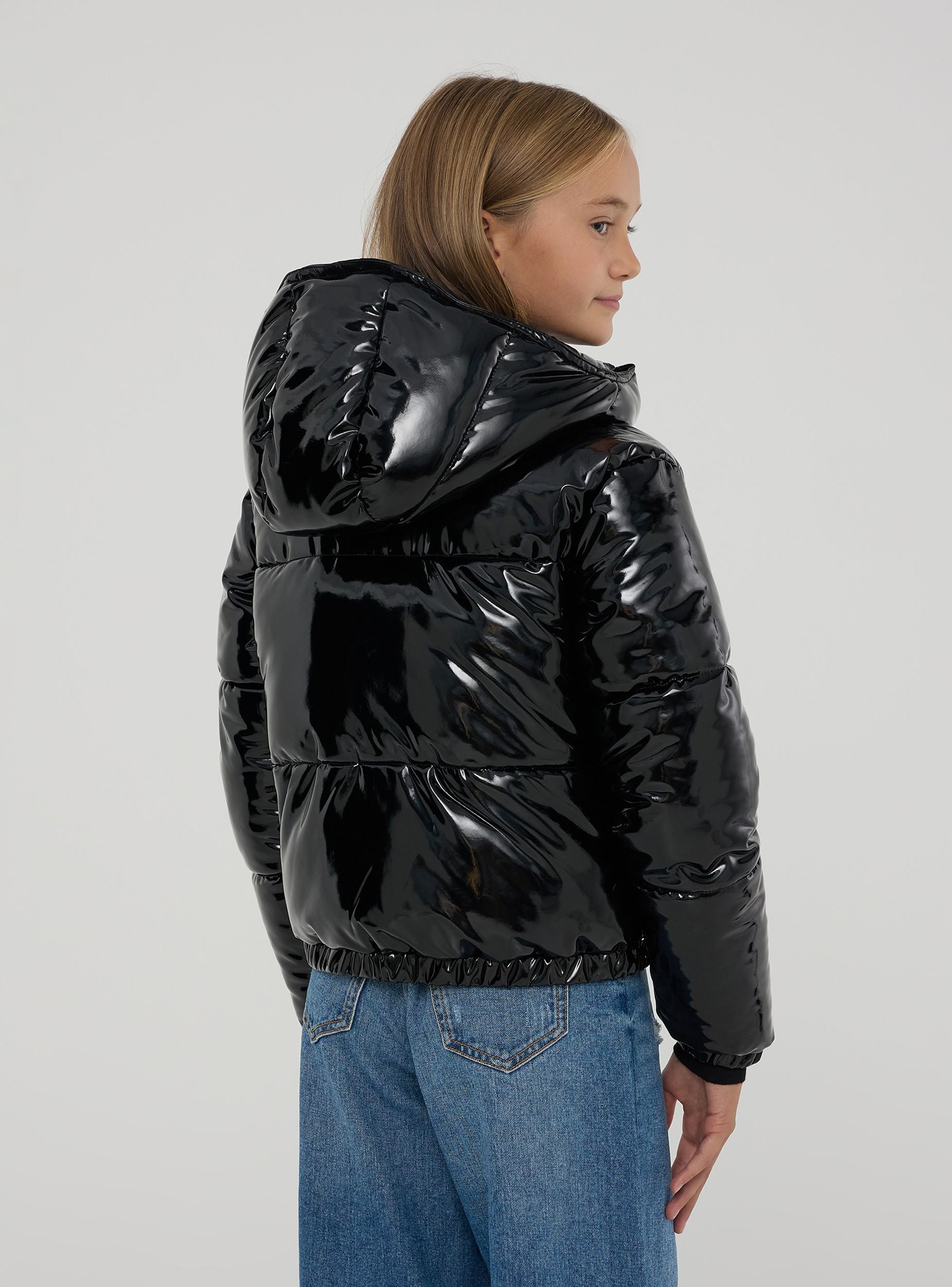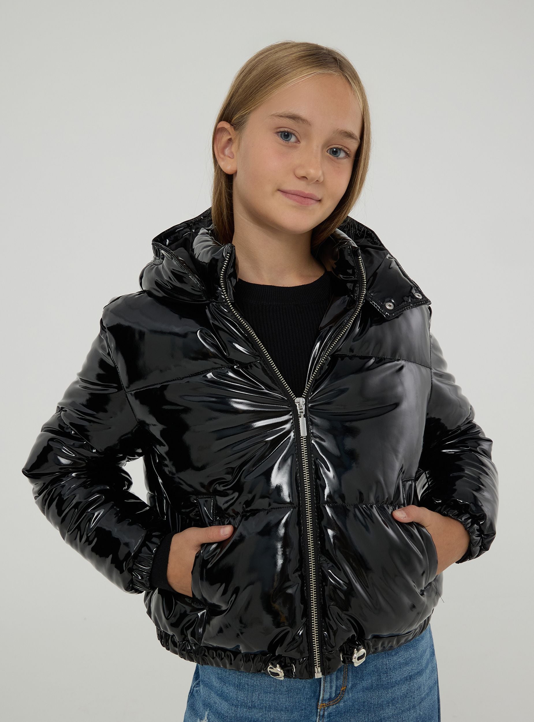 Giubbotto crop imbottito da bambina. Perfetto per l'inverno, con un design che include un cappuccio e dettagli funzionali come elastici con stopper per una migliore vestibilità e protezione. Chiusura frontale con zip, collo alto con bottoni per una maggior protezione contro il freddo. La finitura è lucida, effetto vinile, dando un aspetto moderno e alla moda.