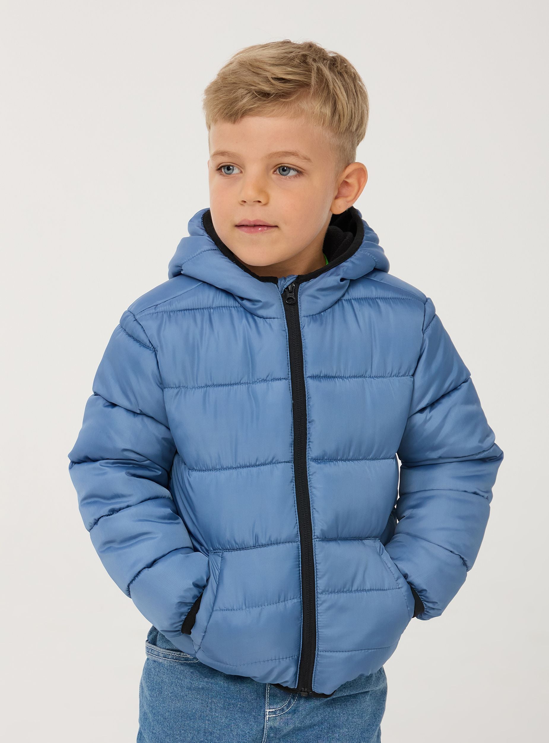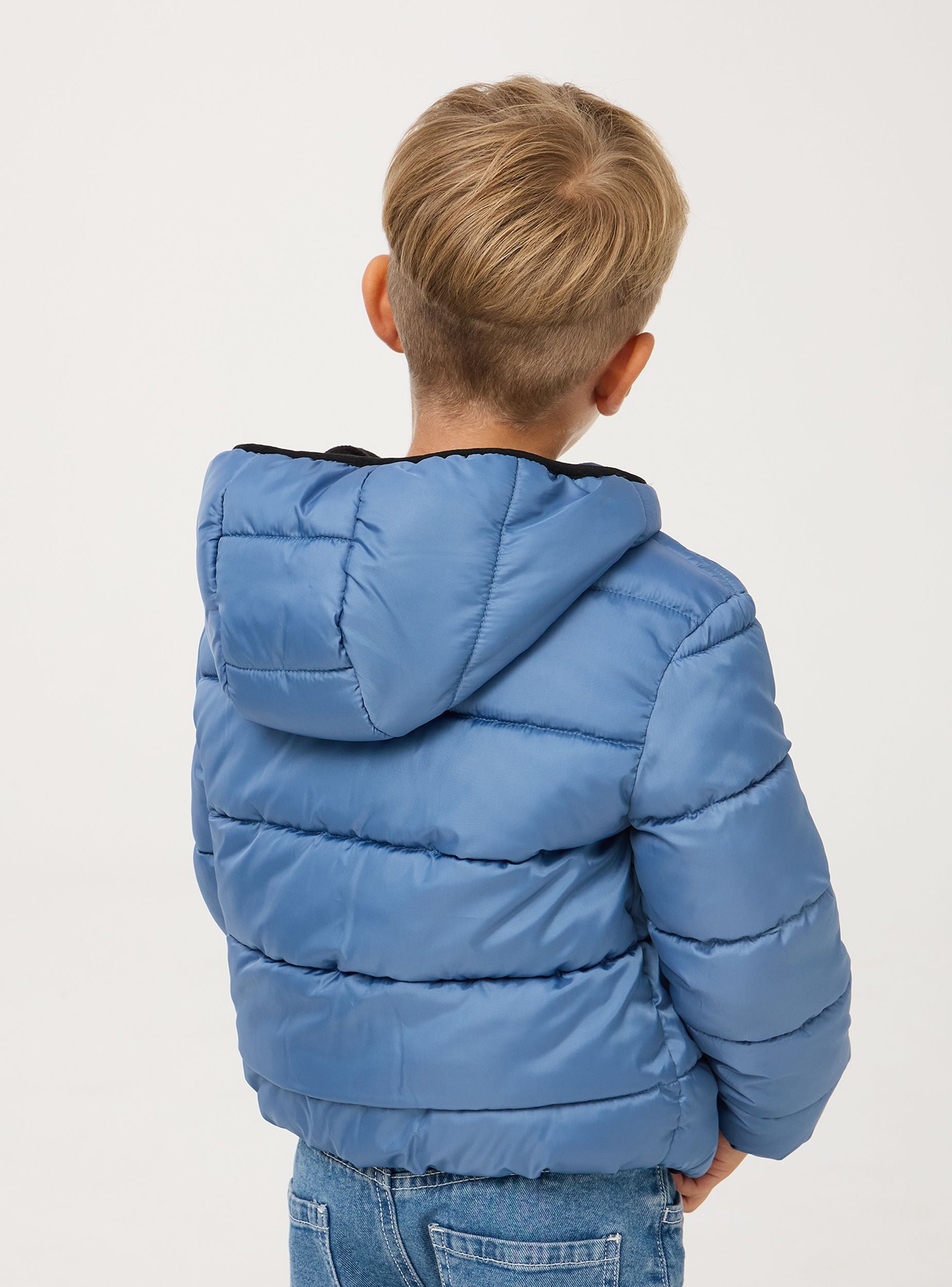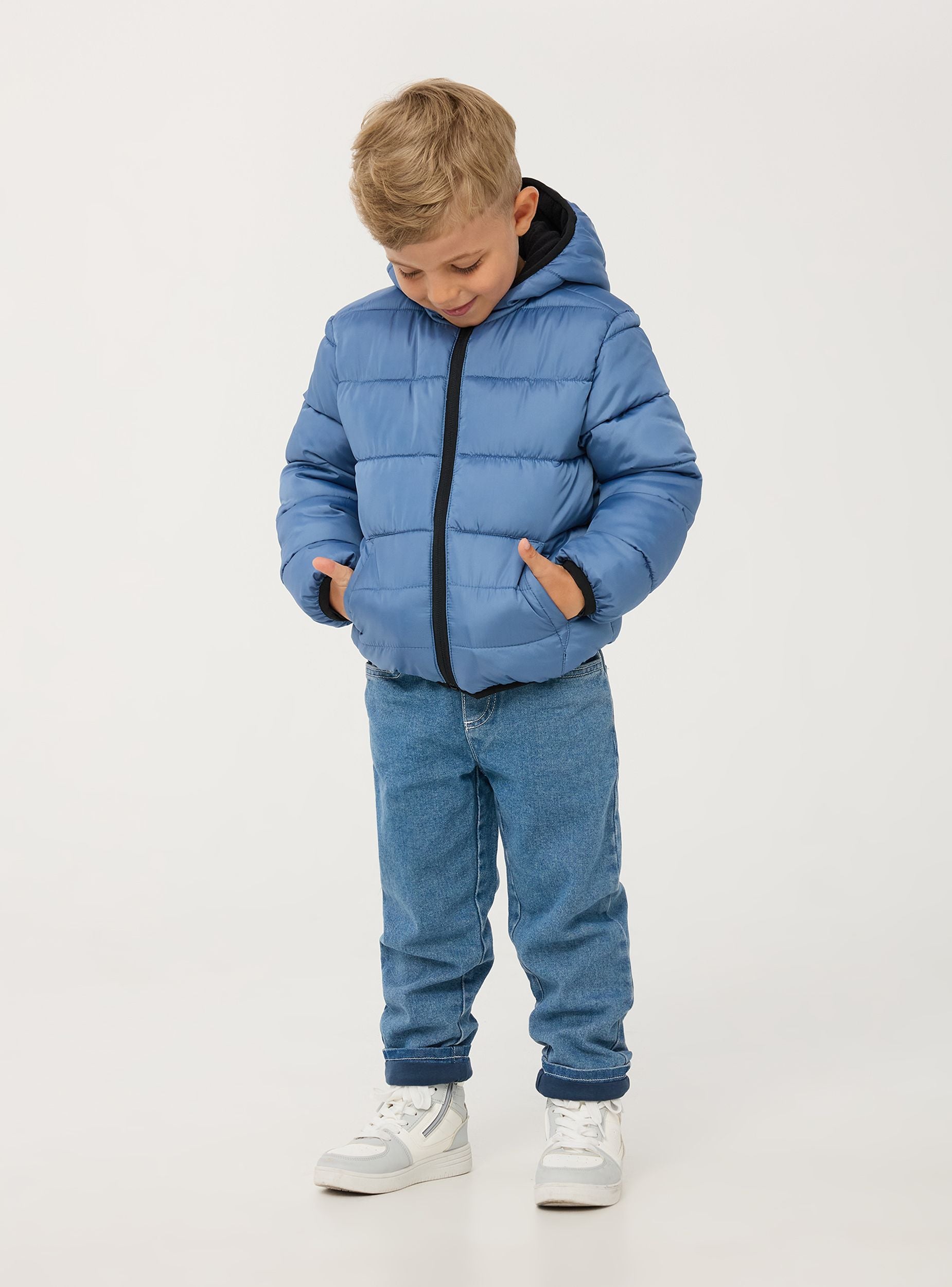 Giubbotto imbottito pesante corto da bambino. Superficie liscia e finitura lucida. Design con cappuccio integrato e zip frontale a tutta lunghezza. Cuciture orizzontali trapuntate aggiungono un tocco sportivo. La vestibilità è comoda, perfetta per giornate casual invernali. Include due tasche laterali per praticità. Ideale per occasioni quotidiane, passeggiate in città o attività all'aperto.