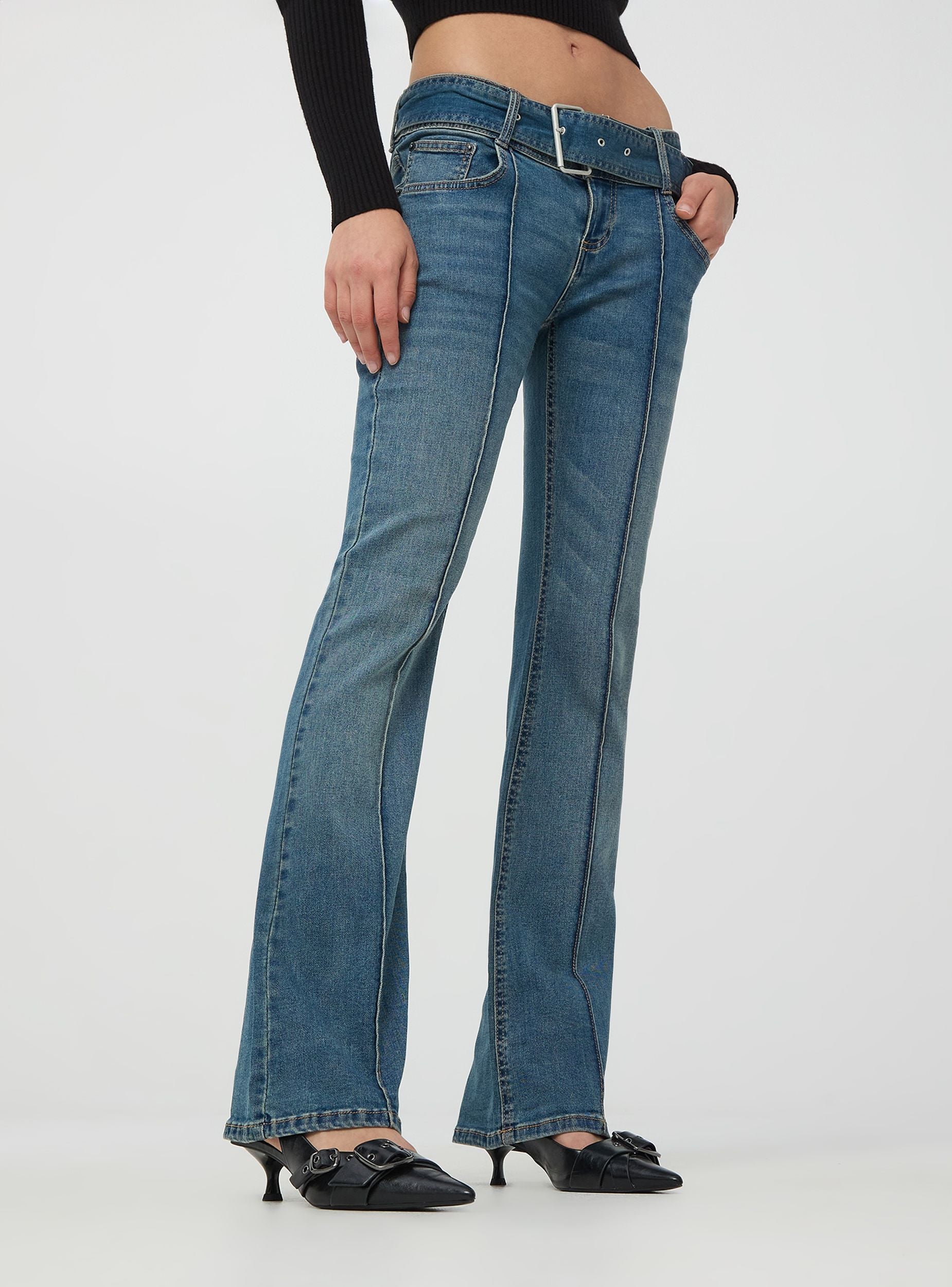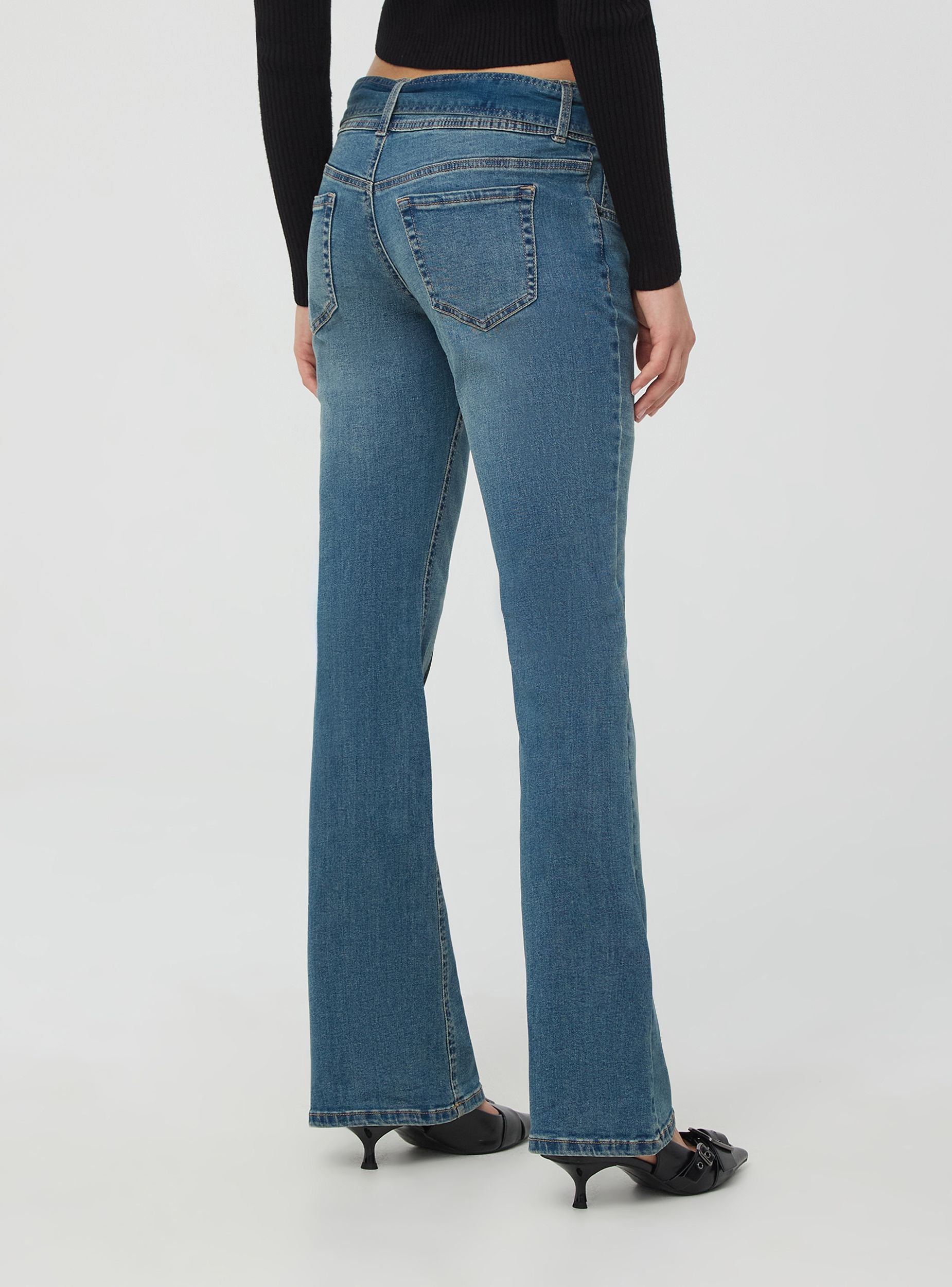 Questi jeans a zampa sono realizzati in resistente denim blu e si distinguono per le cuciture a vista lungo le gambe che aggiungono un tocco unico al design. Il modello presenta cinque tasche, una vita bassa con passanti per cintura e si chiude con zip e bottone. Dotati di cintura in denim in vita. La vestibilità è aderente fino al ginocchio per poi allargarsi a campana, perfetta per un look casual chic.