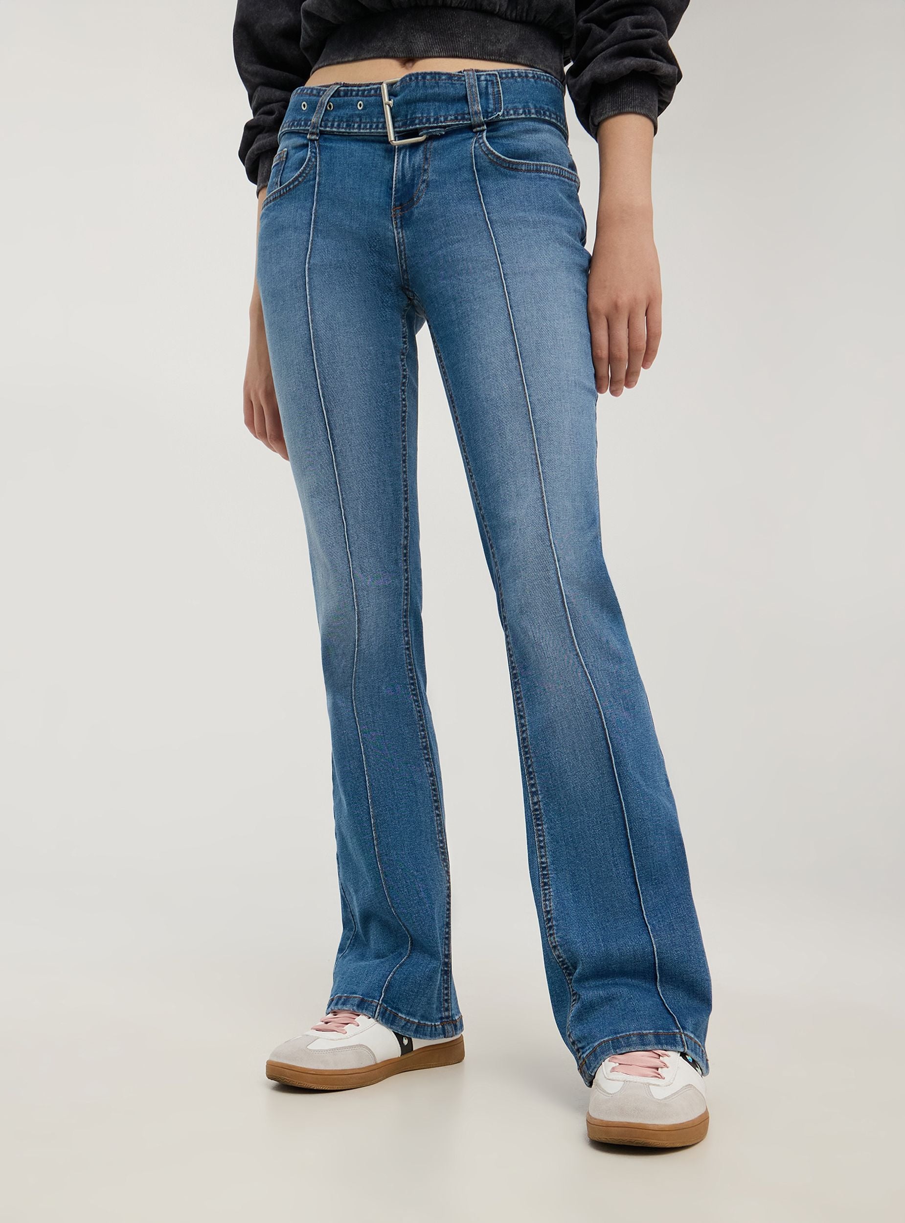 Questi jeans a zampa sono realizzati in resistente denim di cotone blu, perfetti per un look casual-chic. Caratterizzati da una cintura integrata con fibbia in metallo, offrono una vestibilità slim sui fianchi che si allarga delicatamente a partire dal ginocchio. Le cuciture in contrasto lungo le gambe conferiscono un tocco di stile unico, mentre le tasche frontali e posteriori aggiungono praticità.Dettagli