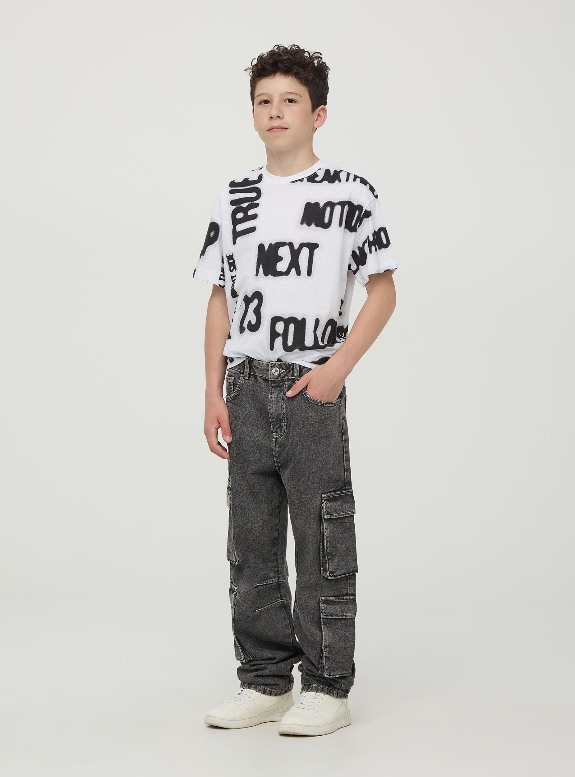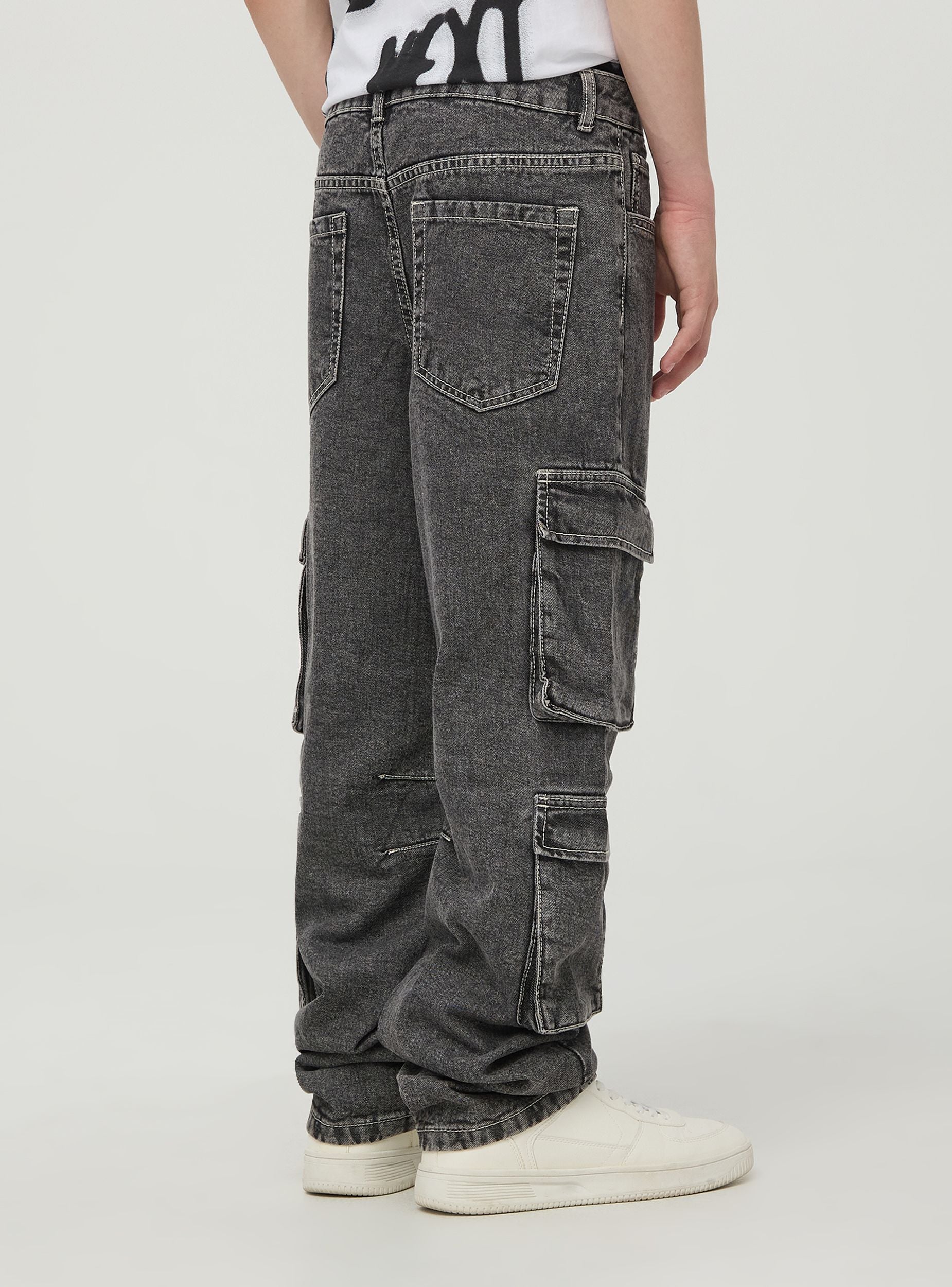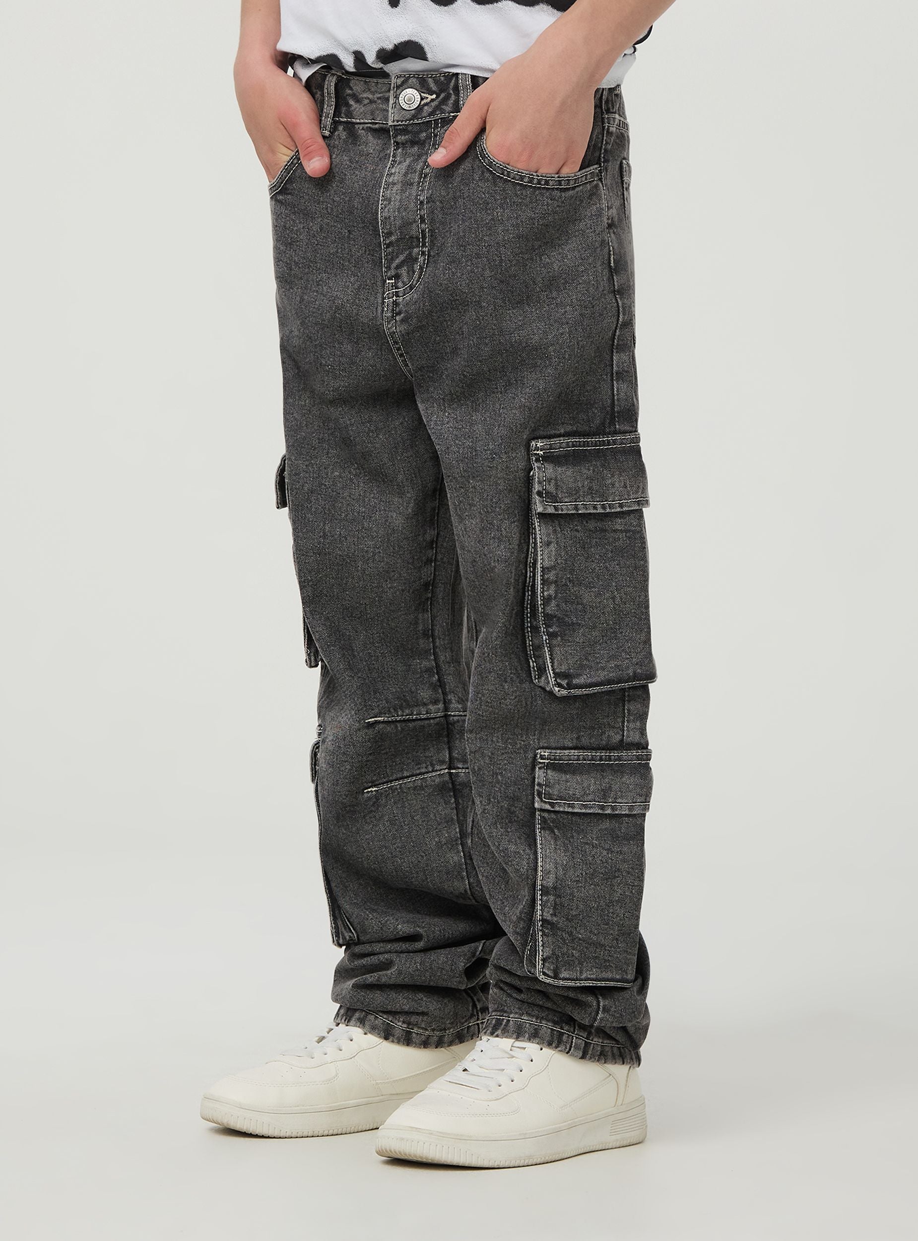 Jeans cargo da bambino in denim grigio effetto acid wash realizzati con cotone combinano stile e funzionalità. Dotati di ampie tasche laterali con patta, cuciture rinforzate sulle ginocchia e chiusura a bottone con zip, offrono una vestibilità comoda e un look casual perfetto per l'uso quotidiano e attività all'aria aperta.Dettagli
