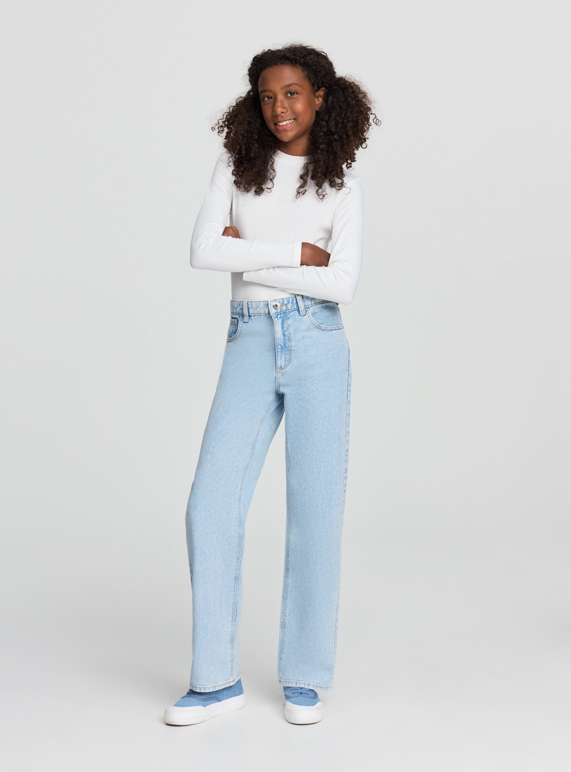 Jeans da bambina con design wide leg, ideali per un look casual e moderno. Presentano una chiusura con bottone e zip, tasche anteriori e posteriori per praticità. Perfetti per essere abbinati a magliette o felpe per un outfit comodo e alla moda. Adatti per diverse occasioni, dal tempo libero alle uscite con gli amici.