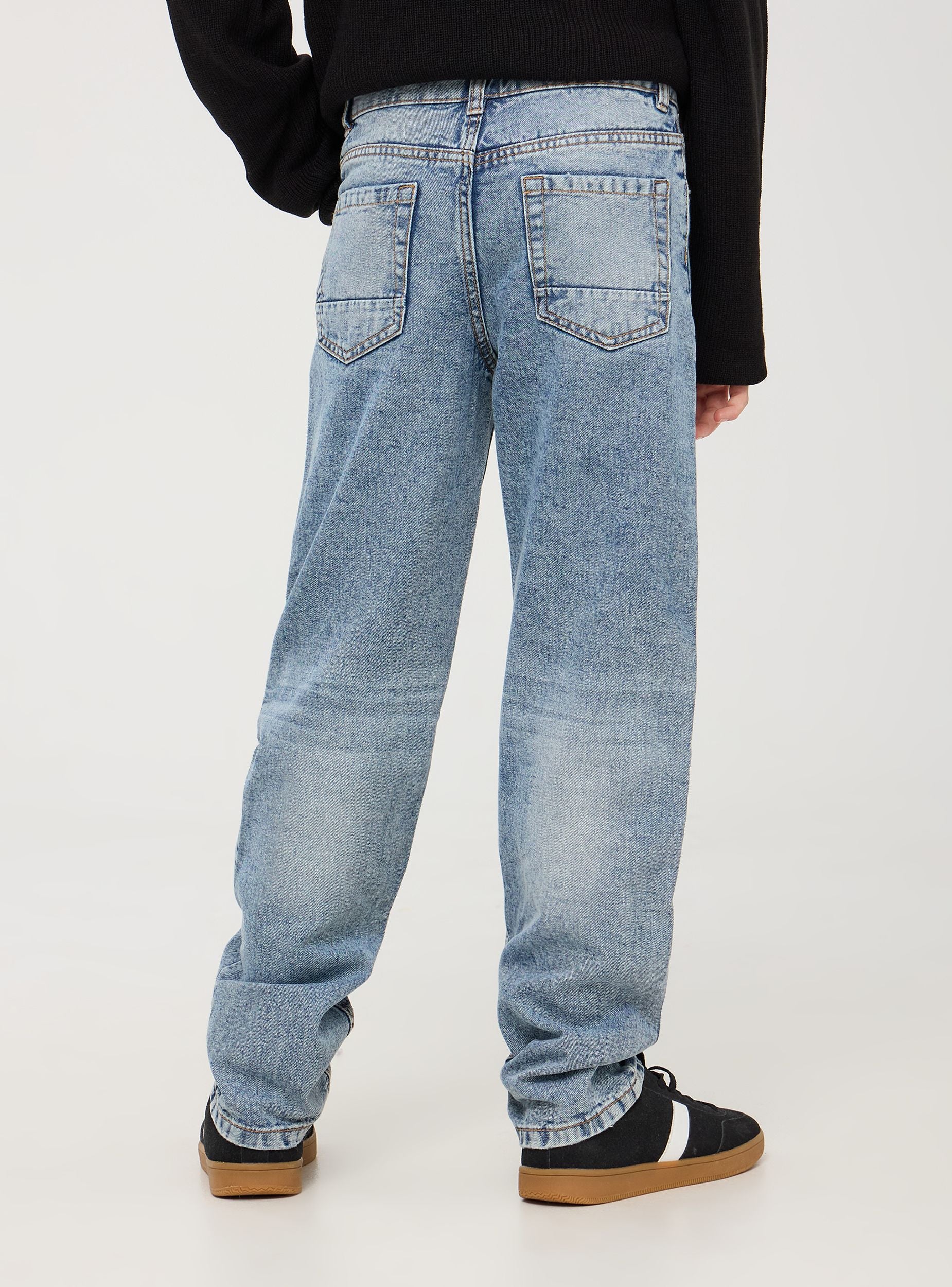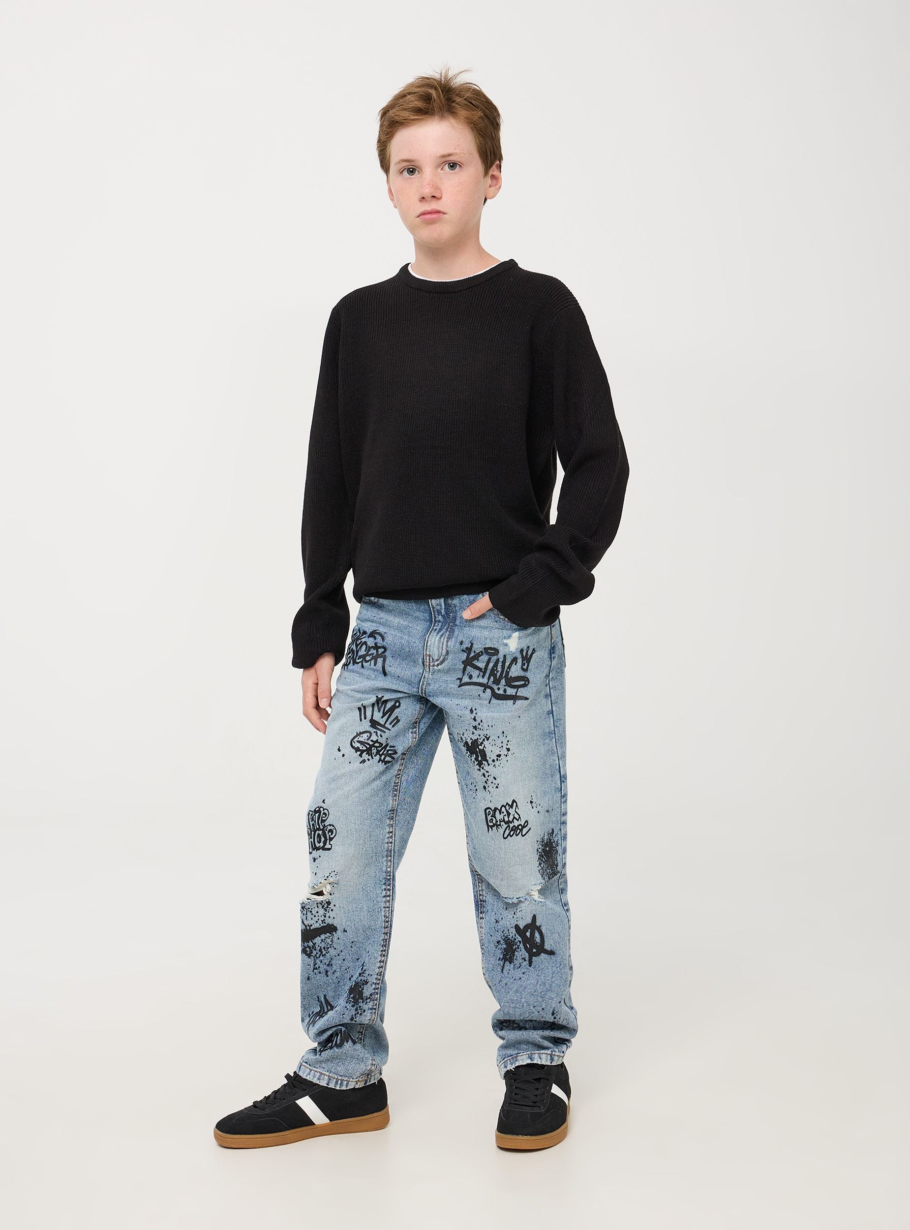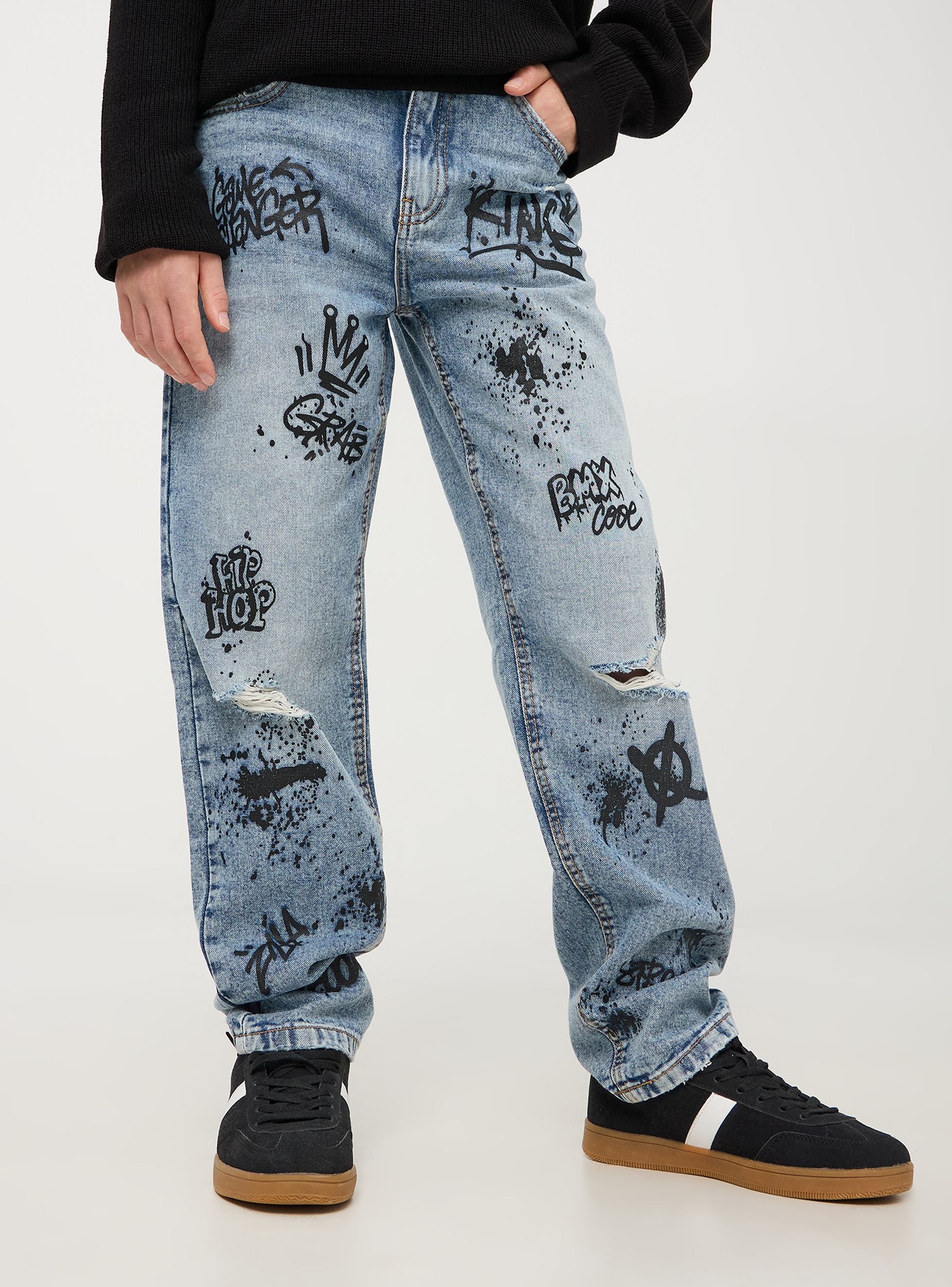 Jeans da bambino con design graffiti, caratterizzati da scritte e disegni in stile urban distribuiti su tutta la superficie frontale, e dettagli di strappi. Il modello presenta una chiusura con bottone e zip, cinque tasche funzionali e una vestibilità comoda. Ideali per un look casual e moderno, perfetti per esprimere uno stile unico e alla moda.