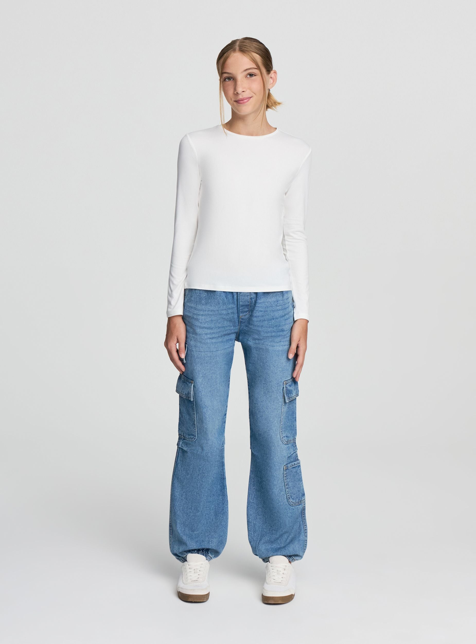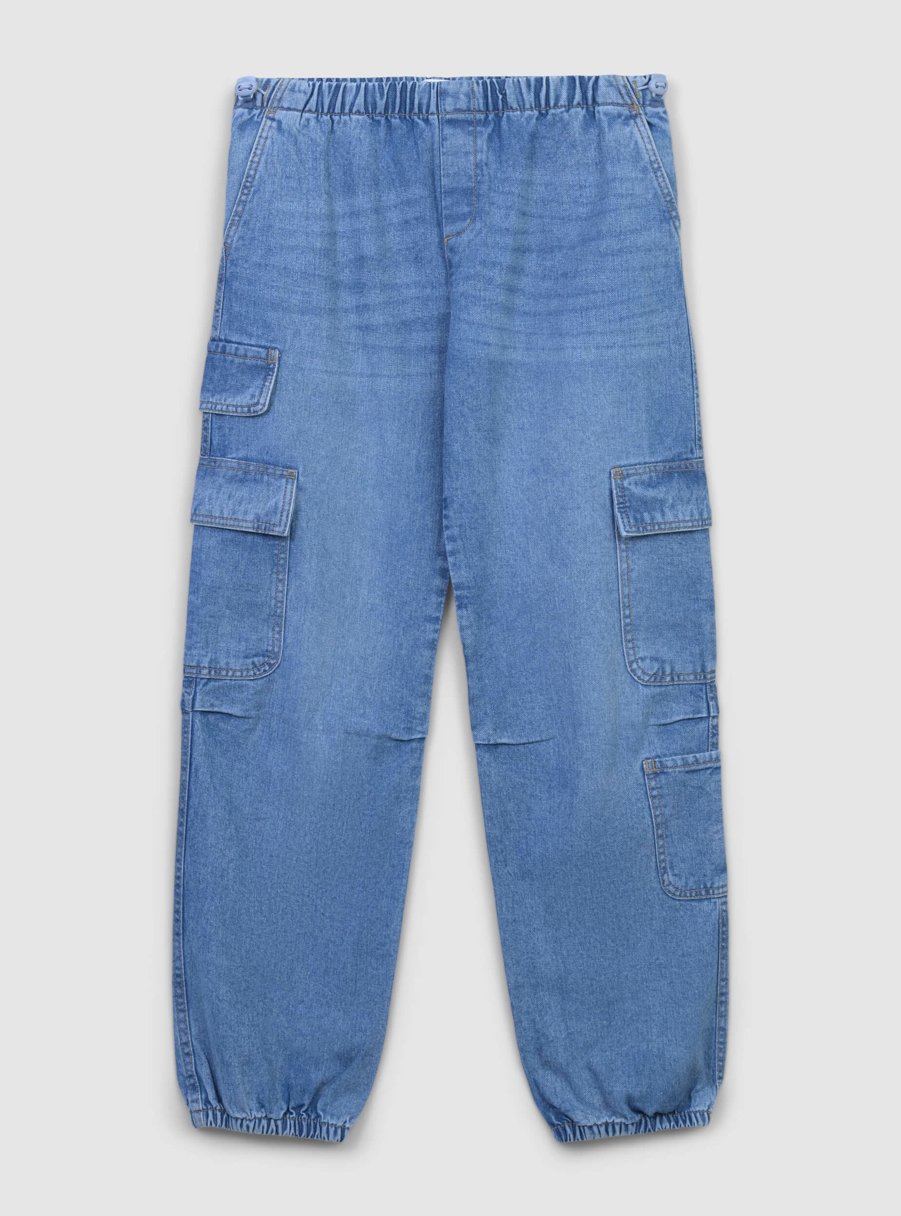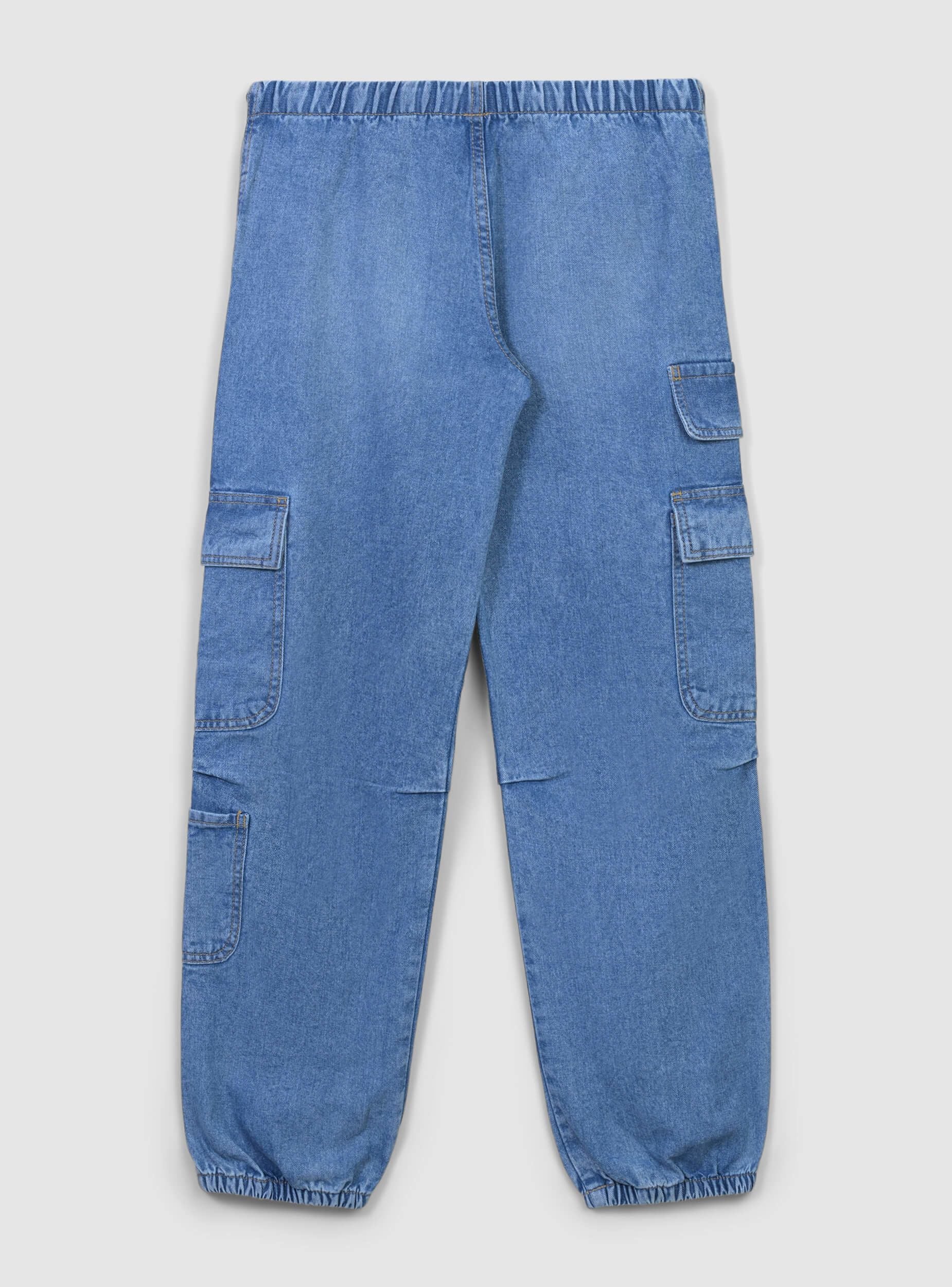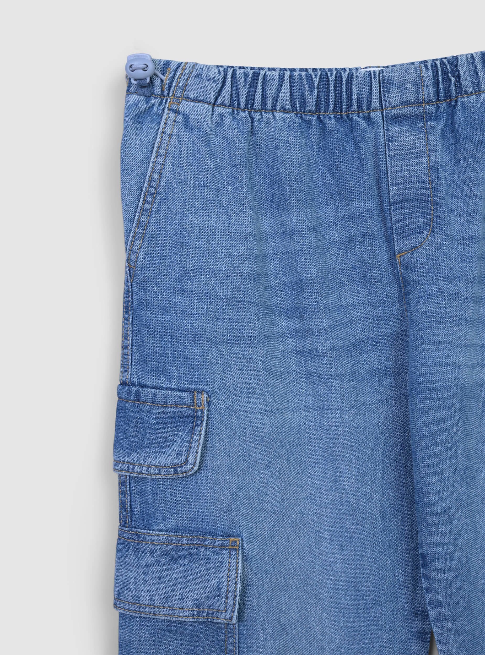 Jeans da bambina dal taglio ampio, ideali per un look casual e versatile. Presentano vita elasticizzata per il massimo comfort e tasche cargo applicate sui lati che aggiungono un tocco pratico e di tendenza. Il fondo gamba elasticizzato valorizza la silhouette e li rende perfetti da abbinare a sneakers o felpe per il tempo libero.