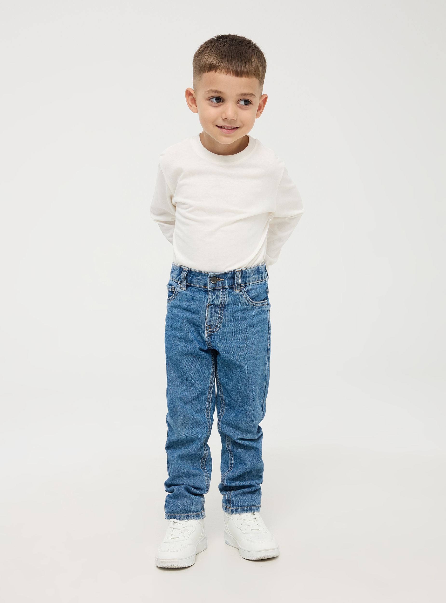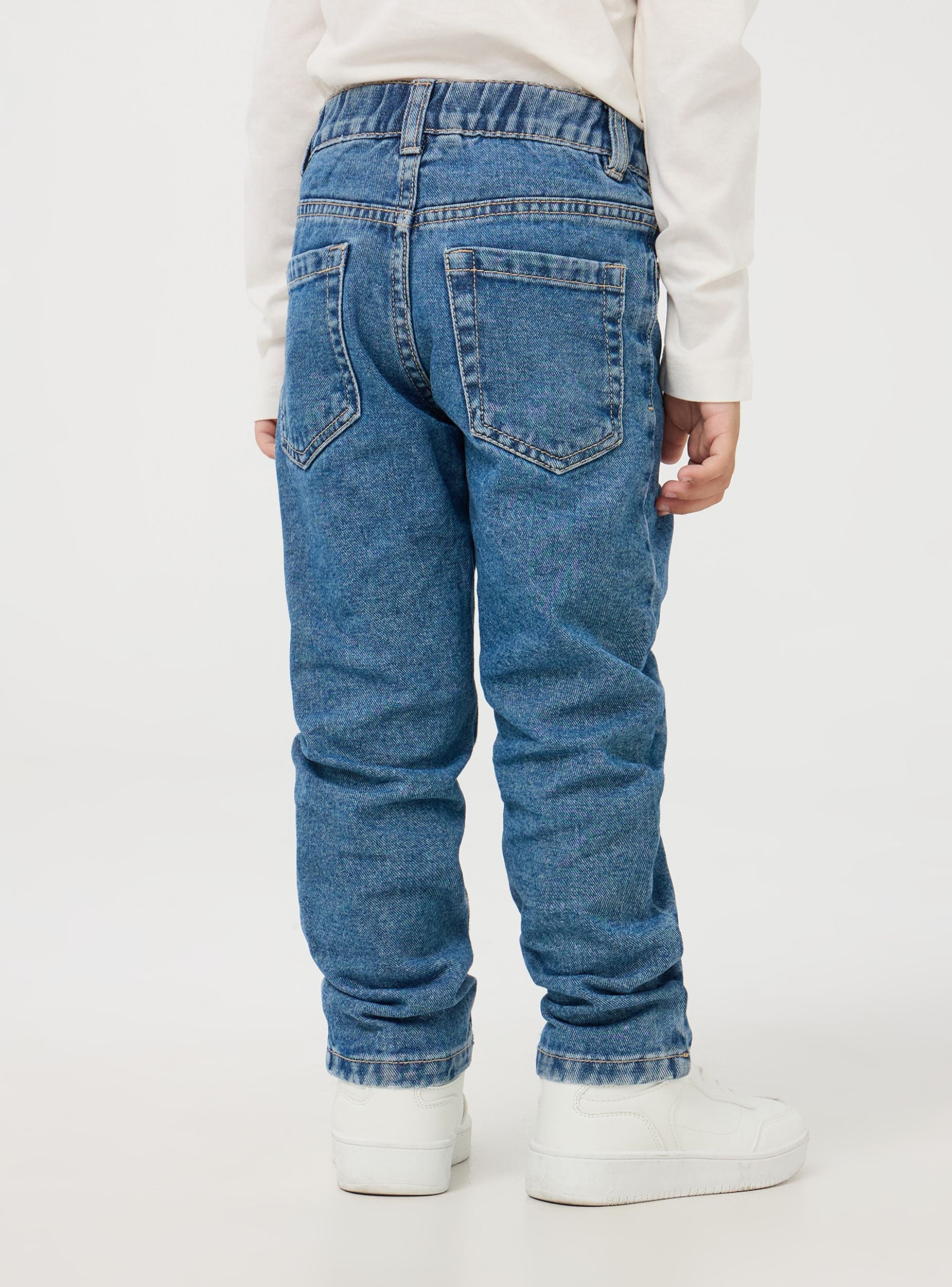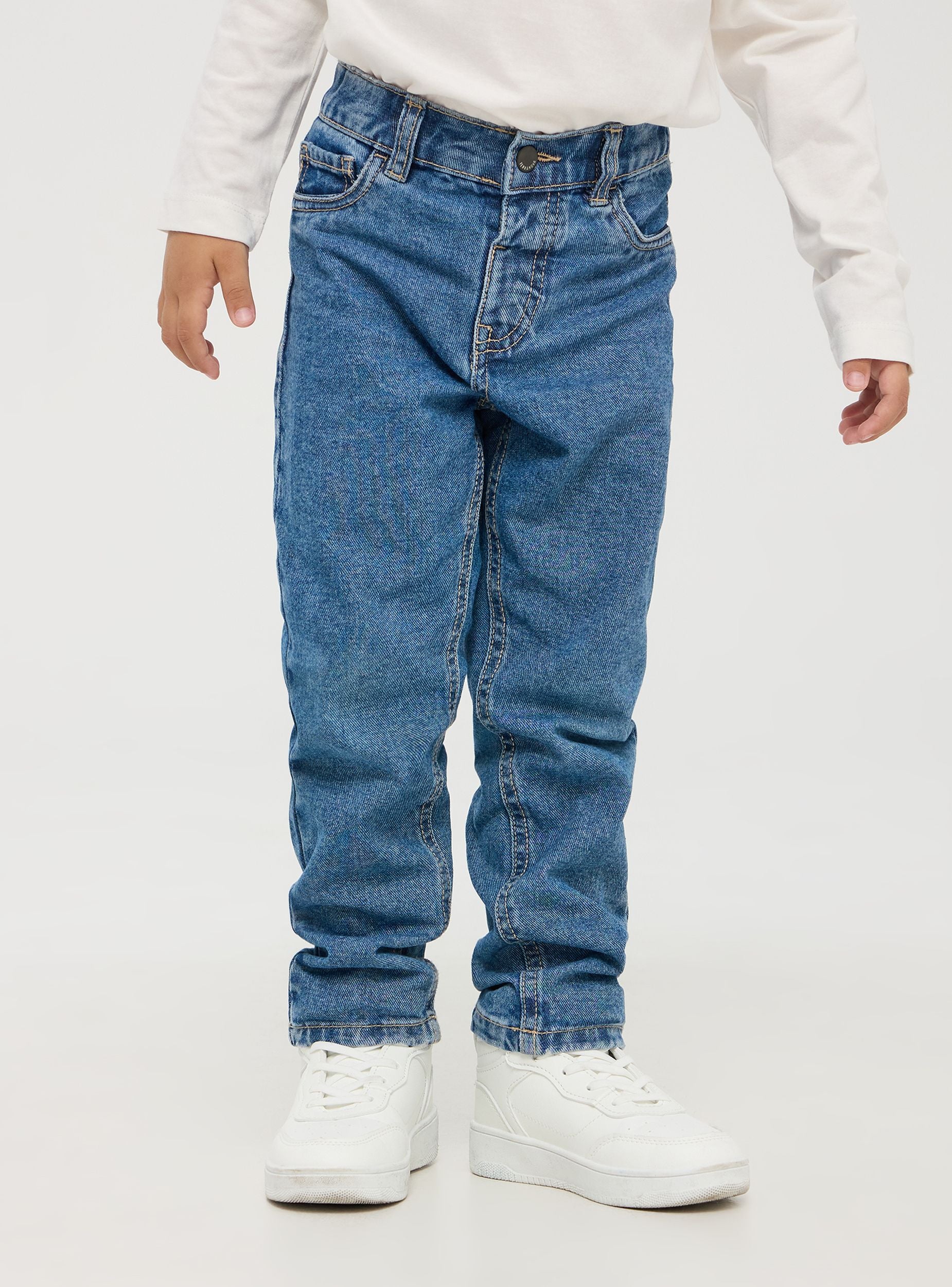 Jeans per bimbo in resistente denim di cotone, questi jeans blu offrono un look versatile e senza tempo. Presentano un taglio dritto, cuciture a contrasto e una chiusura con bottone, dotati di elastico in vita. Modello con tasche frontali fine e due tasche posteriori. Questi jeans combinano stile e praticità, risultando ideali per occasioni casual e giornate scolastiche o all'asilo. La vestibilità regolare garantisce comfort e libertà di movimento.