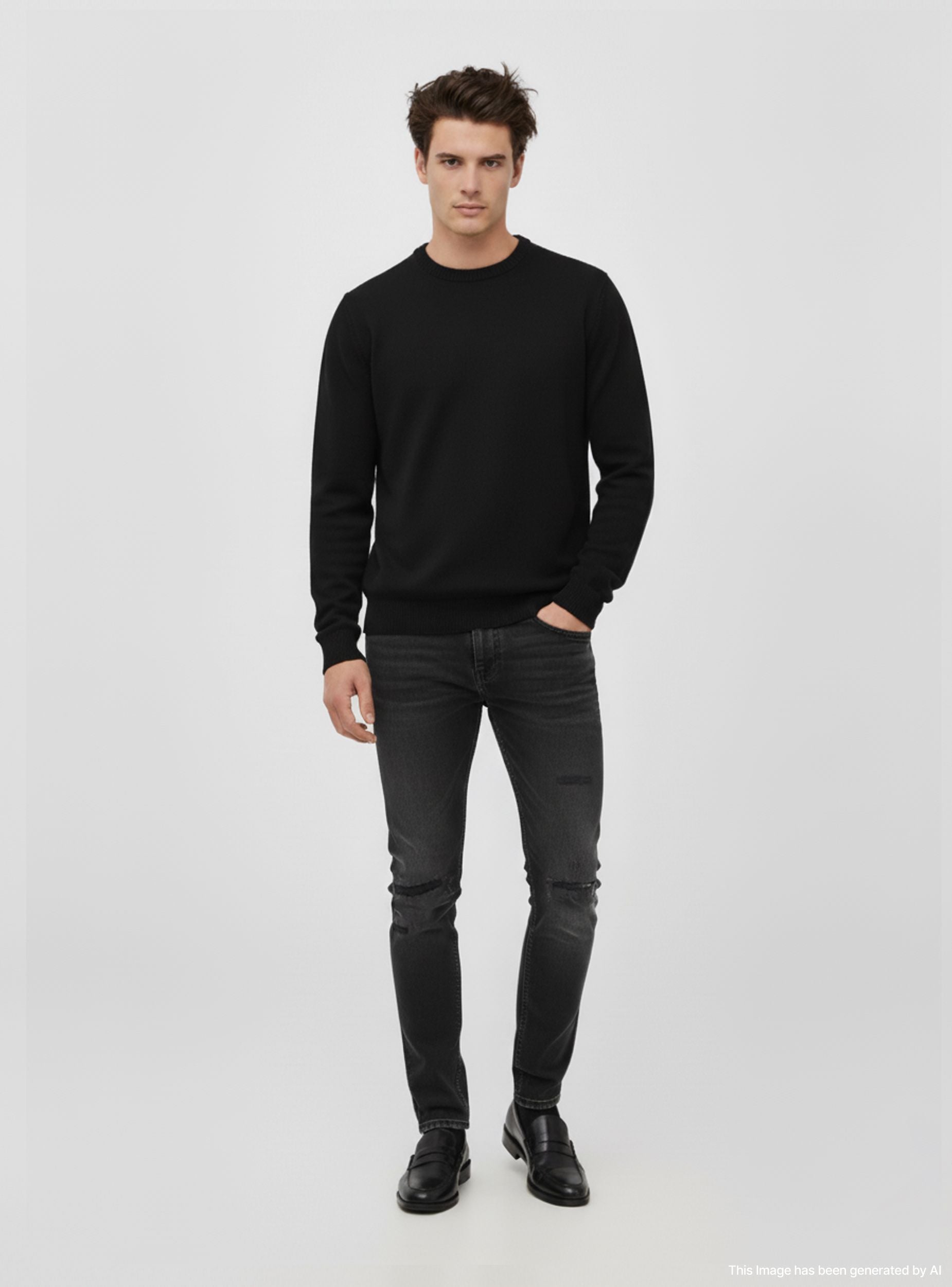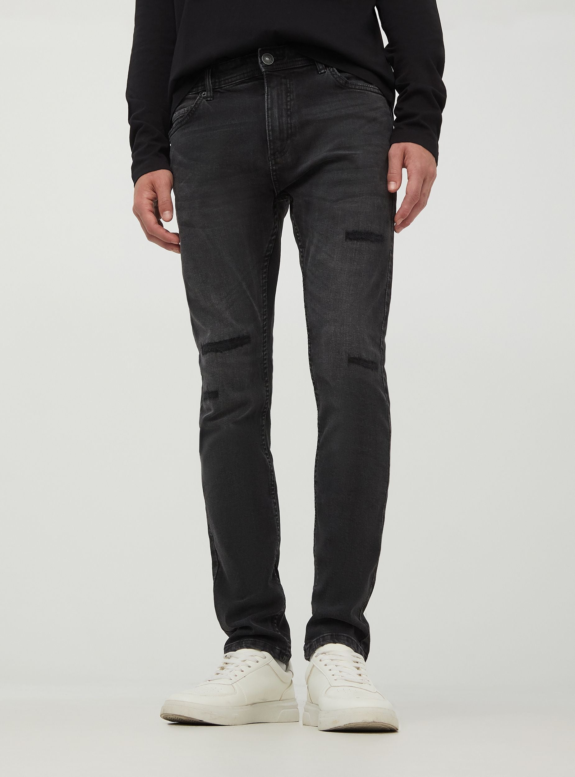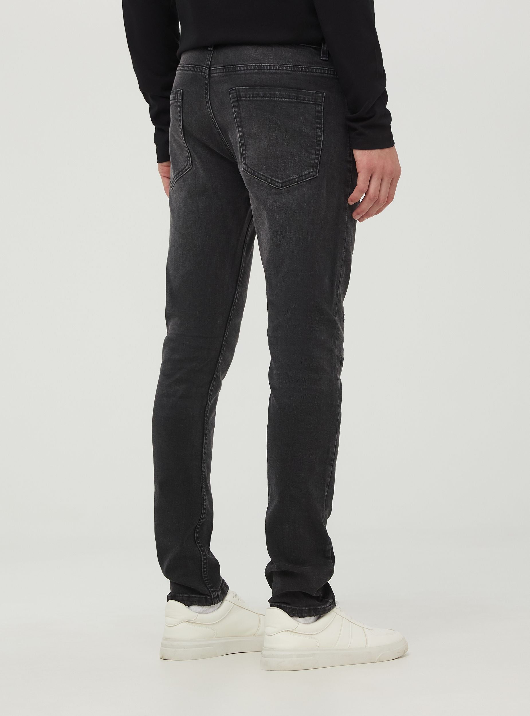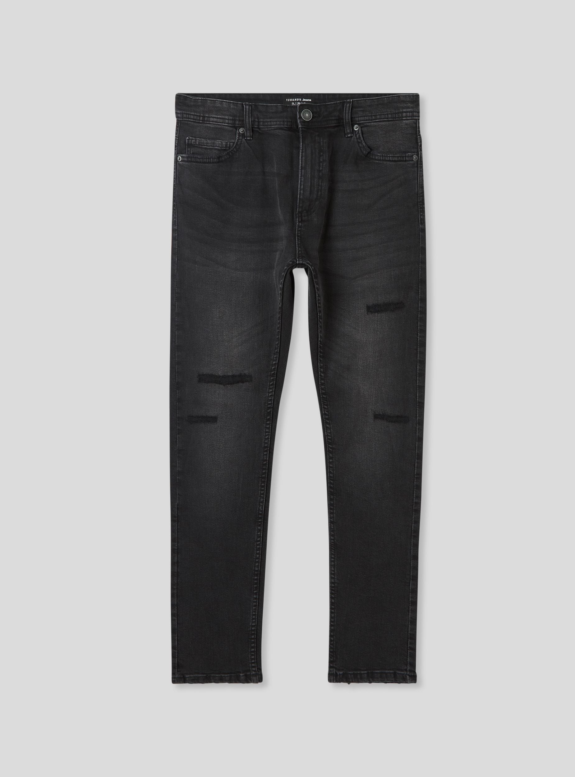 Jeans skinny neri da uomo, realizzati in denim elasticizzato, offrono una vestibilità aderente che esalta la figura. Presentano dettagli di design distintivi, come effetto consumato sulle ginocchia, con dettagli di rotture chiuse, e leggere sfumature che conferiscono un look vissuto. Dotati di chiusura con zip e bottone, cinque tasche e cuciture robuste. Perfetti per occasioni casual, si abbinano facilmente a t-shirt, felpe o maglioni.