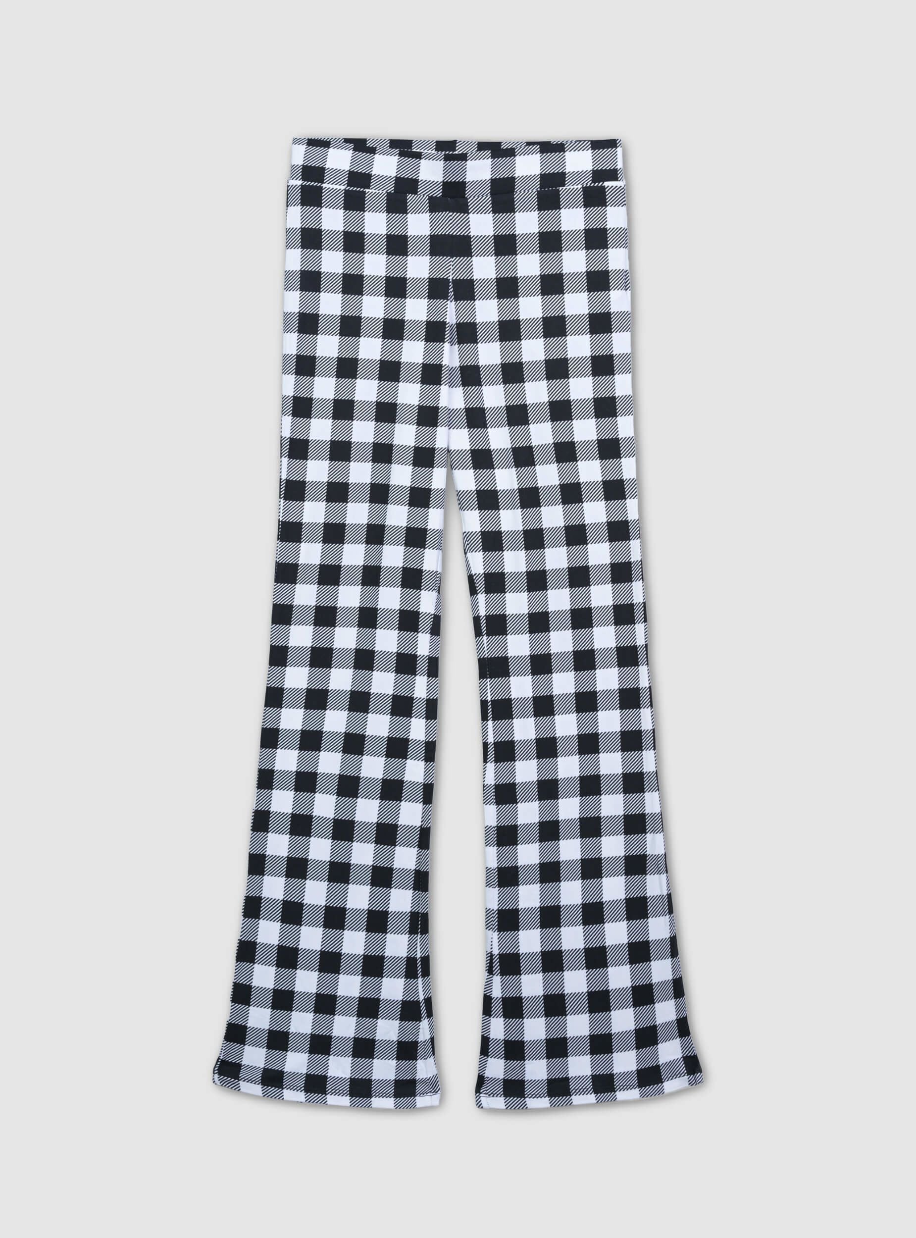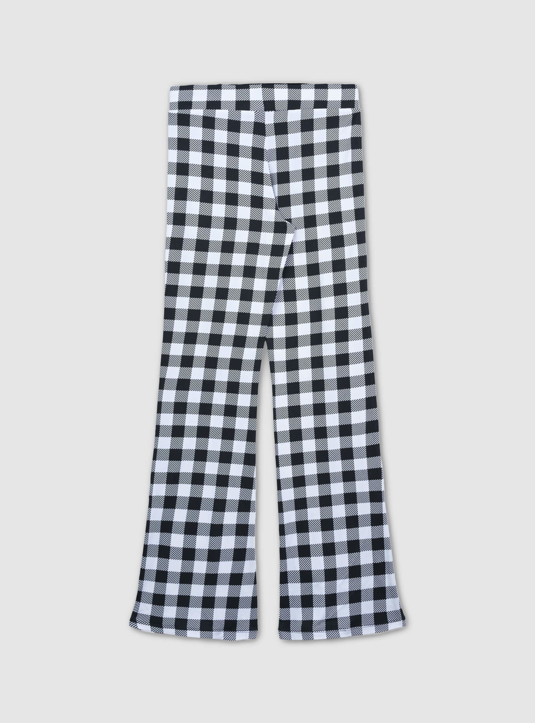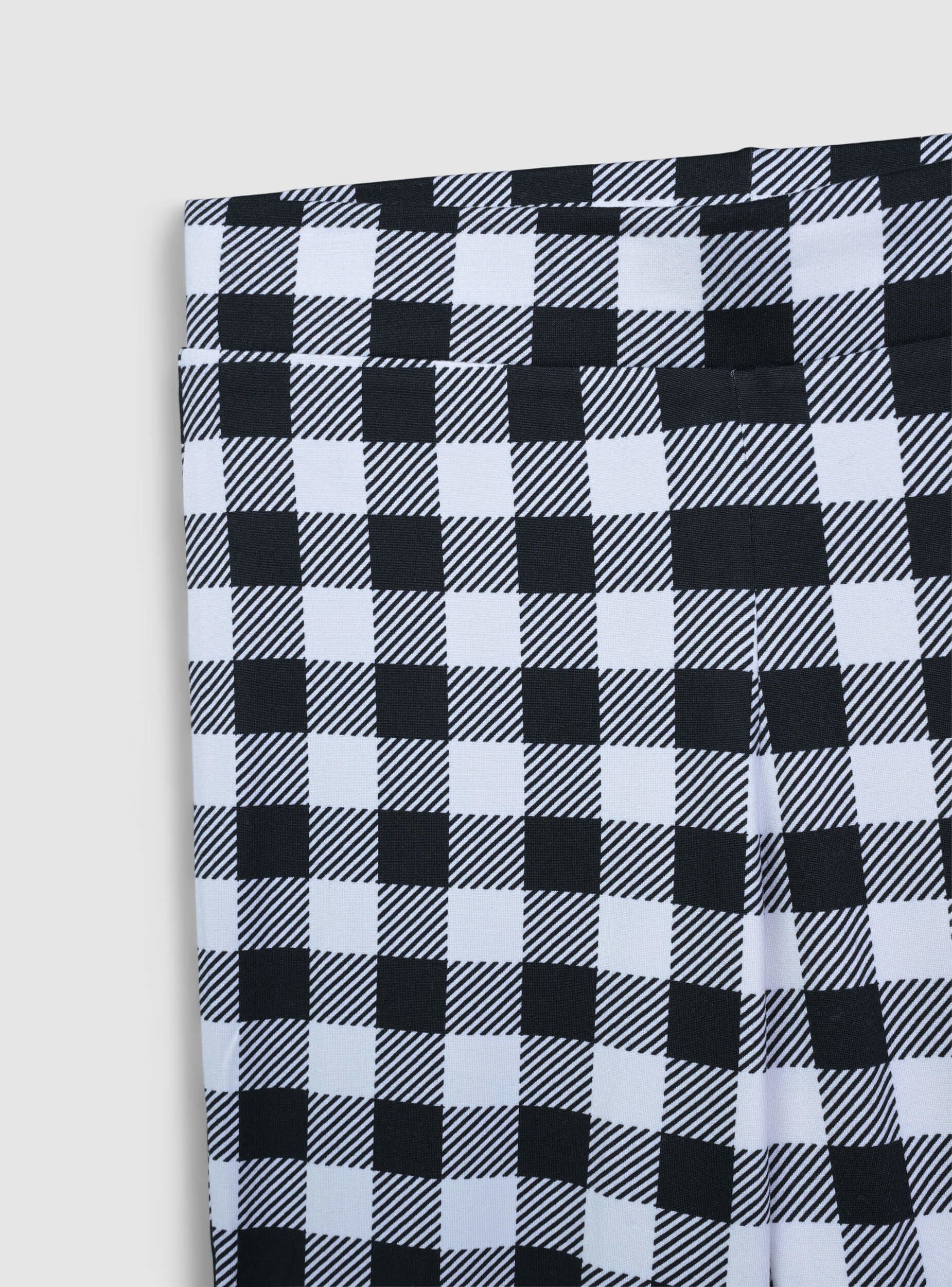 Leggings da bambina con fantasia a quadri, ideali per look casual e dinamici. Il modello presenta una vestibilità aderente sulla coscia e svasata al fondo, perfetta per abbinamenti con magliette oversize o felpe. La vita elasticizzata assicura comfort durante tutta la giornata, rendendo questi leggings versatili per la scuola, il tempo libero e le uscite con le amiche. Stile moderno e pratico.