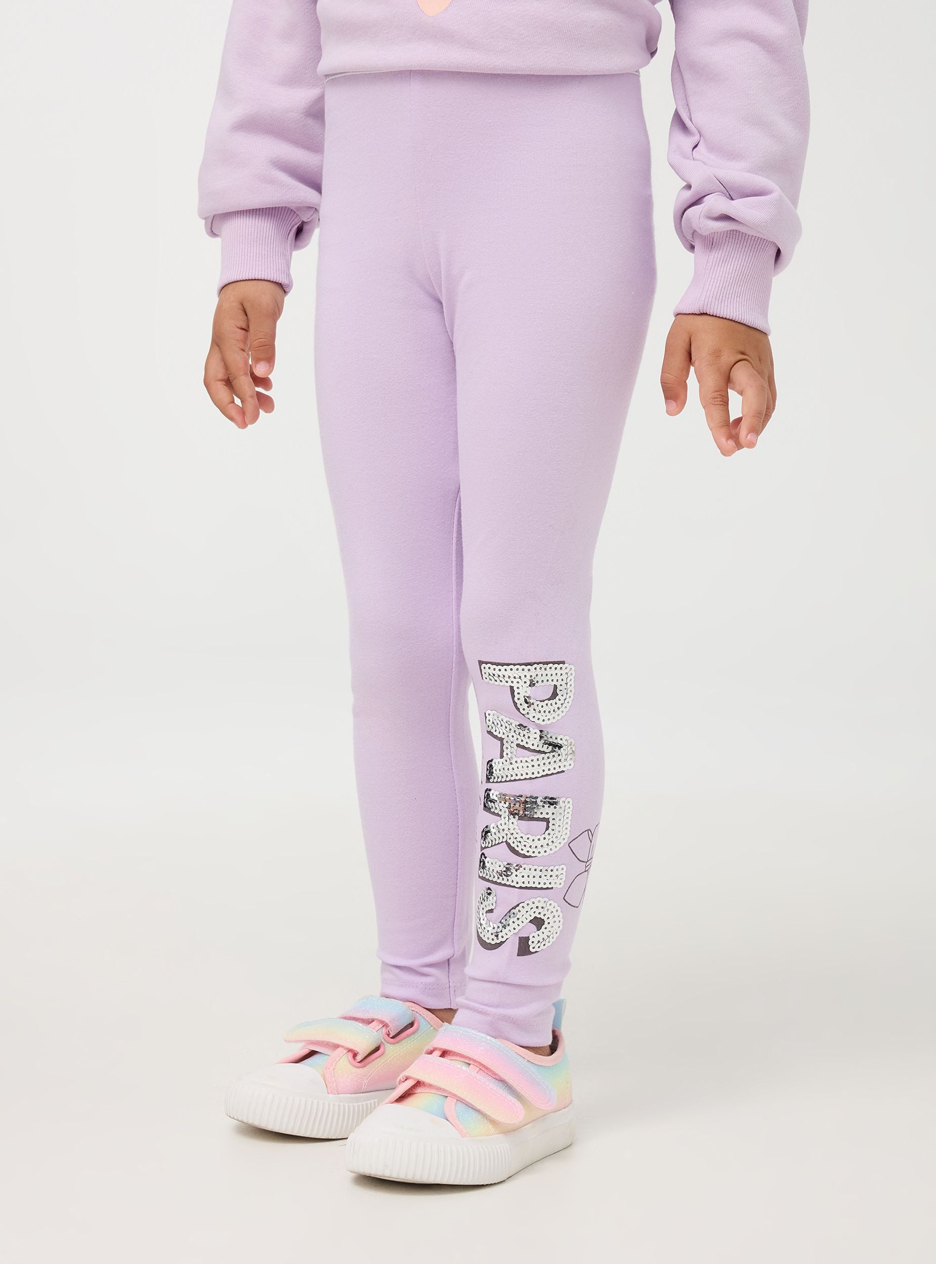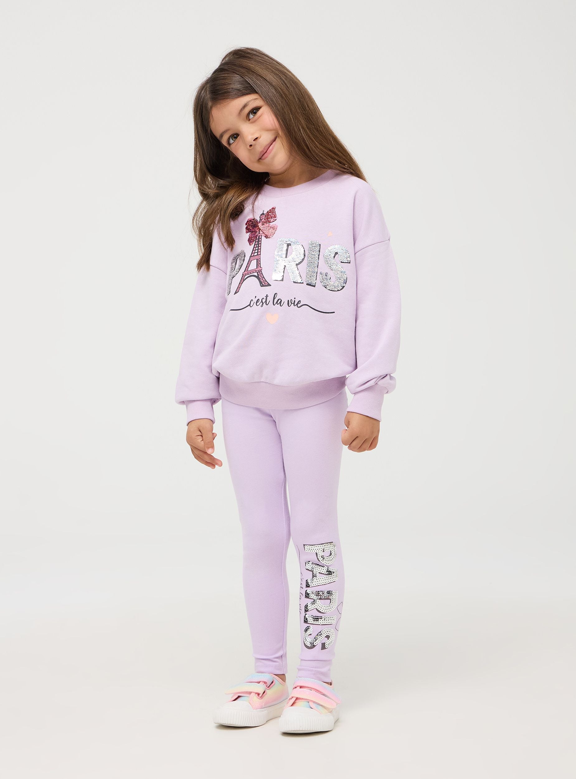 Leggings da bimba in morbido cotone elasticizzato offrono comfort e stile per le avventure quotidiane. Il tocco glamour è dato dall'elastico in vita glitterato mentre la decorazione "Paris" con paillettes e la scritta "c'est la vie" aggiungono un fascino speciale. Aderenti e casual, sono perfetti per il tempo libero e le attività quotidiane, combinando praticità e un tocco di eleganza.