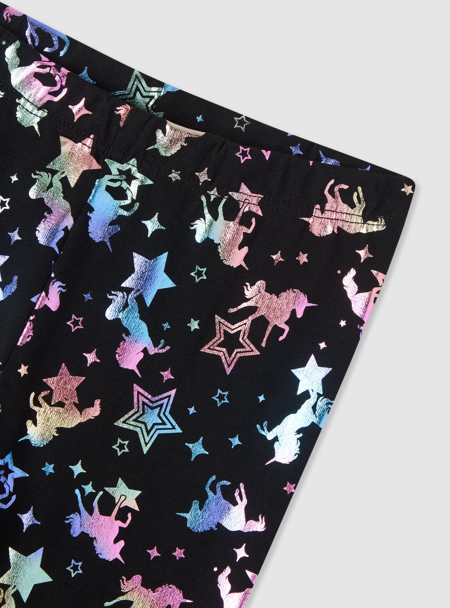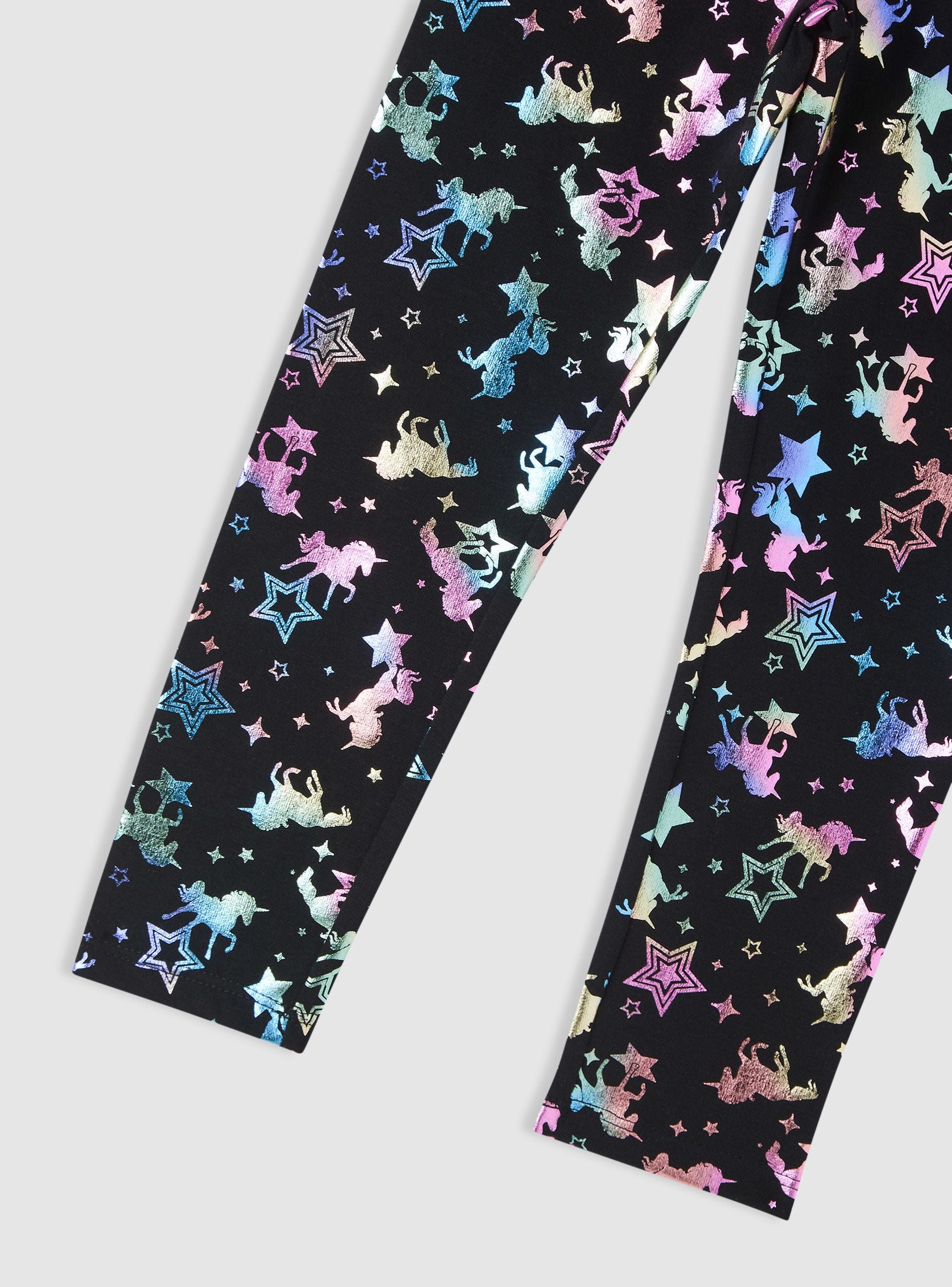 Leggings da bimba con stampa laminata con unicorni e stelle. Ideali per il tempo libero e per creare outfit allegri e colorati. Presentano una vestibilità aderente che garantisce comfort e libertà di movimento. Perfetti da abbinare a magliette o felpe per un look casual e giocoso.