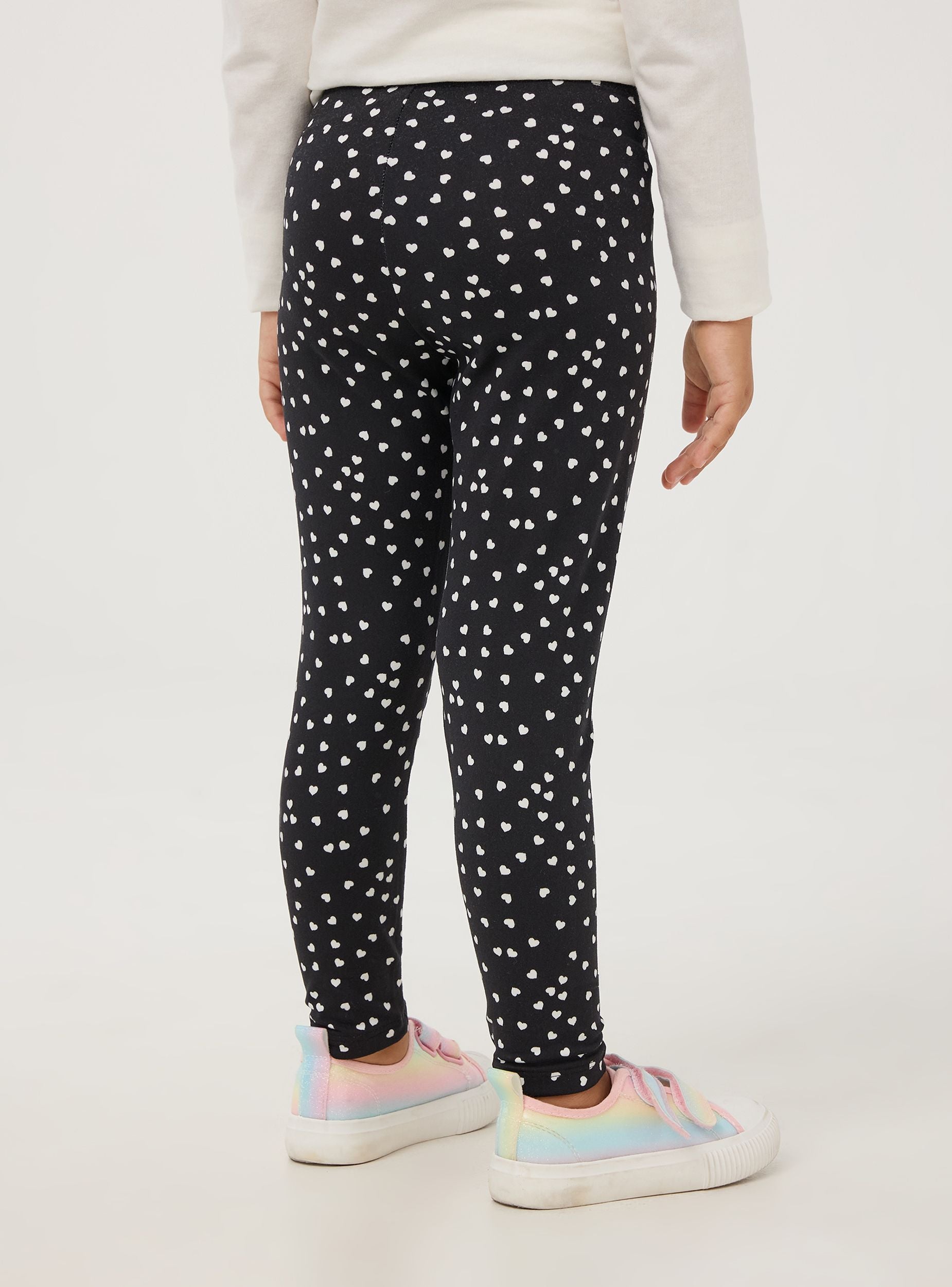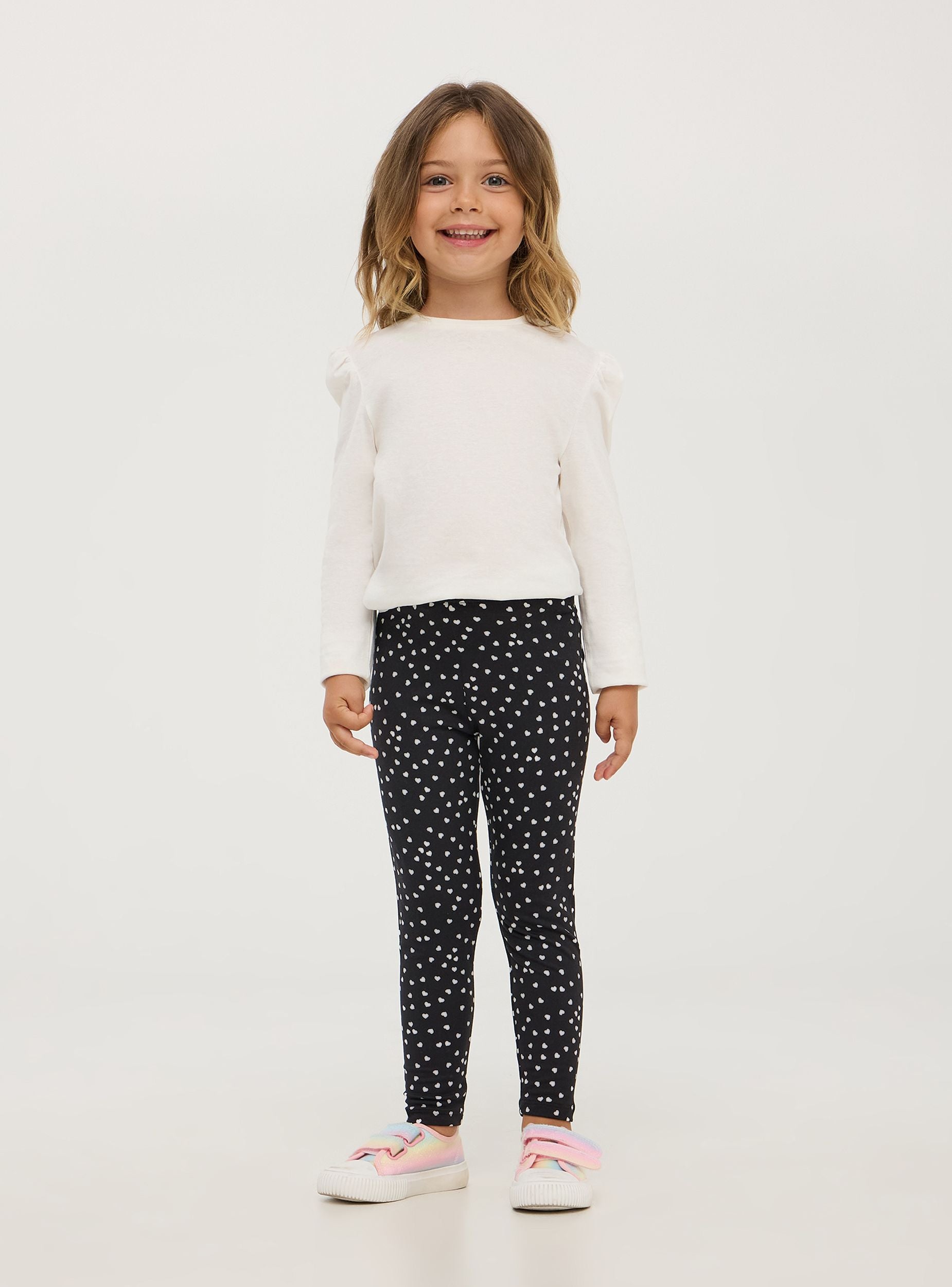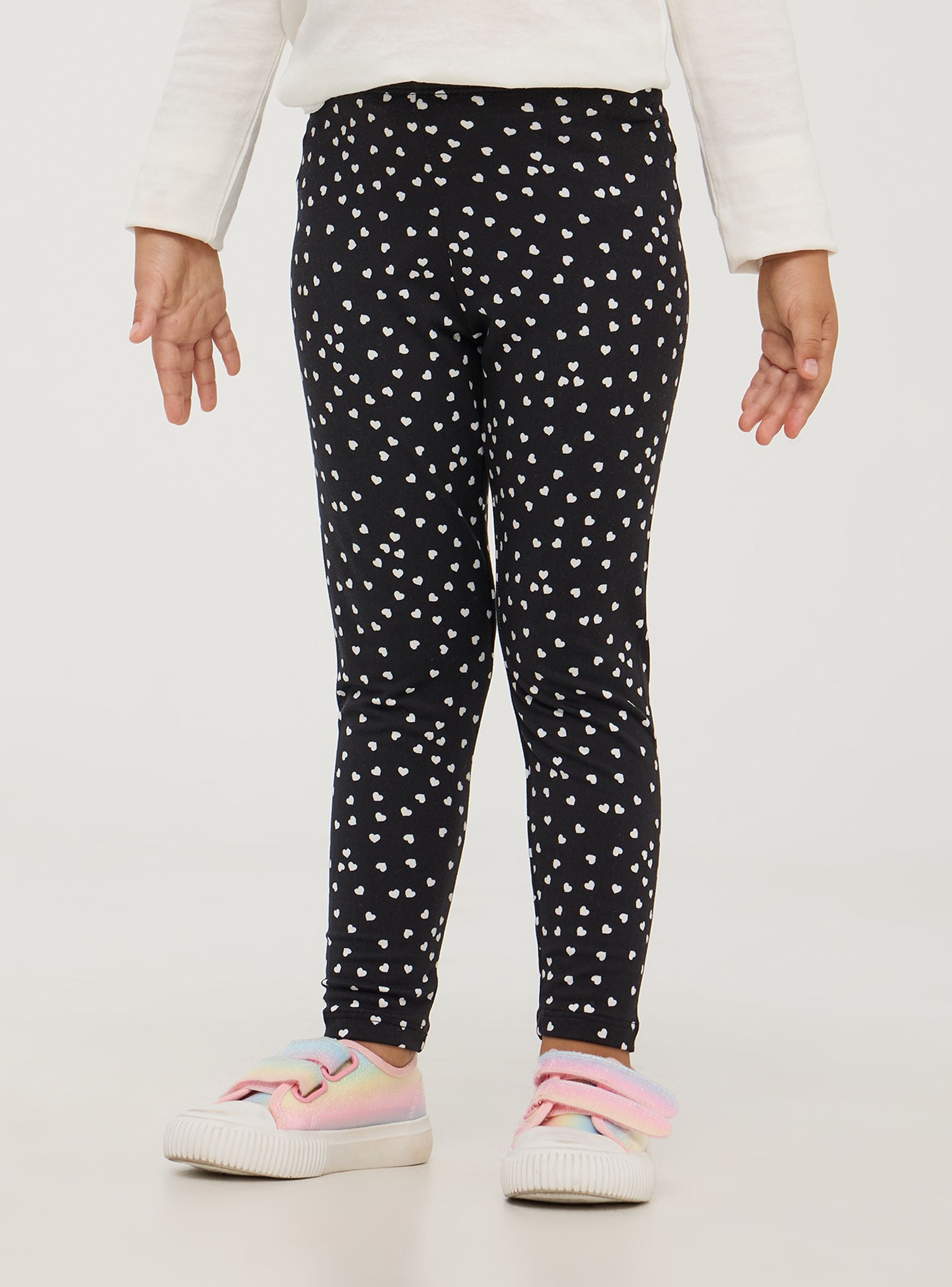Leggings da bimba, modello lungo con cuori all-over per un effetto delicato e dolce. La vita è elasticizzata, permettendo una facile vestizione e un fit confortevole. Questi leggings sono ideali per l'uso quotidiano, offrendo comfort e stile per una varietà di attività. Possono essere indossati per la scuola, le attività ricreative o per giocare a casa. La stampa con i cuori li rende particolarmente adatti per eventi informali come feste di compleanno o uscite con amici. Si abbinano facilmente a t-shirt, felpe e maglioni, permettendo di creare look diversi e versatili.