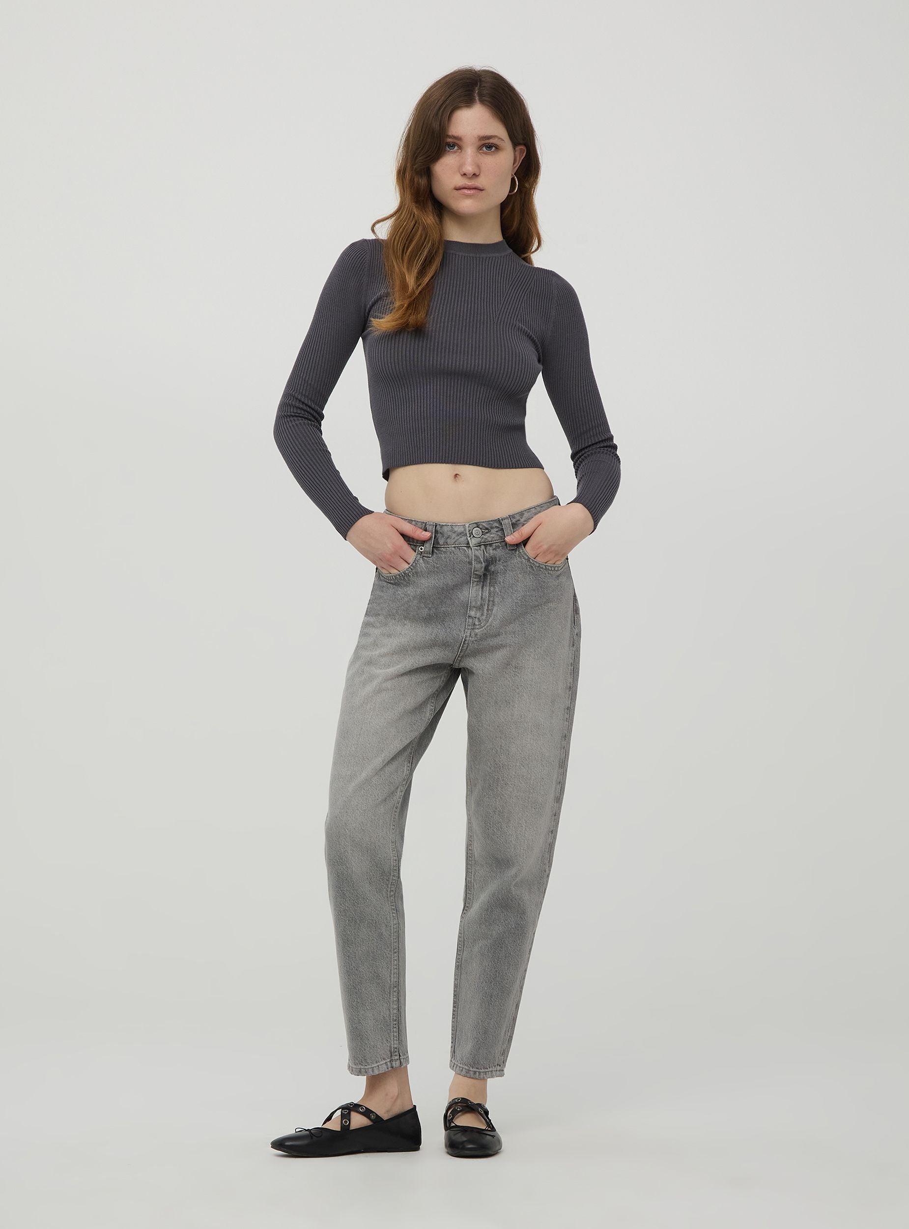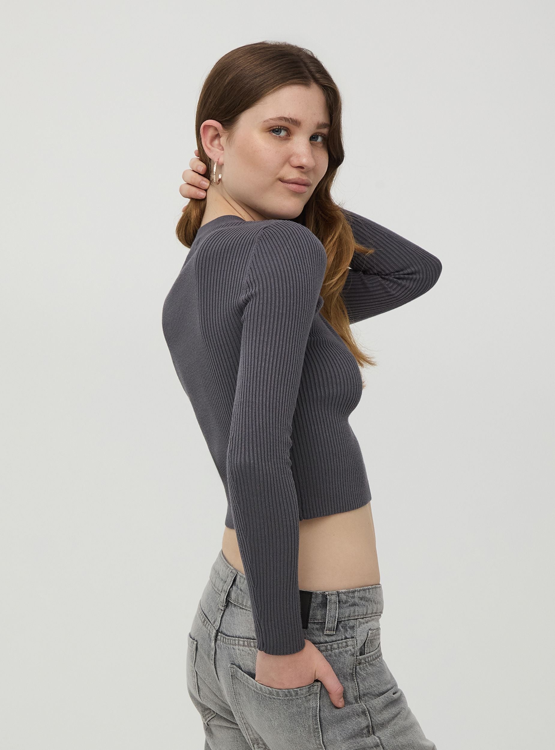 Maglia a coste crop da donna con un design aderente e moderno. Realizzata in un tessuto elasticizzato a costine, garantisce una vestibilità perfetta che valorizza la figura. La maglia è dotata di maniche lunghe e un colletto leggermente alto, che offrono un look elegante e contemporaneo. La lunghezza crop, che termina appena sopra la vita, rende questa maglia ideale per creare outfit alla moda.