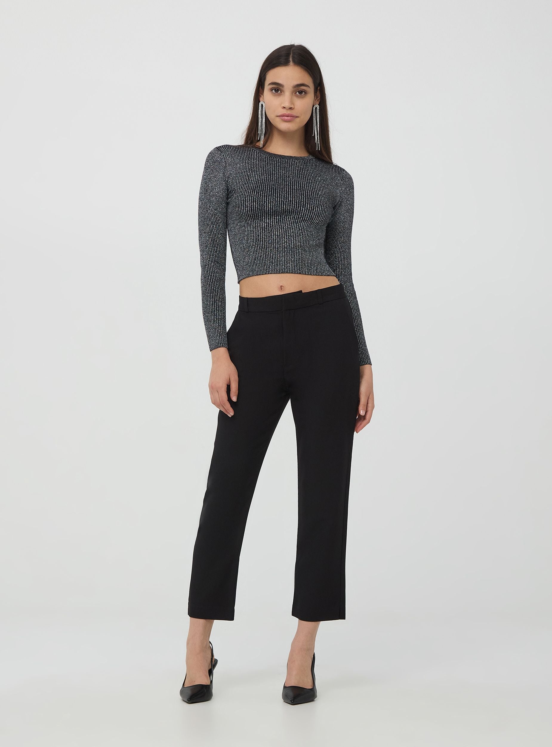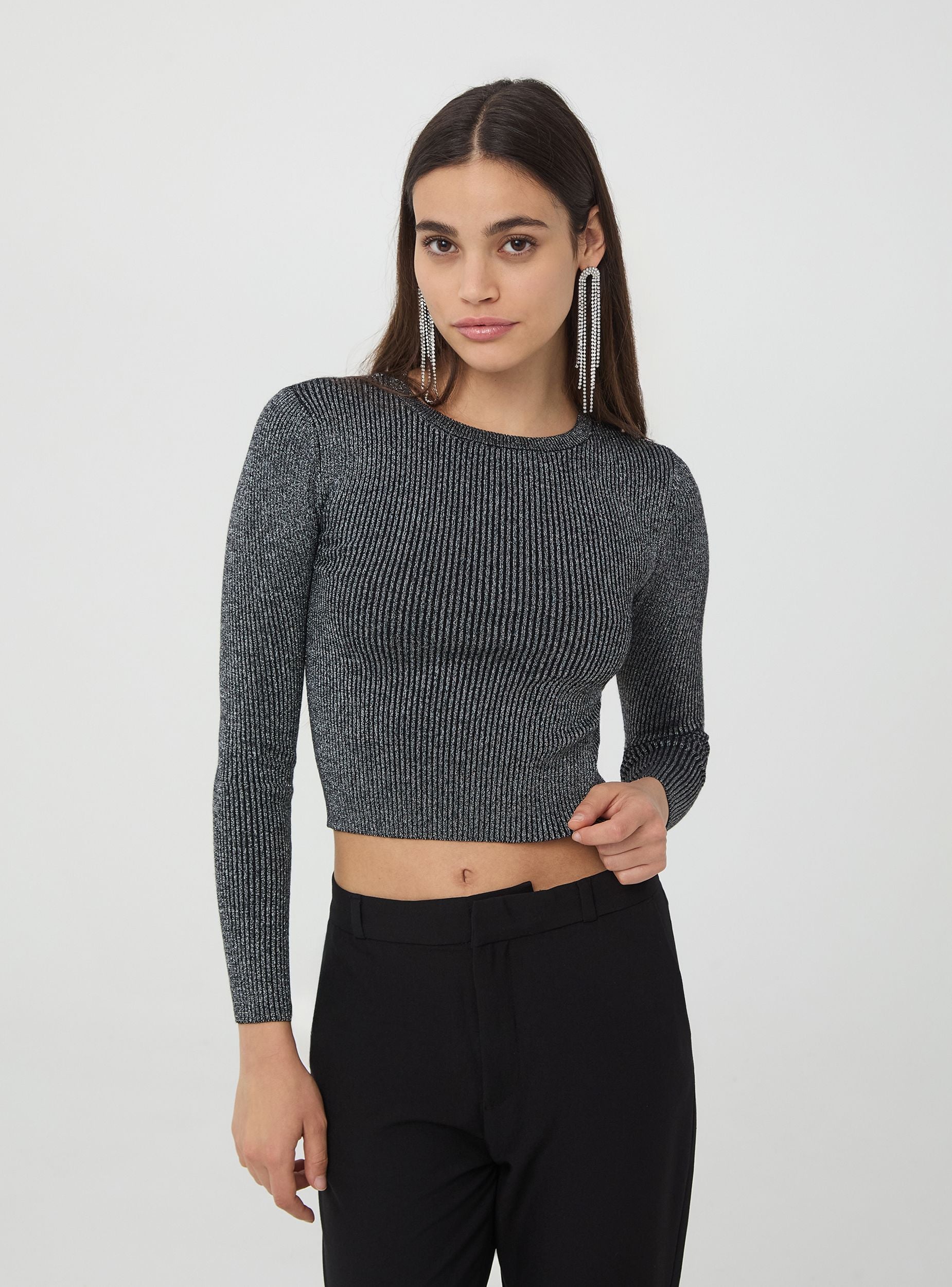 Maglia crop da donna a costinluccicante, aderisce perfettamente al corpo, mettendo in risalto la silhouette femminile. Il design a maniche lunghe offre una copertura completa, mentre la lunghezza crop, che termina sopra la vita, conferisce un look moderno e alla moda. Il tessuto luccicante dona un effetto scintillante, ideale per aggiungere un tocco glamour al tuo outfit. Le costine verticali creano una texture raffinata e un effetto visivo snellente.