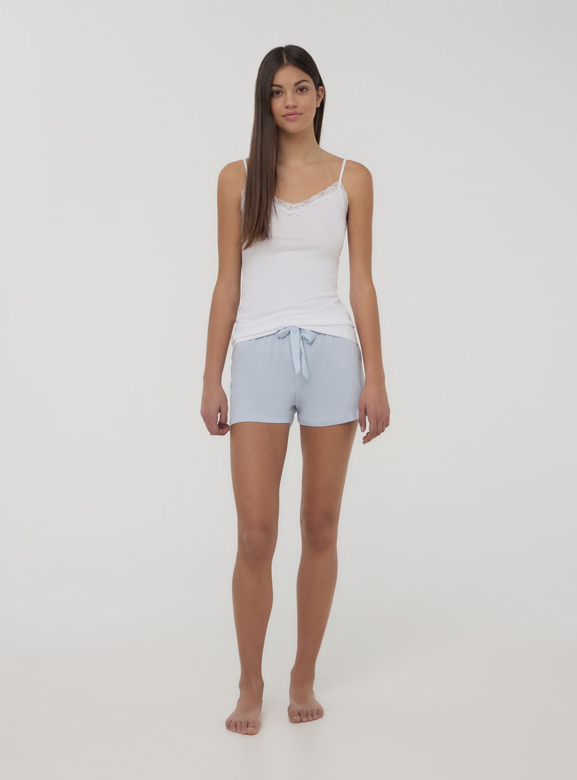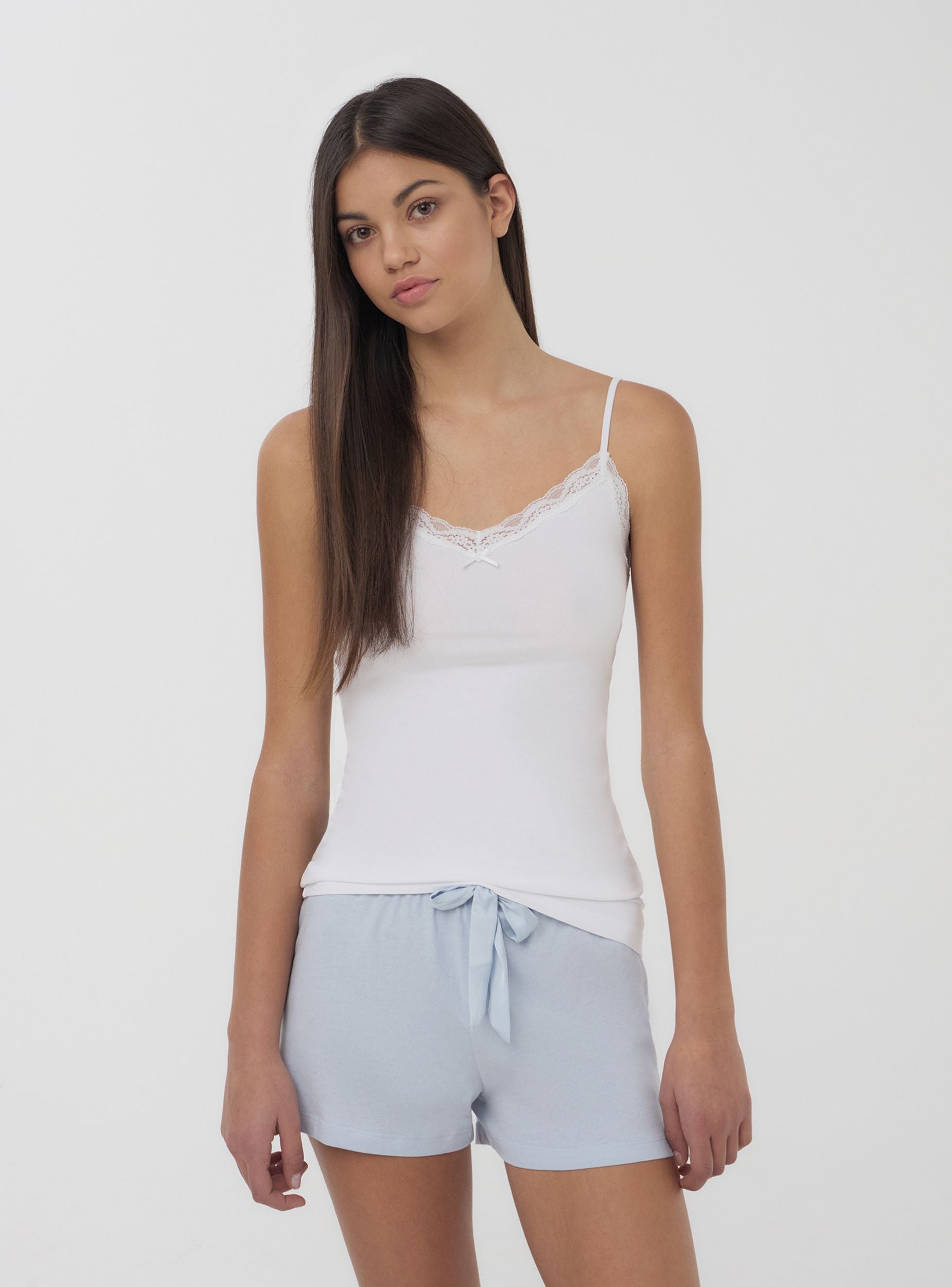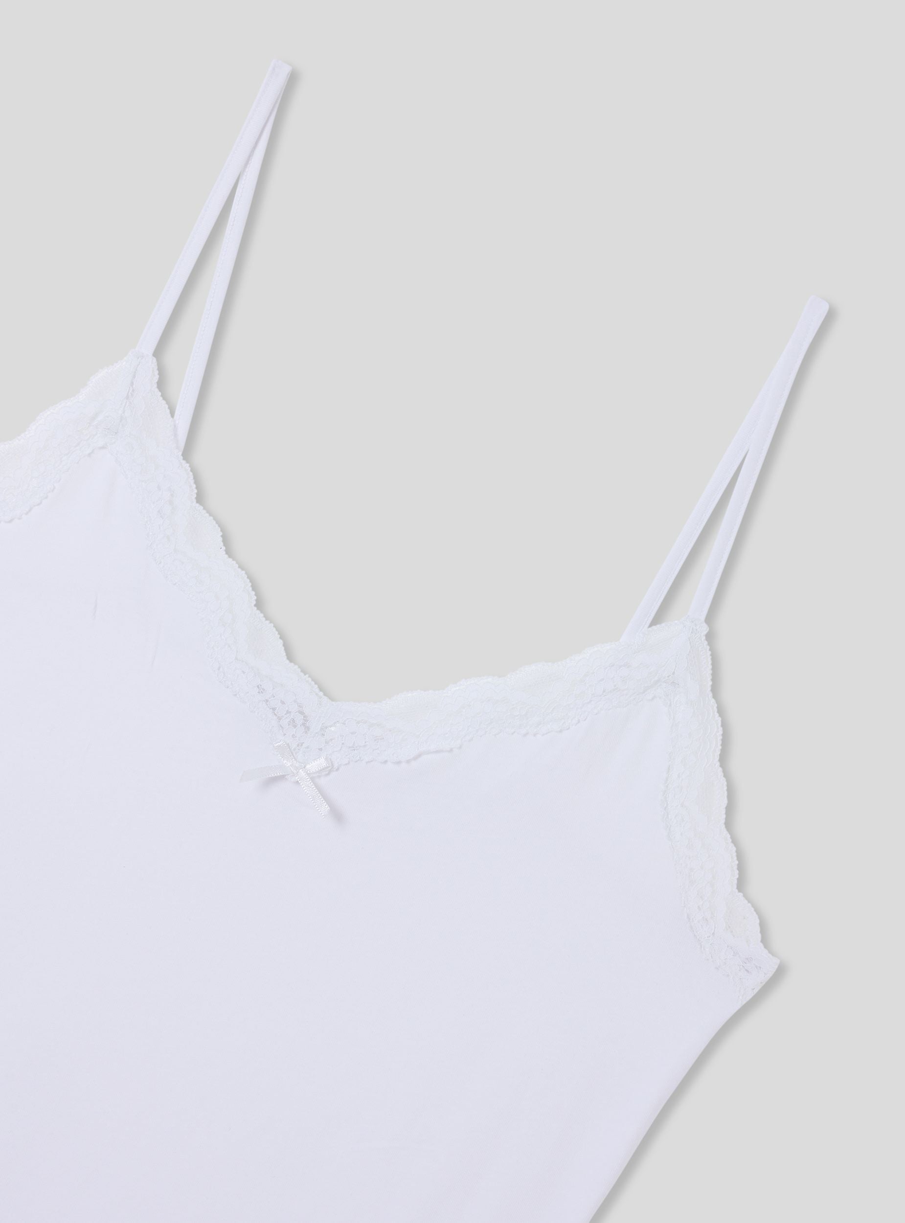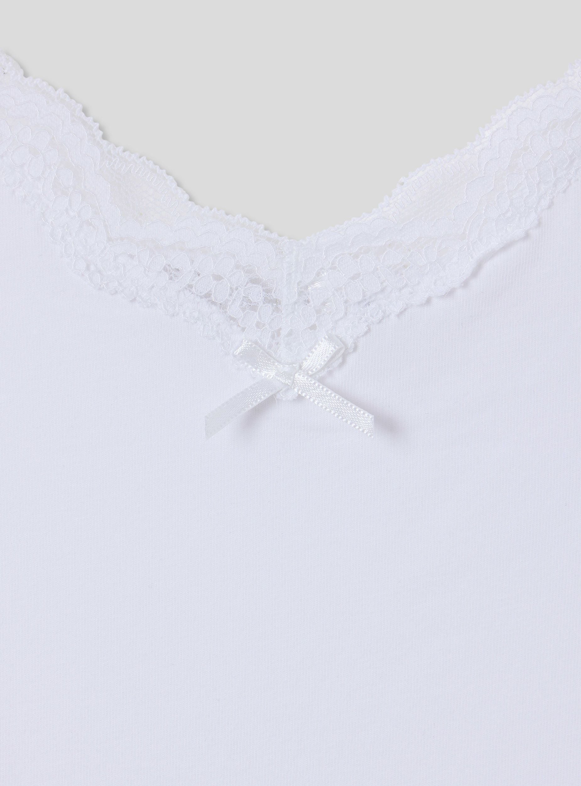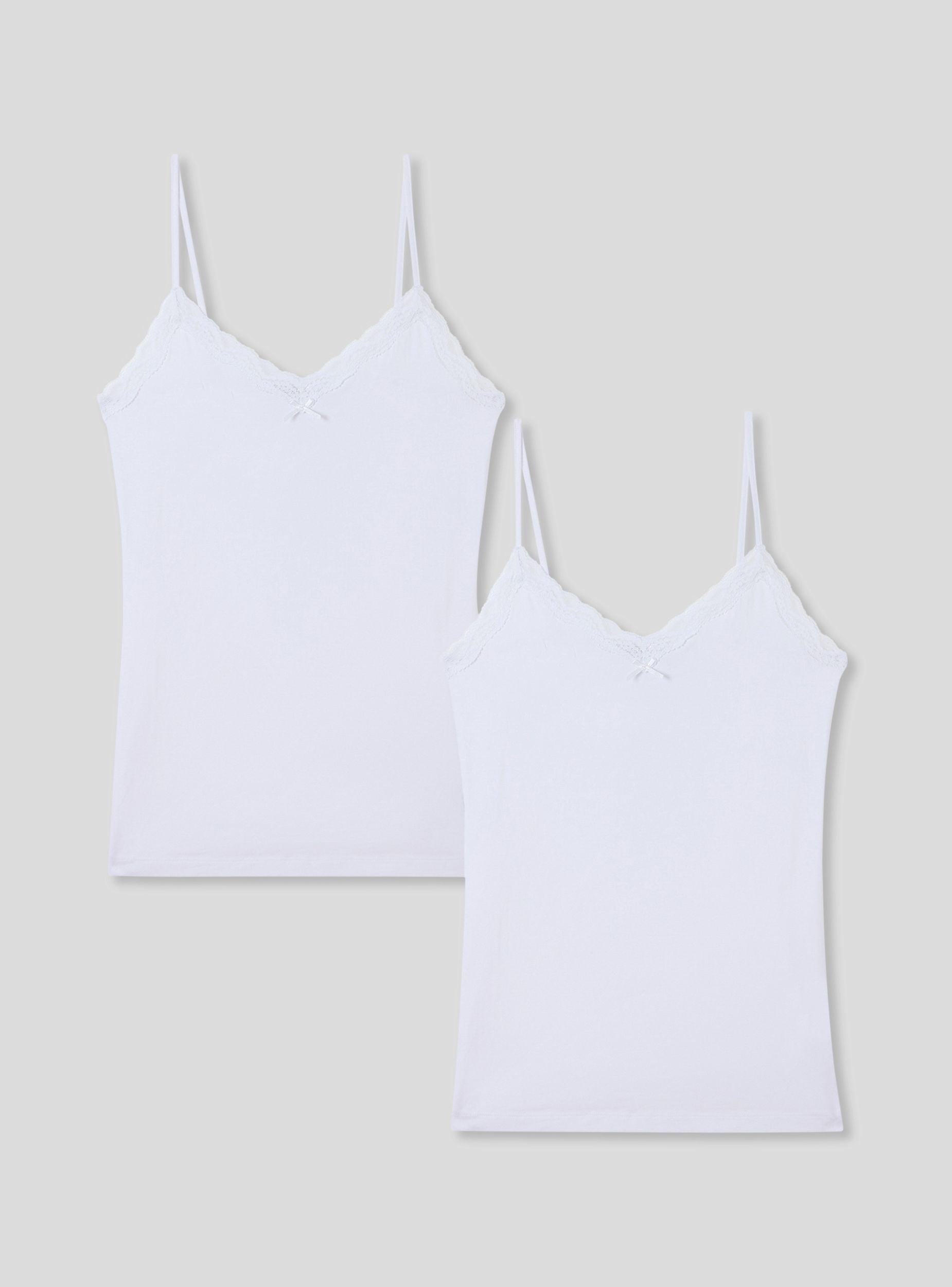 Confezione composta da 2 canotte da donna perfette per un look femminile e delicato. Ogni canotta presenta una tinta unita arricchita da un raffinato dettaglio in pizzo lungo lo scollo, impreziosito da un piccolo fiocchetto decorativo. Le spalline sottili aggiungono un tocco elegante, rendendole ideali come intimo o per essere indossate sotto capi leggeri.