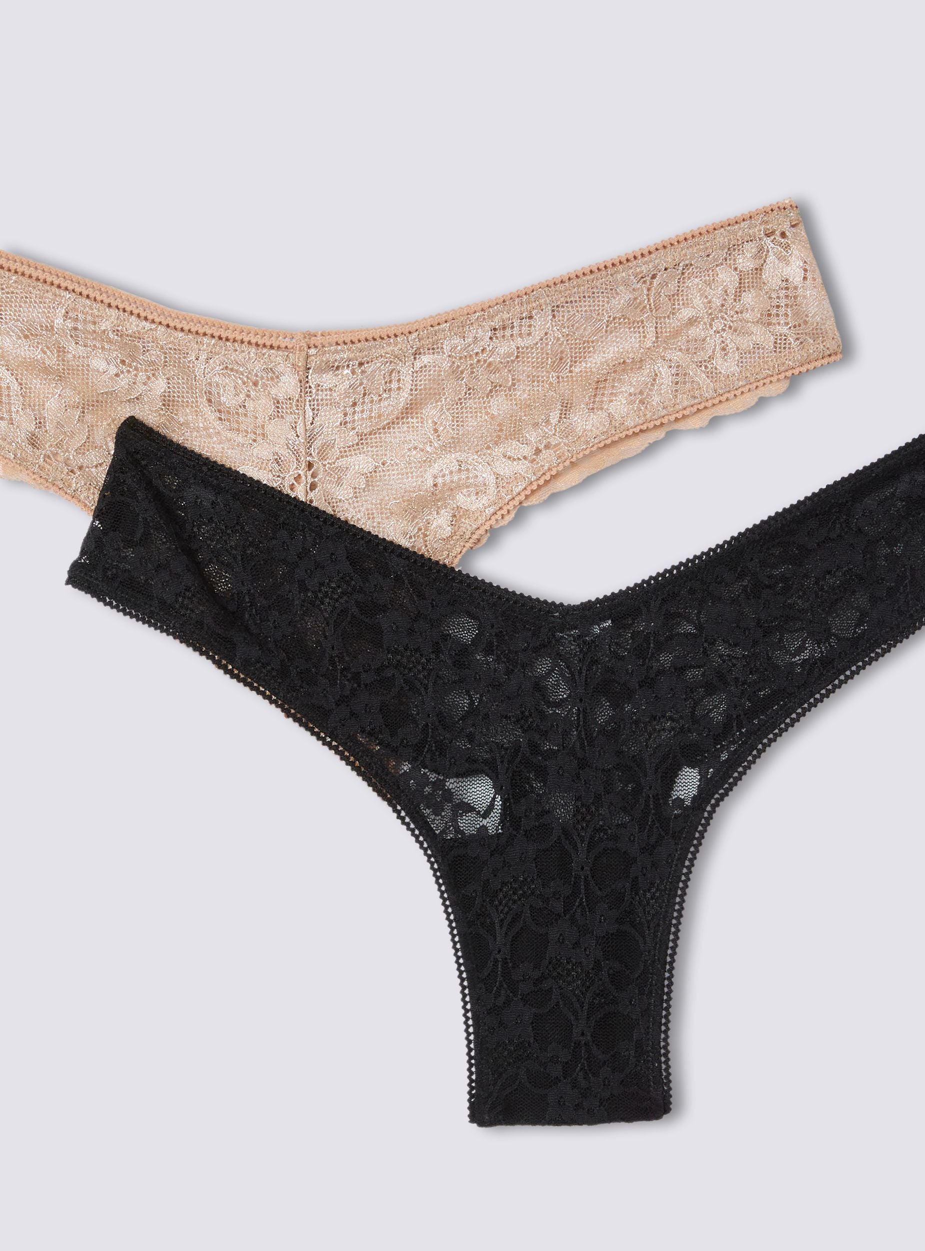 Confezione composta da 2 slip da donna, modello brasiliana, caratterizzati da una forma a "V" nella parte frontale e posteriore per un effetto slanciato e avvolgente. Il pizzo delicato con inserti luccicante dona un tocco di eleganza e femminilità . Grazie al design raffinato e al tessuto morbido, questi slip sono perfetti per l'uso quotidiano o per occasioni speciali, offrendo comfort e stile senza compromessi.Dettagli