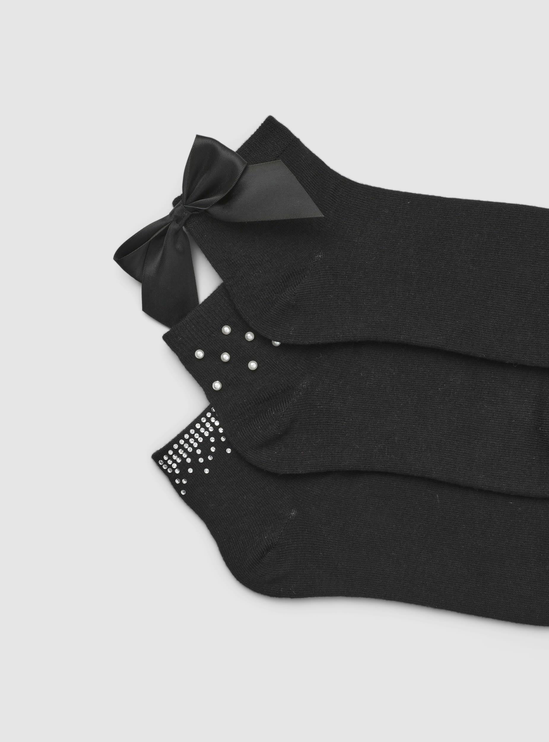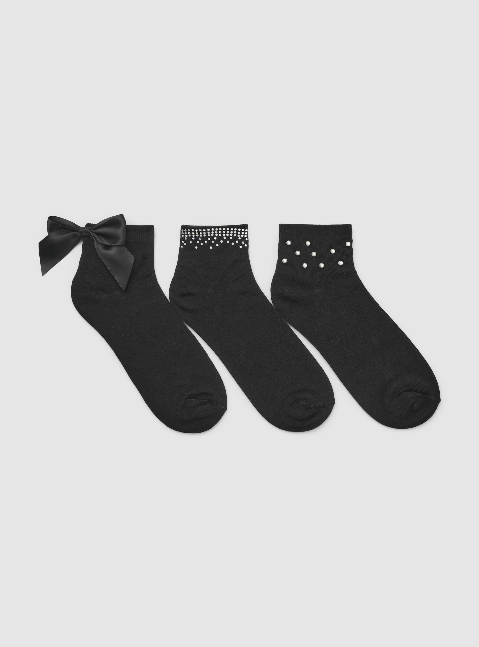 Confezione composta da 3 paia di calzini da donna con applicazioni, ideali per aggiungere un tocco di stile ai tuoi outfit quotidiani. Questo set include tre paia di calzini, ognuno con dettagli unici come fiocchi, perline e strass. Perfetti per essere indossati con scarpe basse o sneakers, offrono una vestibilità comoda e un design accattivante.
