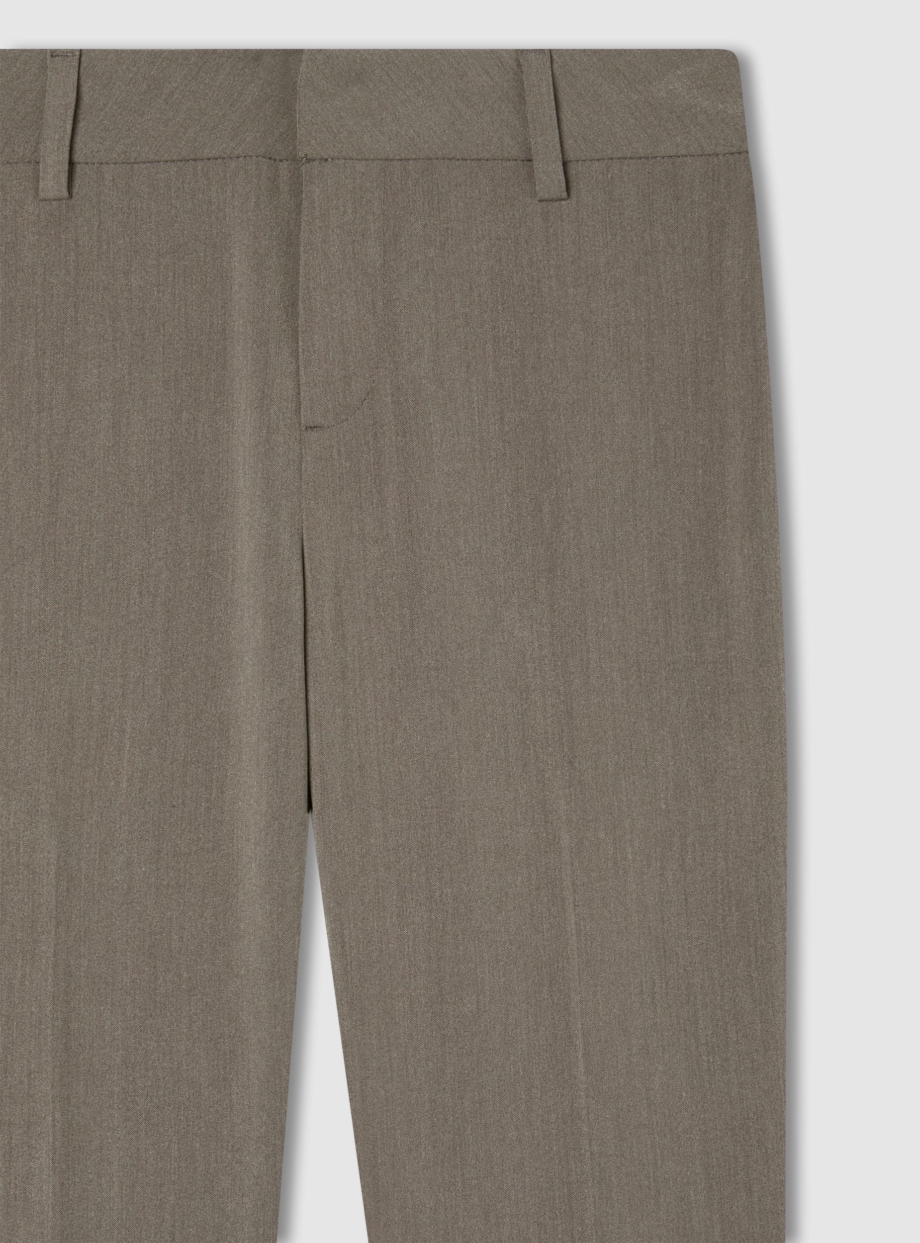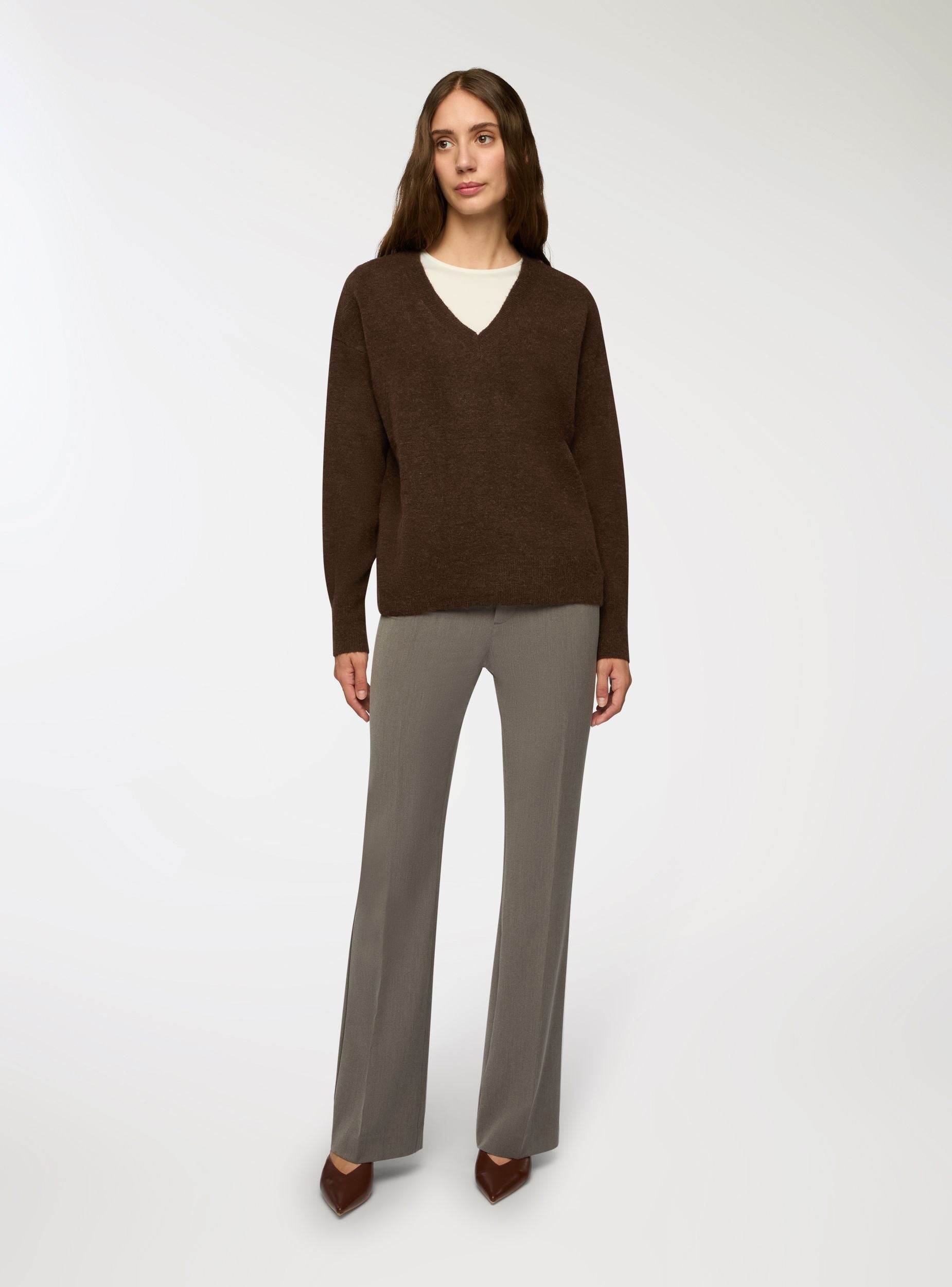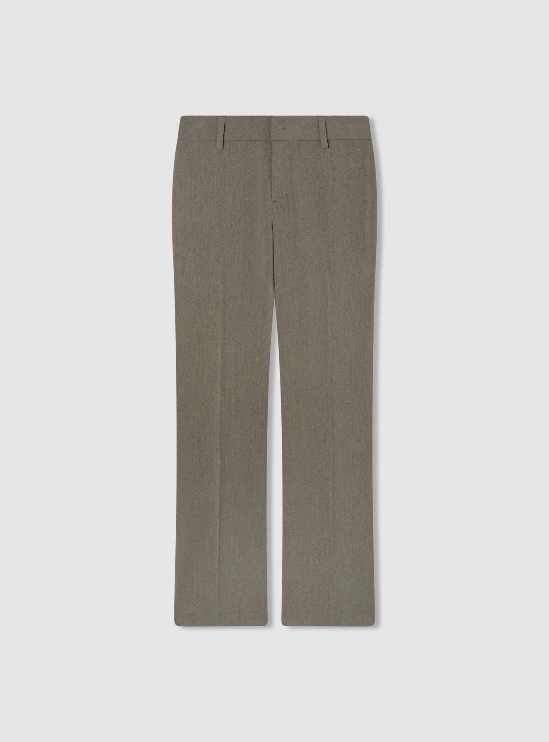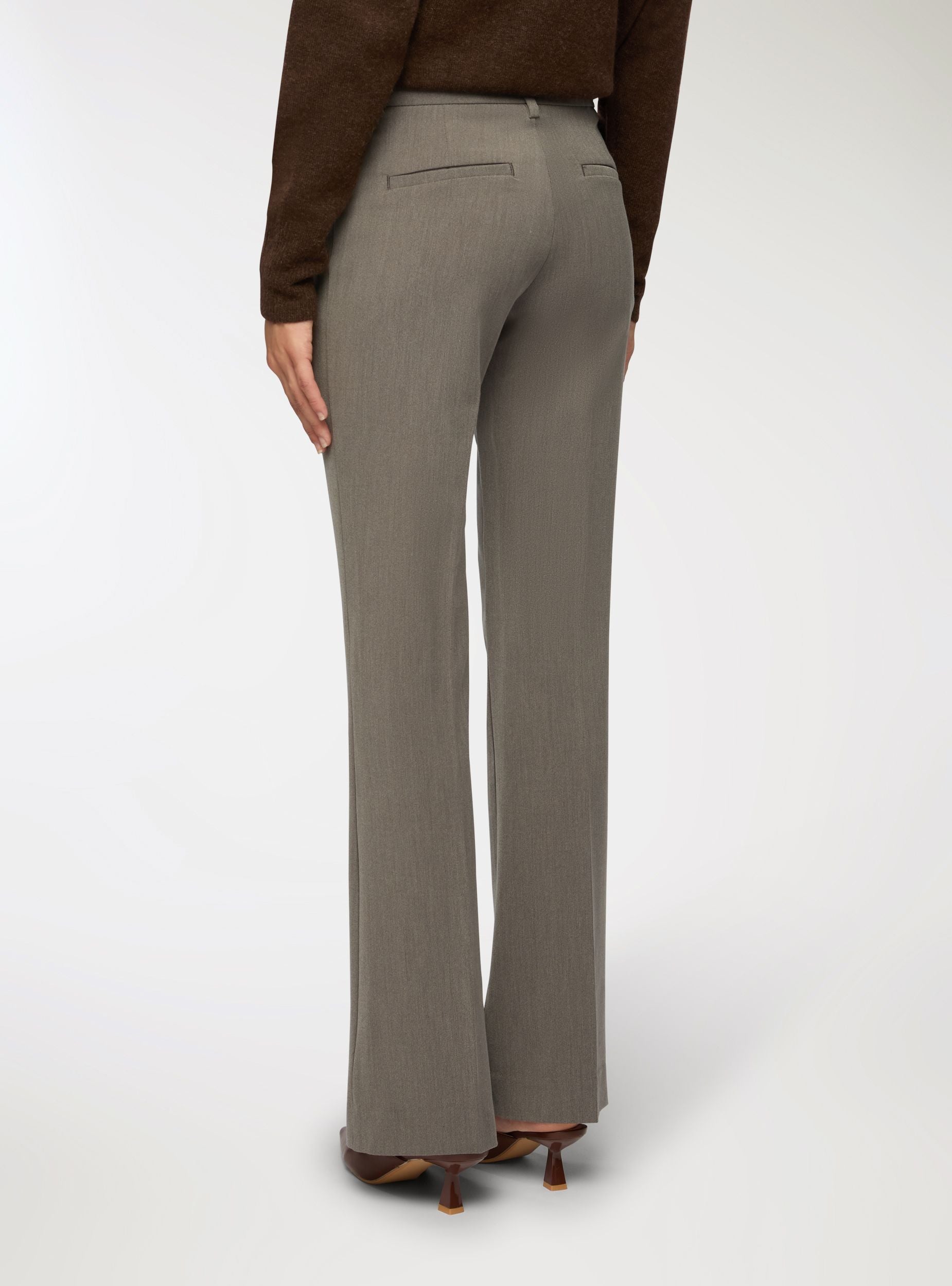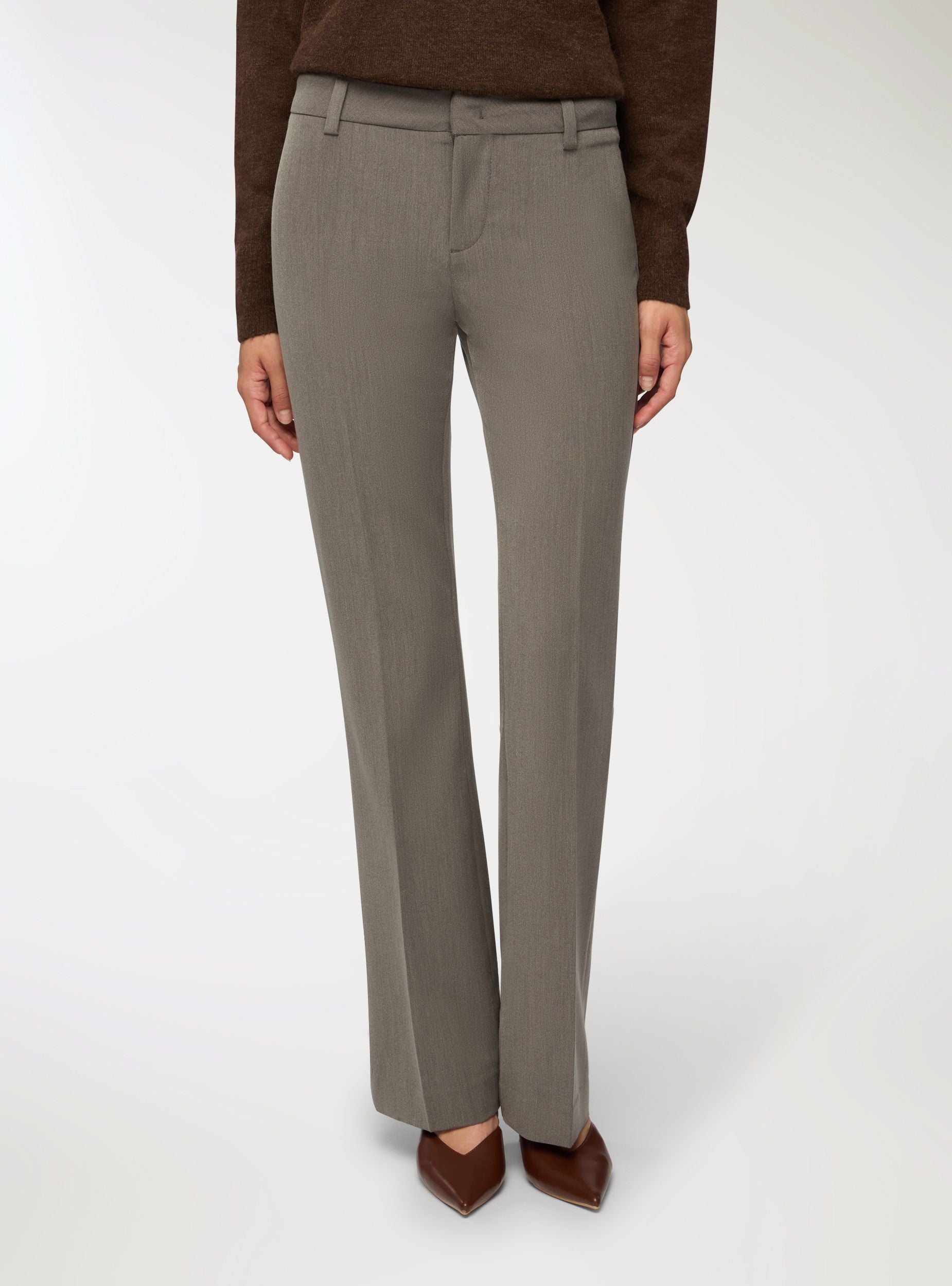 Pantaloni da donna con design elegante e moderno, ideali per occasioni formali o per l'ufficio. Presentano una vestibilità regolare con gamba svasata che dona un tocco sofisticato. Dotati di passanti per cintura, sono perfetti da abbinare a camicie o bluse per un look professionale. Il tessuto melange aggiunge un dettaglio raffinato al capo.