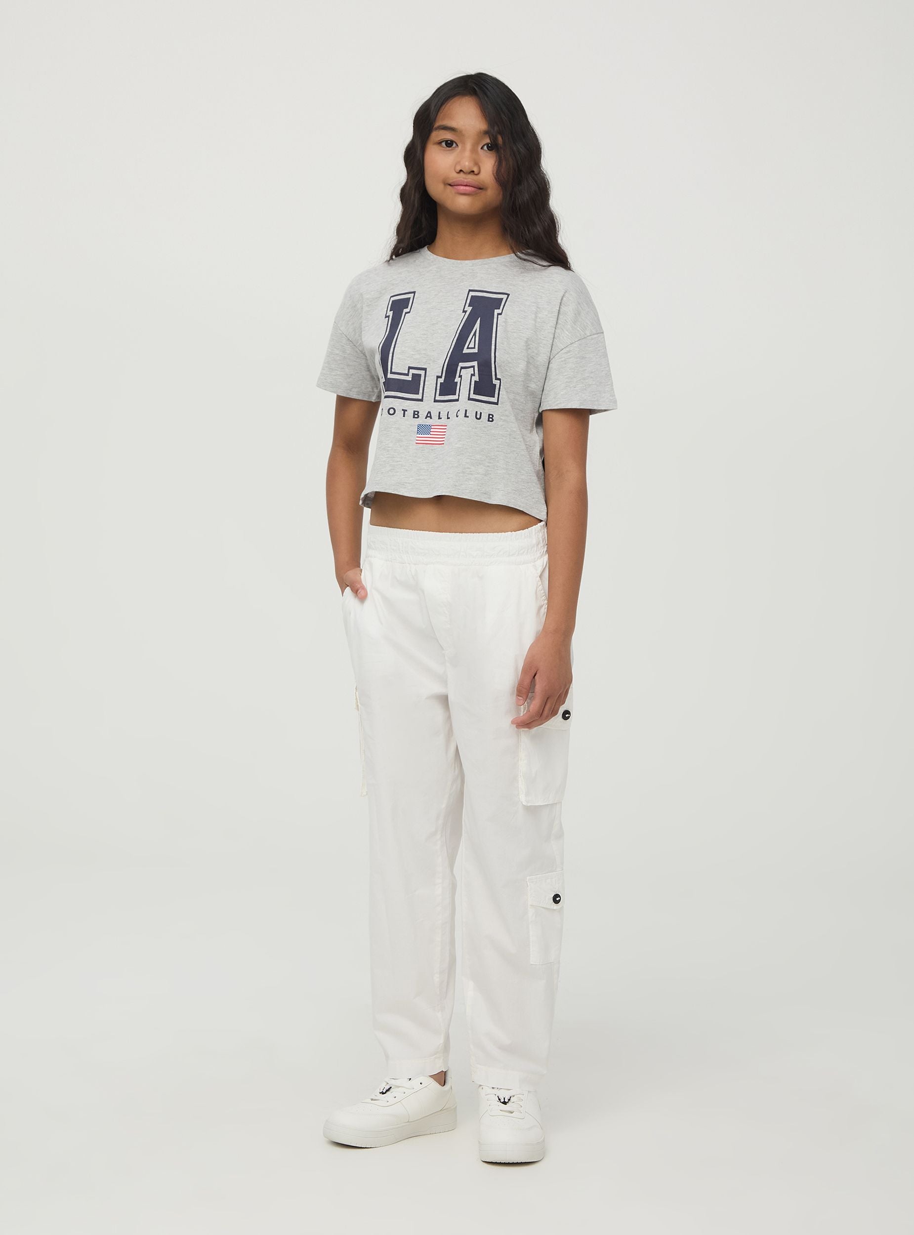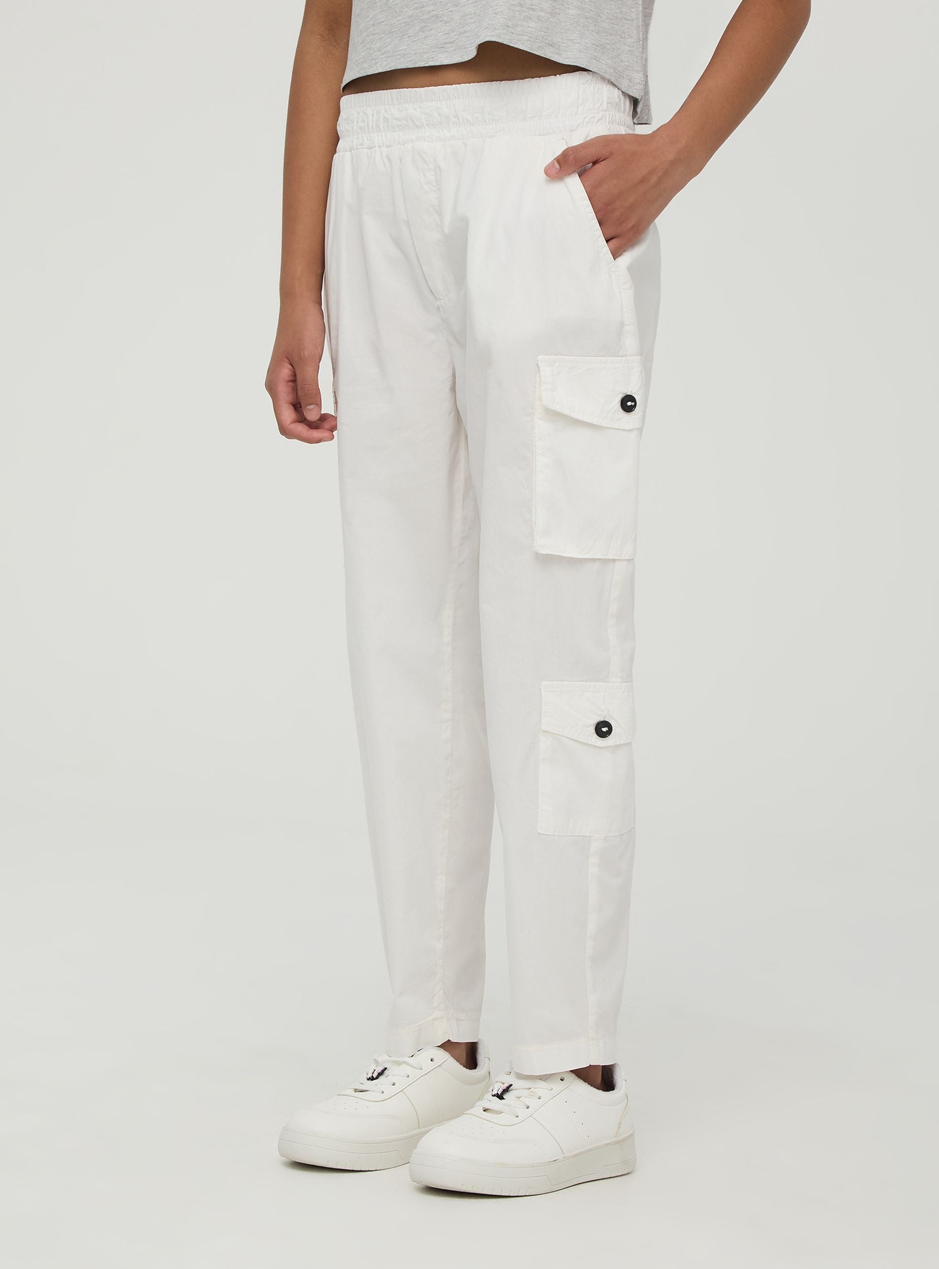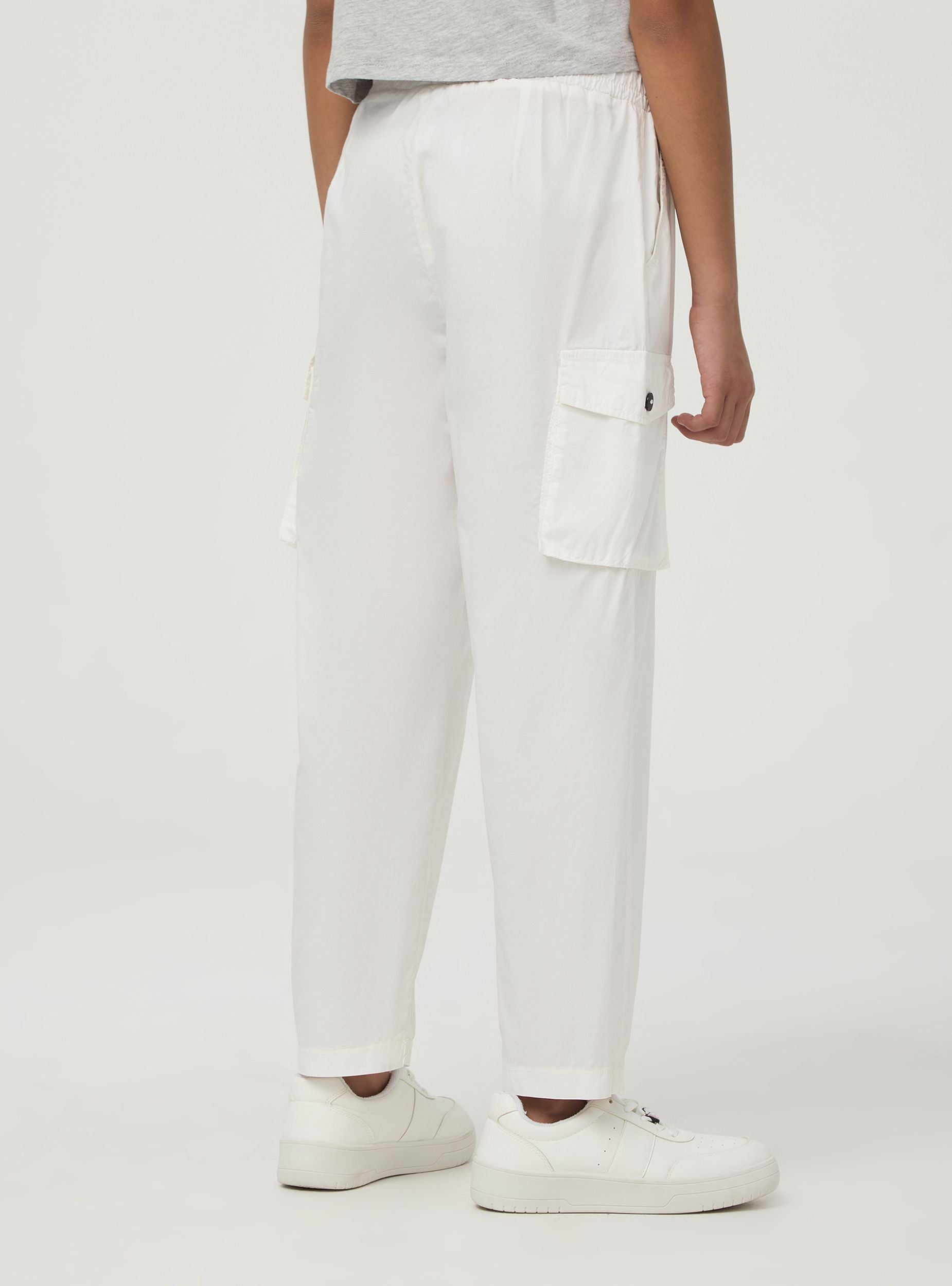 Pantaloni da bambina, modello cargo con tasconi applicati con chiusura a bottone. Tessuto a tinta unita in cotone elasticizzato. Modello con elastico in vita. Vestibilità ampia.Dettagli