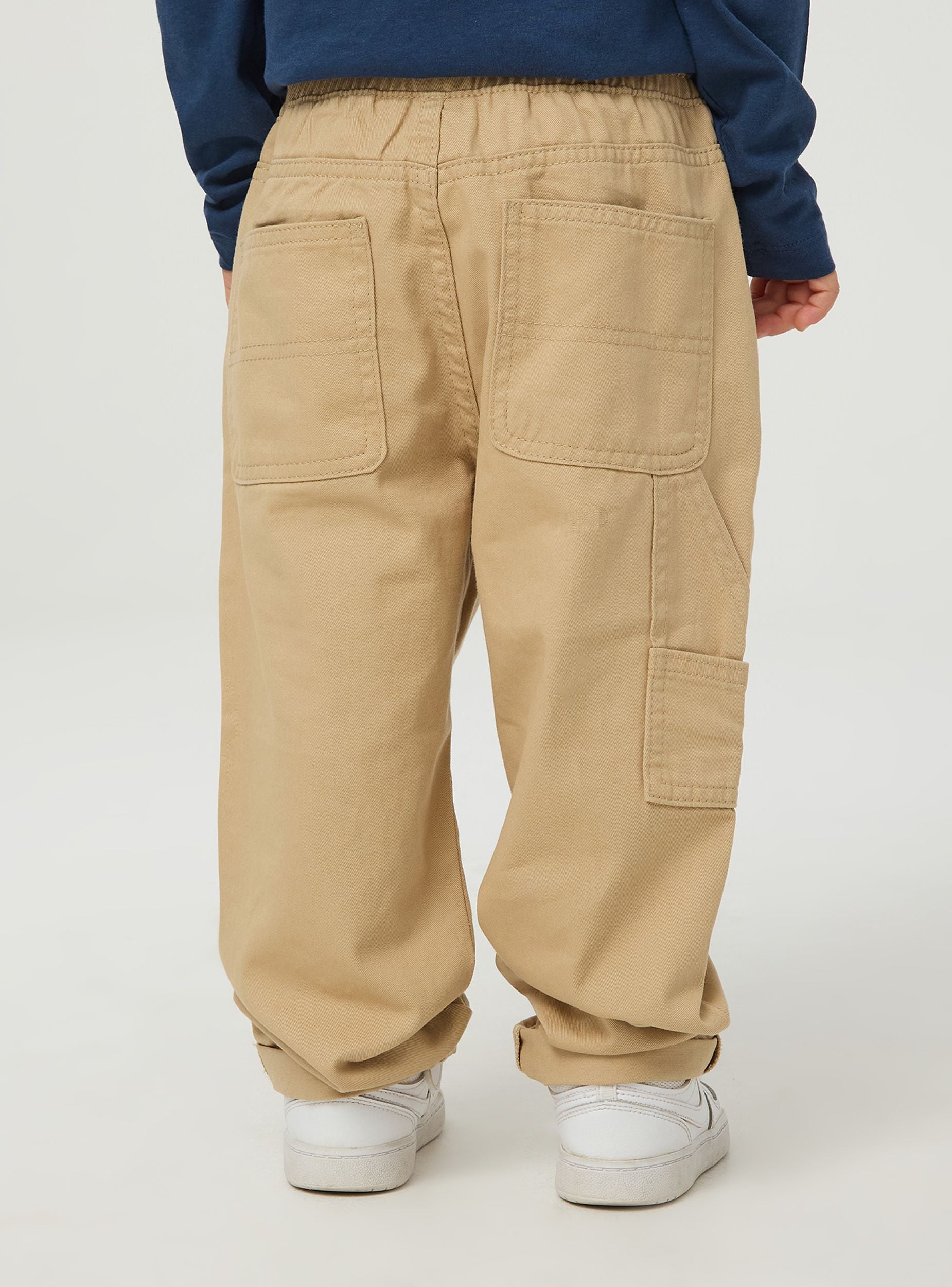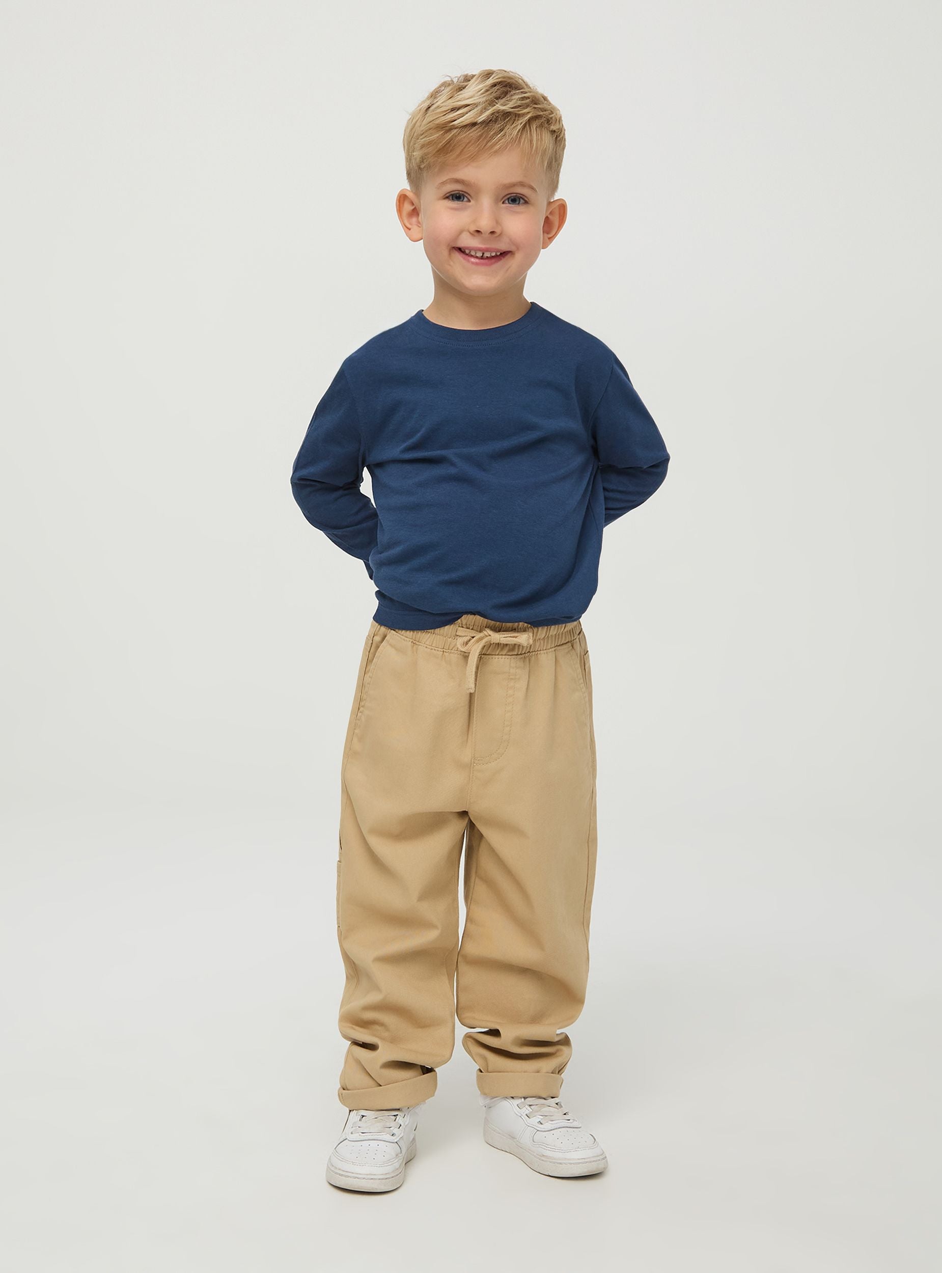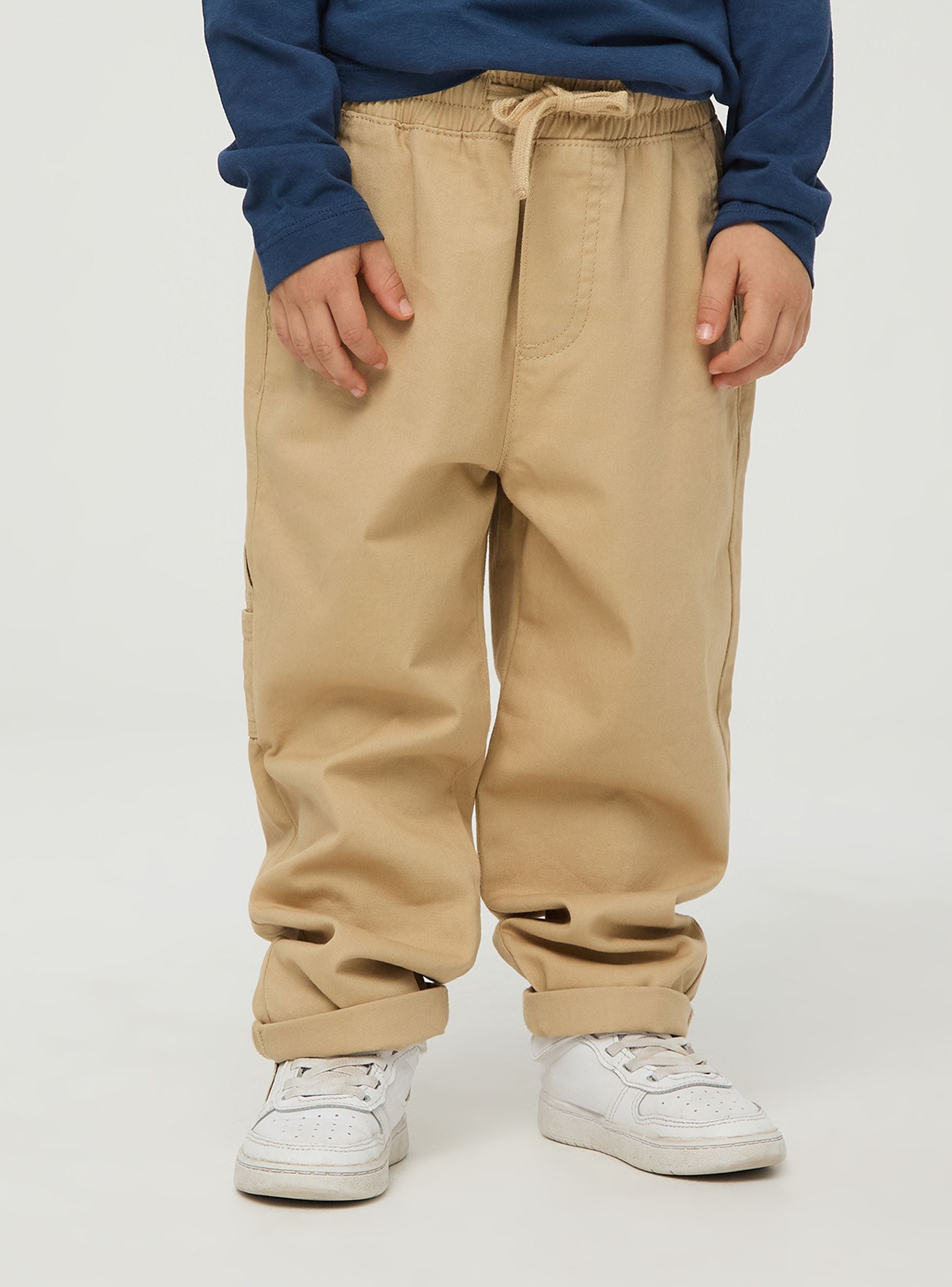 Pantalone da bimbo, modello carpenter. Realizzato in tessuto di cotone robusto e resistente, presenta una vita elasticizzata con coulisse regolabile per garantire una vestibilità comoda e sicura. Le gambe del pantalone sono dritte, con un leggero risvolto alla caviglia per un tocco di stile. Il design include due tasche laterali alla francese. Questo pantalone carpenter è perfetto per le attività quotidiane dei bambini, offrendo comfort e libertà di movimento. Ideale per giocare all'aperto, andare a scuola o partecipare ad attività sportive leggere. Può essere abbinato a una t-shirt, una felpa o una camicia casual per creare un outfit versatile e adatto a diverse occasioni.