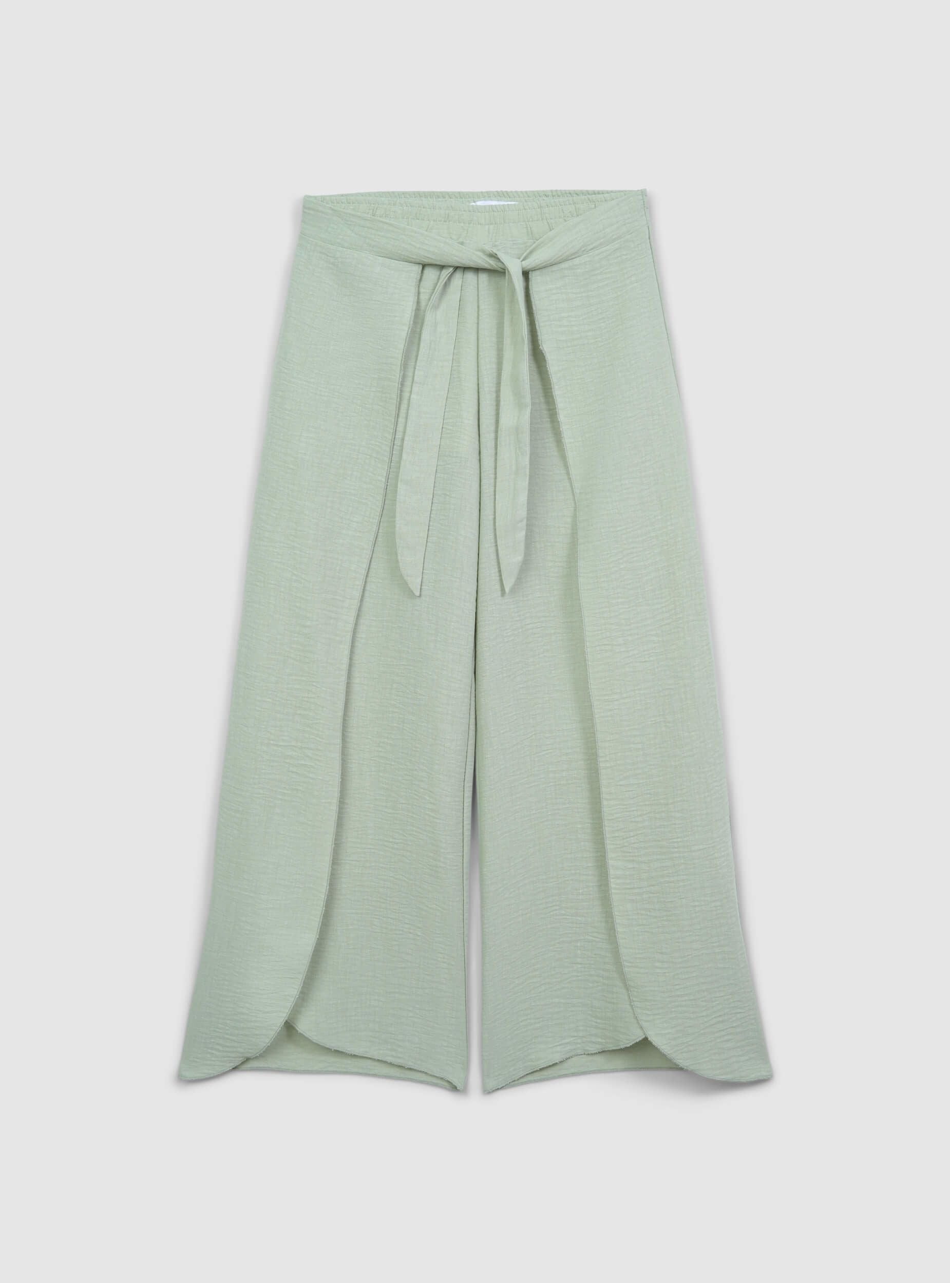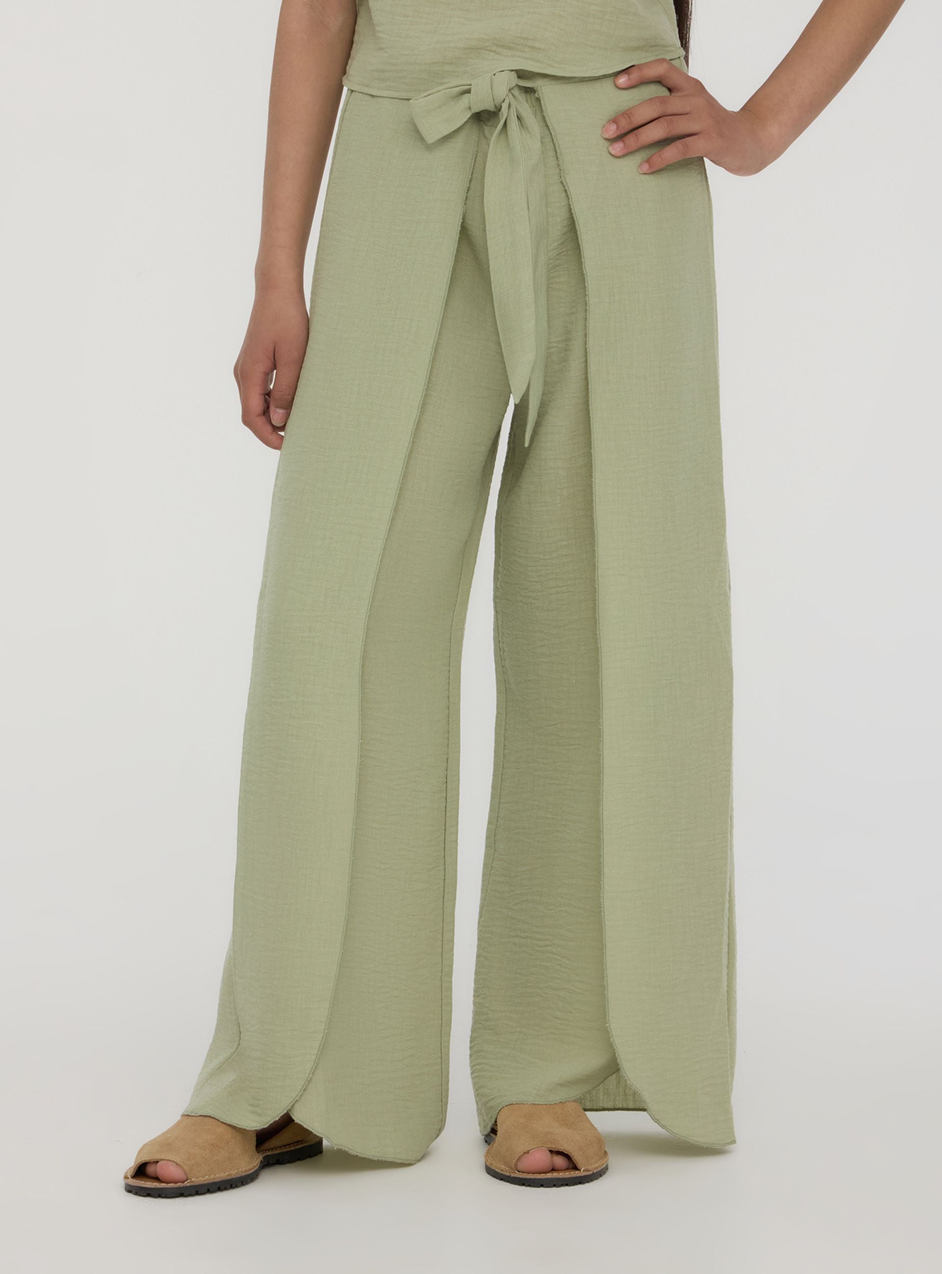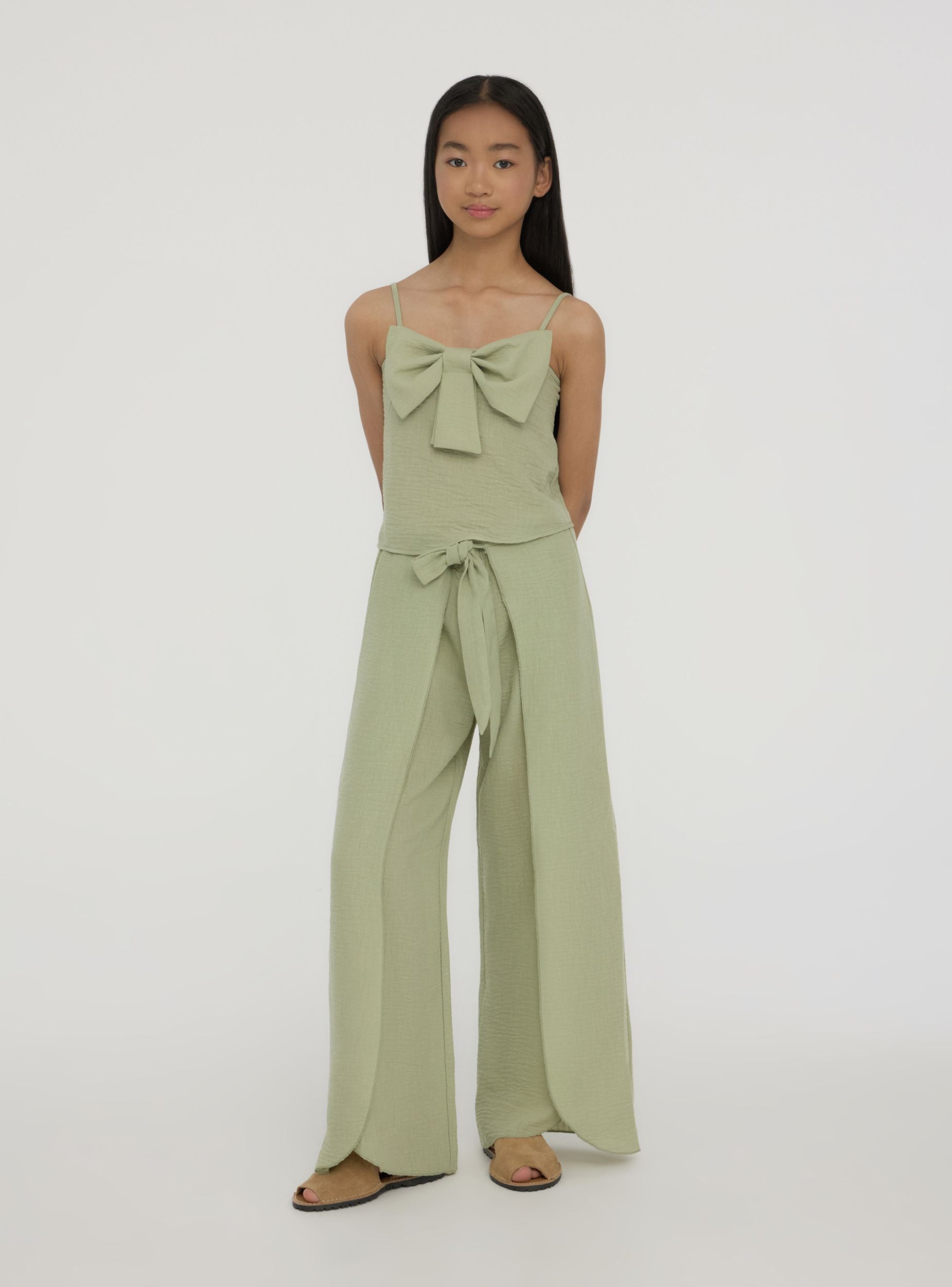 Pantaloni da bambina eleganti e comodi, ideali per cerimonie, feste o occasioni speciali. Il design a tinta unita li rende versatili e facili da abbinare a bluse, top o giacche leggere. La gamba lunga offre una vestibilità fluida e raffinata, mentre la chiusura con fiocco frontale aggiunge un tocco di stile romantico e raffinato.Dettagli