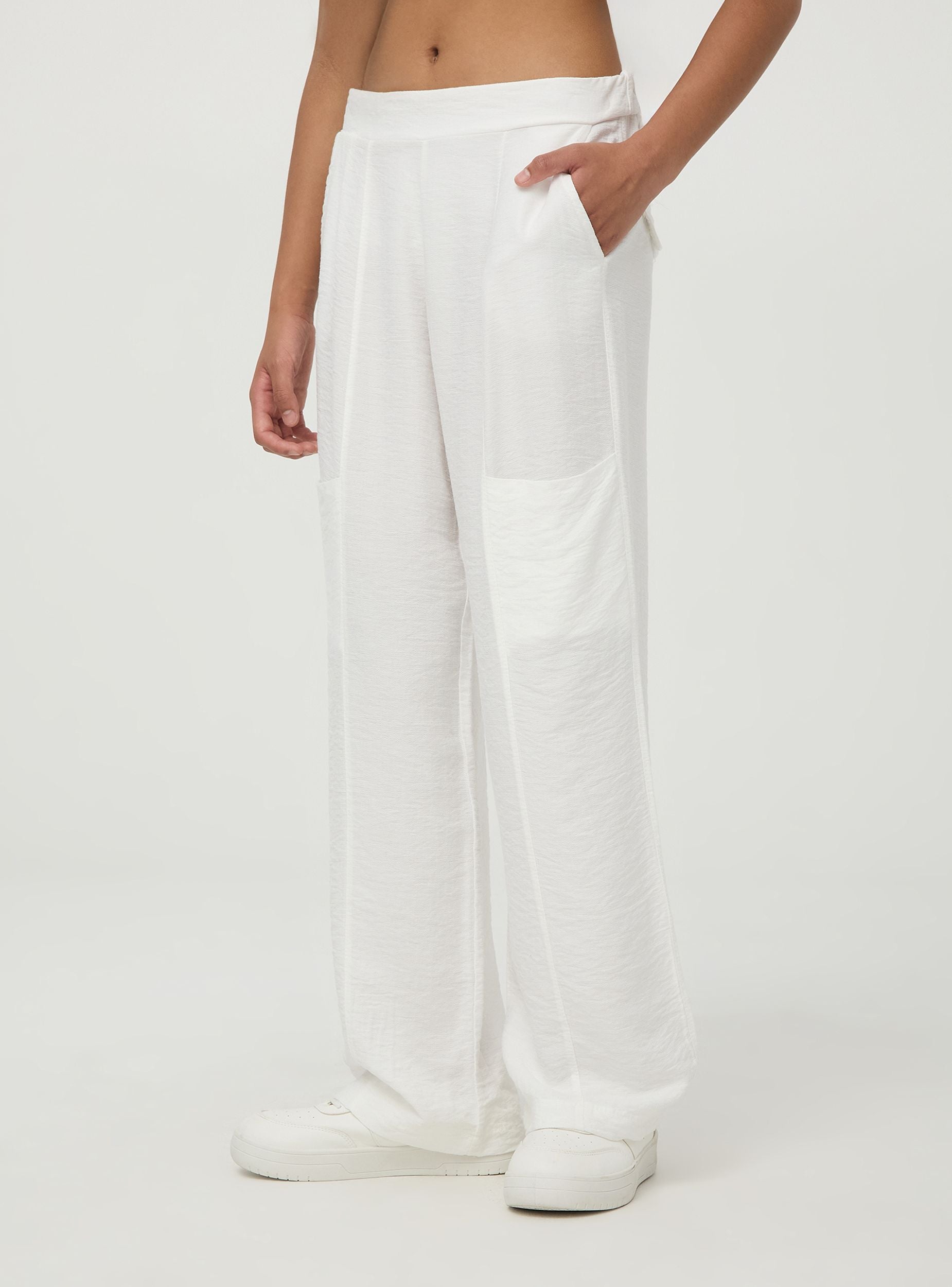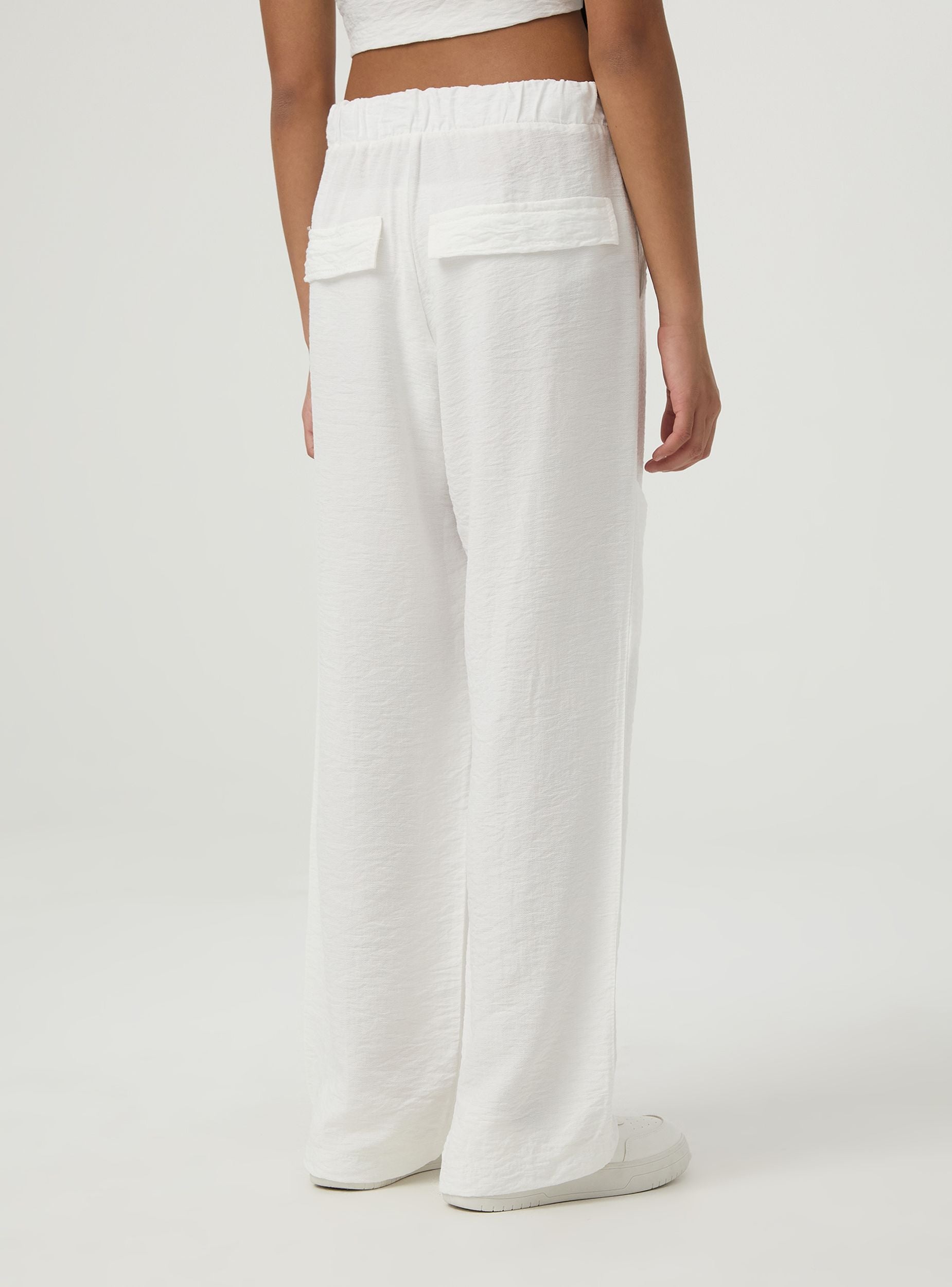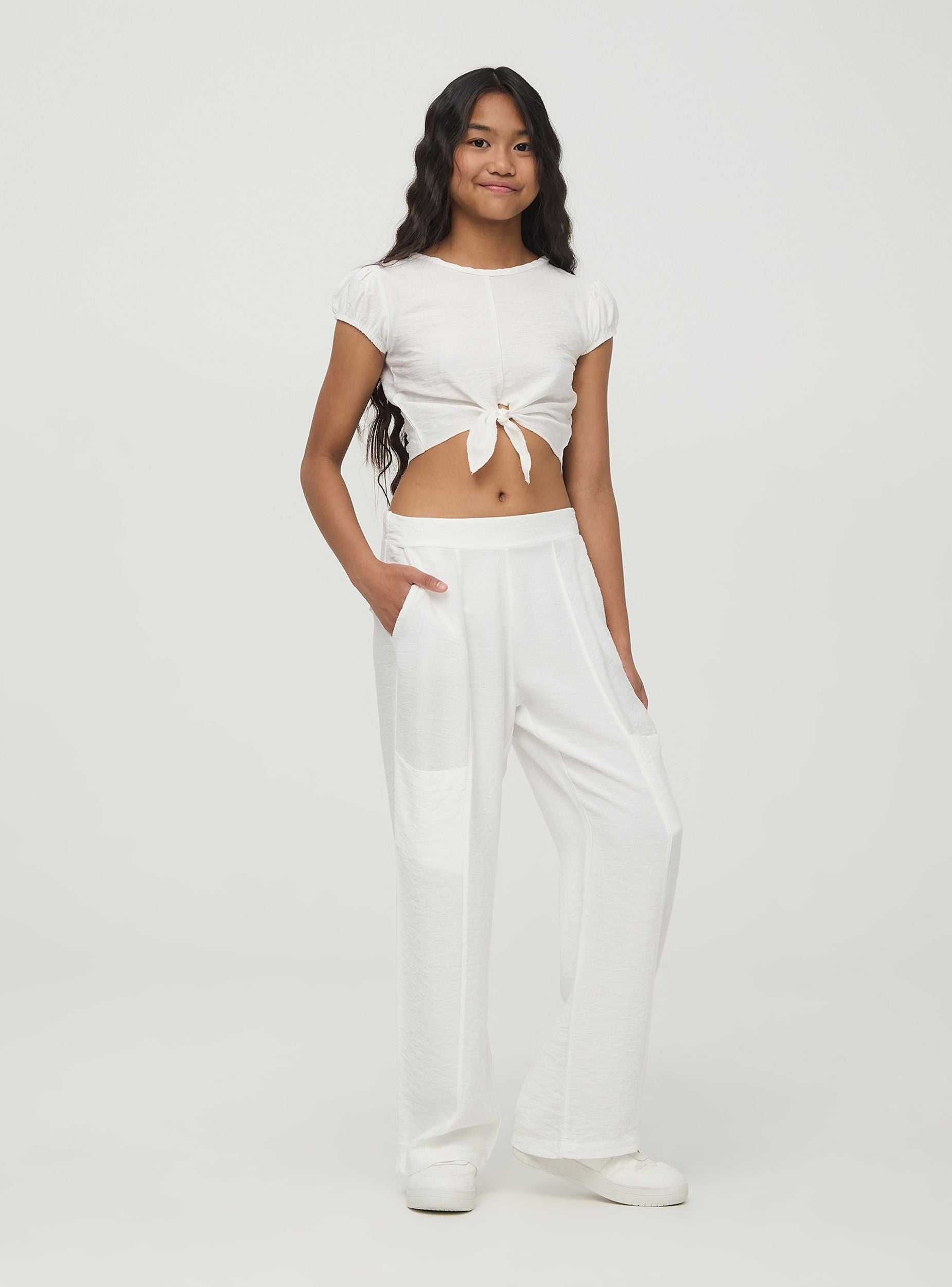 Pantaloni lunghi da bambina in tessuto a tinta unita con tasche laterali. Perfetto per completare gli outfit estivi. Vestibilità regular.Dettagli