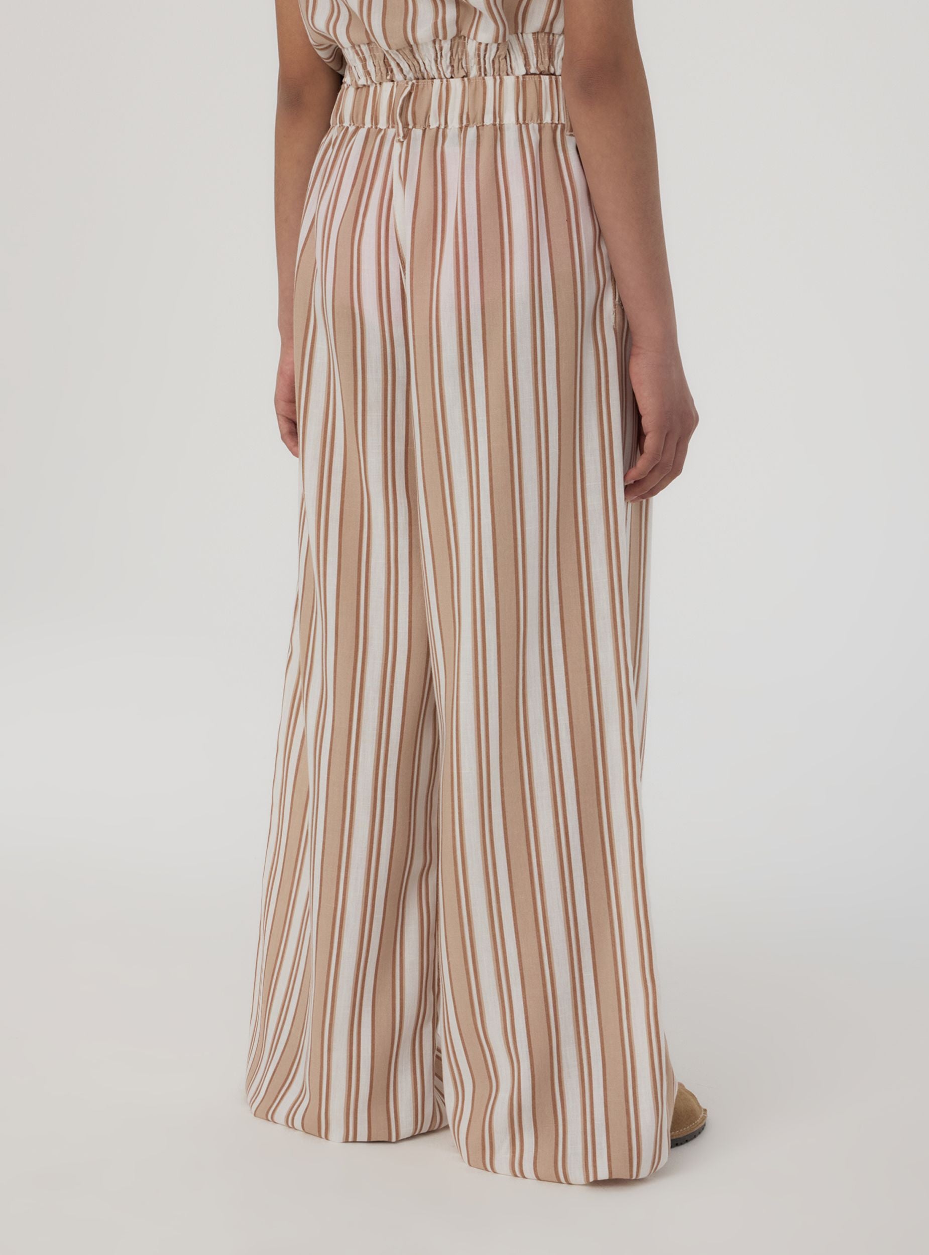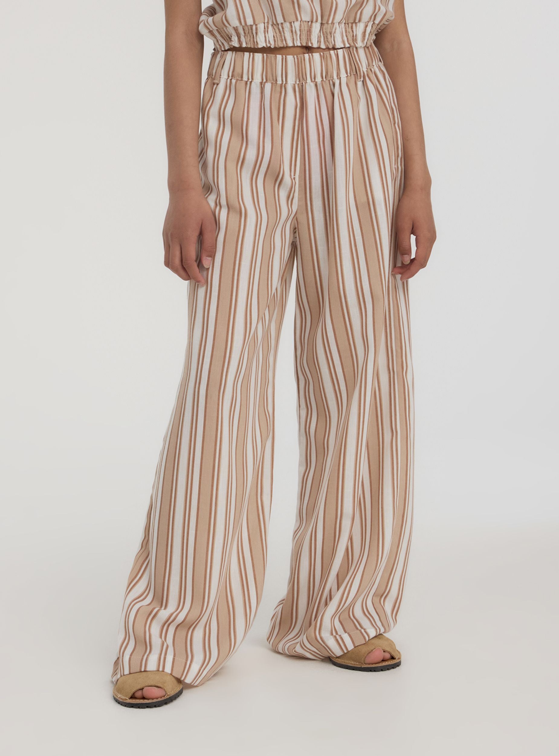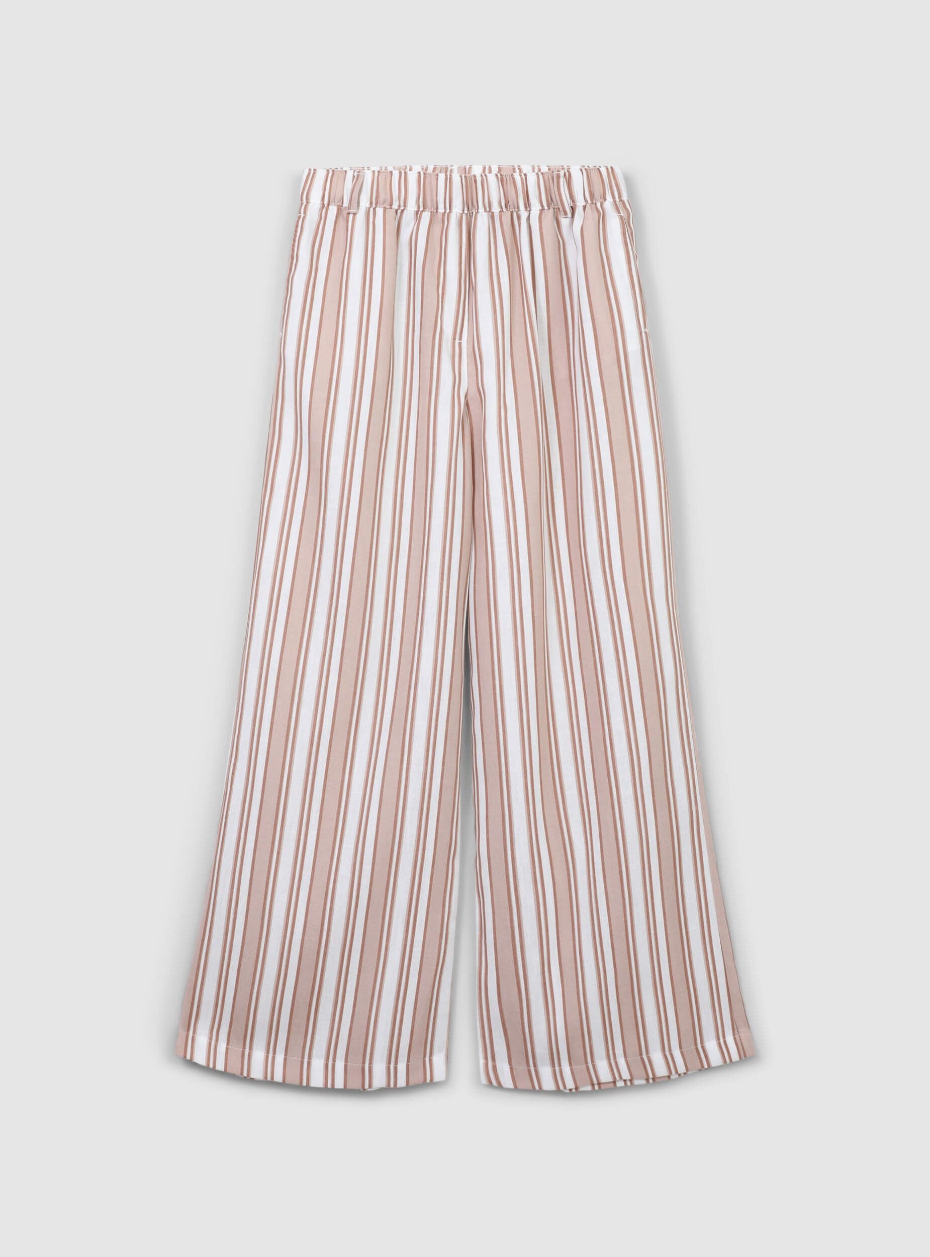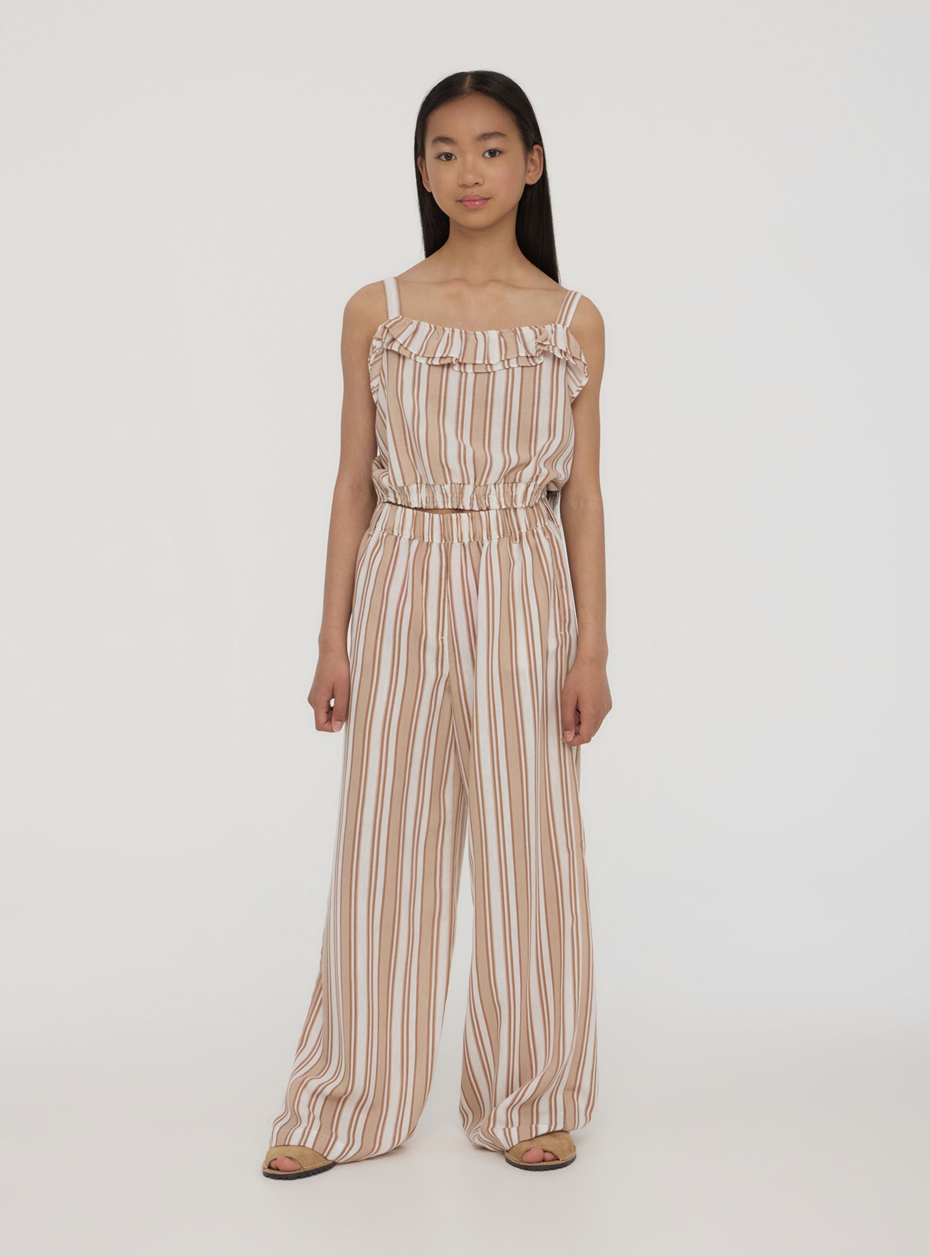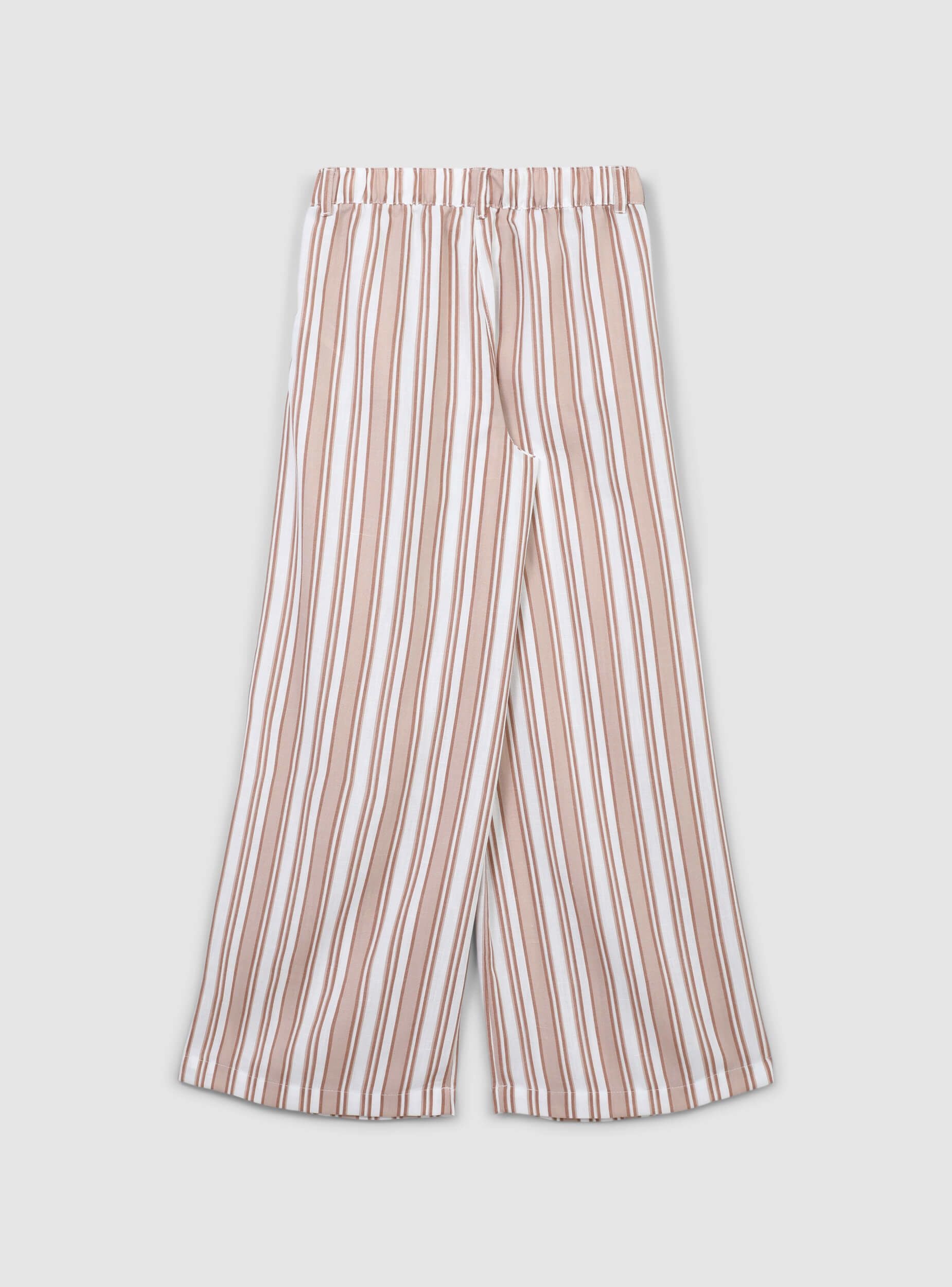Pantaloni da bambina, modello paperbag, perfetti per il tempo libero, la scuola o passeggiate in città. Il design con fantasia a righe verticali dona un tocco vivace e slancia la figura. Dotati di vita elasticizzata, possono essere abbinati facilmente a t-shirt, bluse o cardigan per look casual o più ricercati.